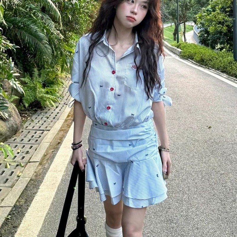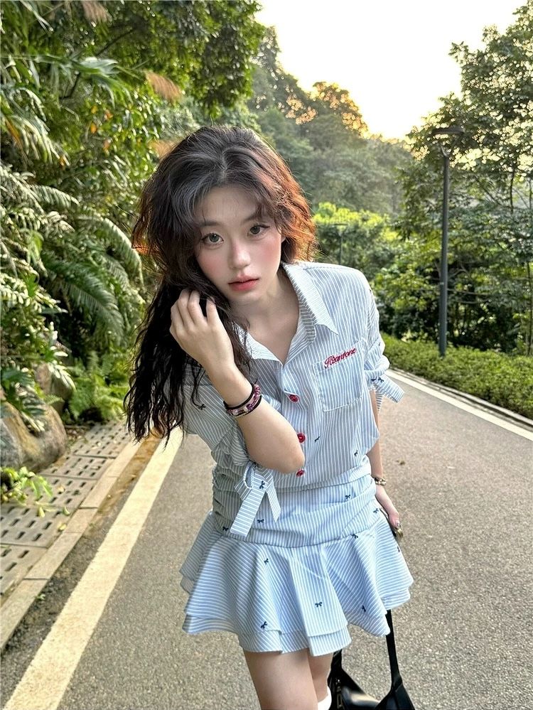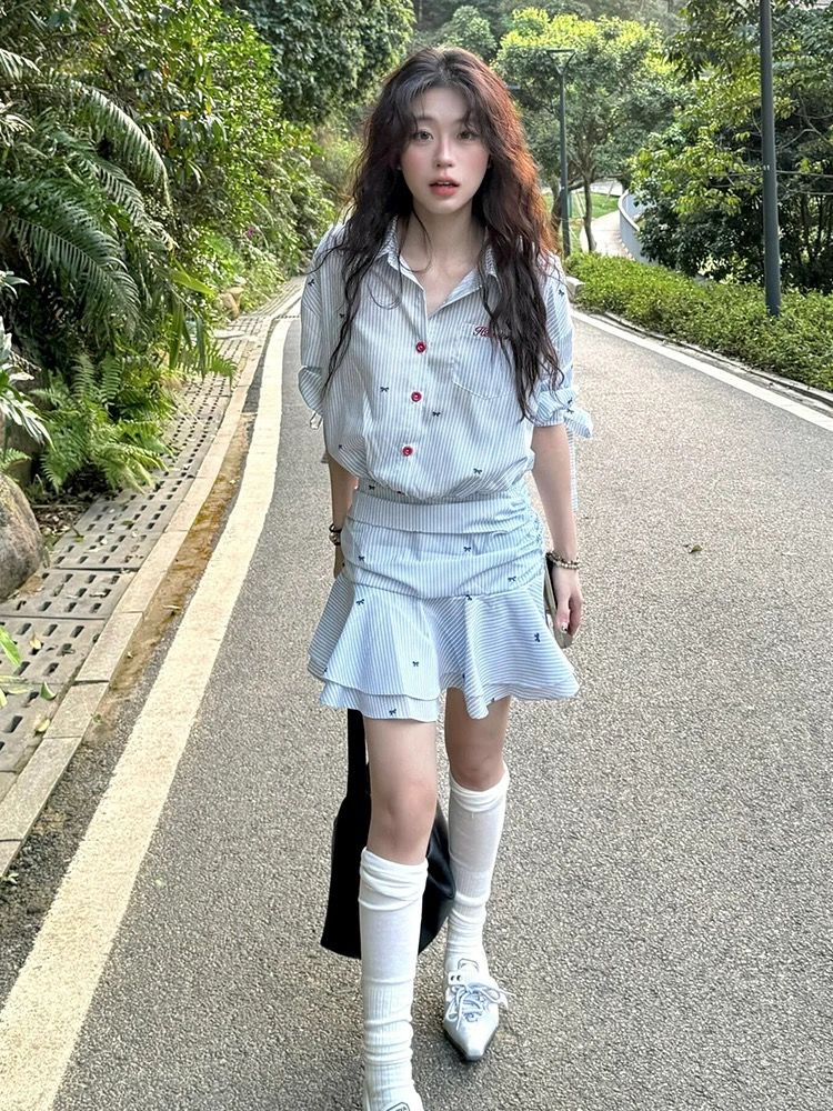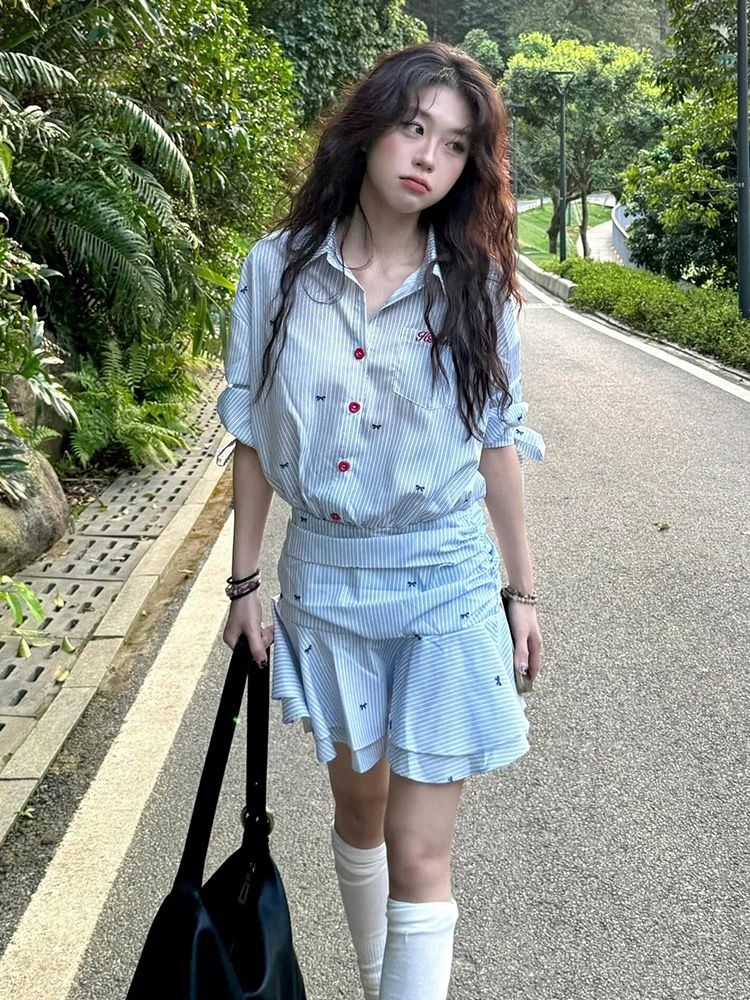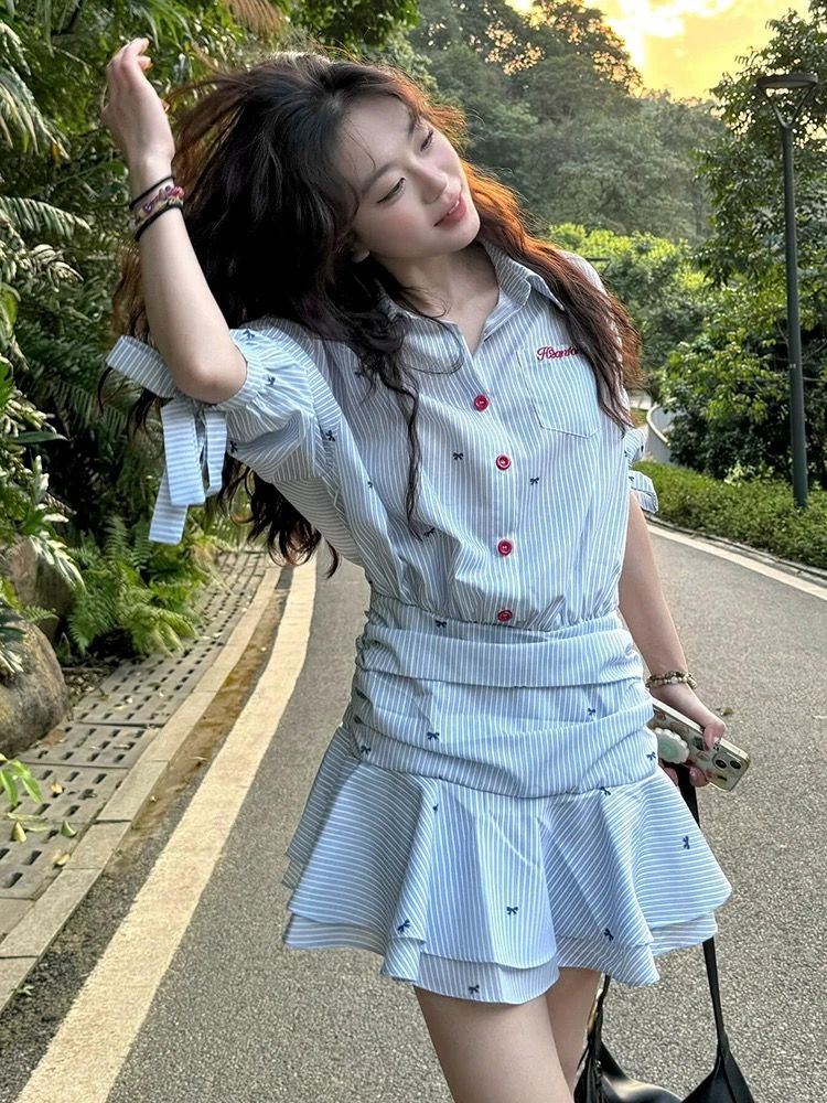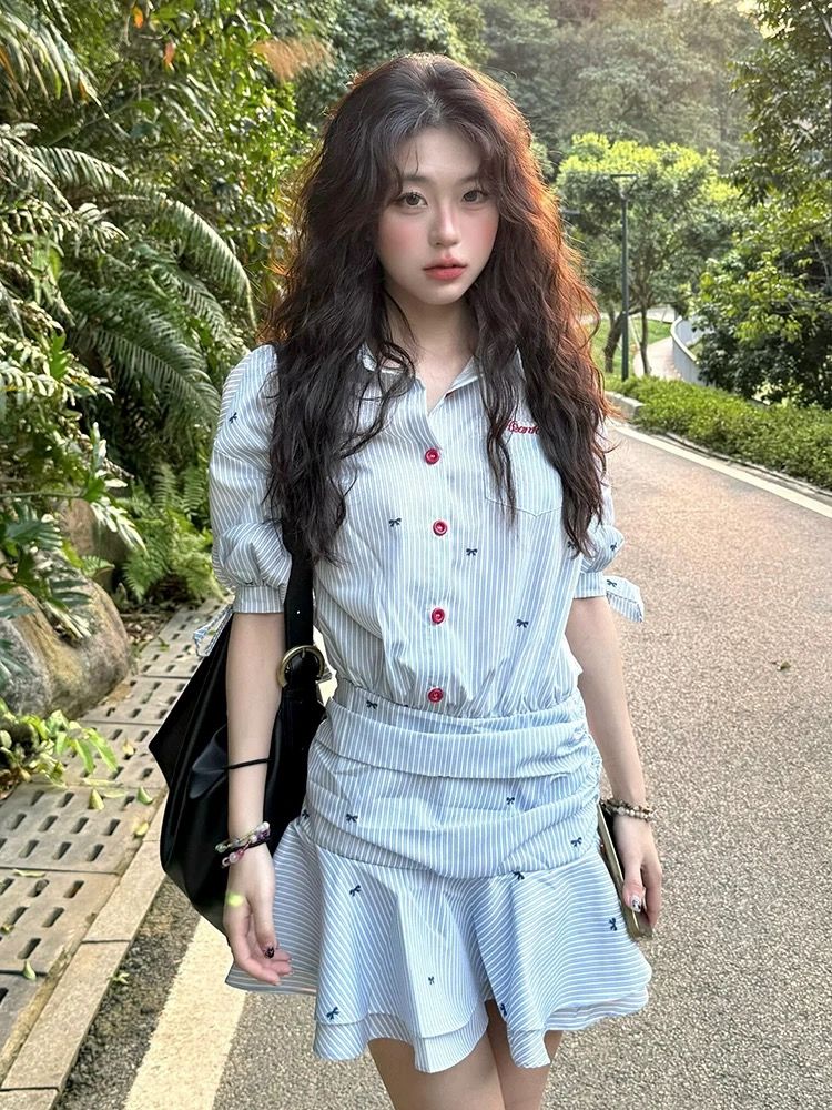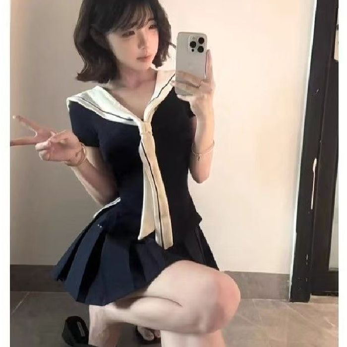 해군 칼라 맨위 학원 스타일 세트 여성 여름 디자인 센스 꼬집기 허리 반팔 티셔츠 하이웨이스트 슬림해 보이는 플리츠 미니 스커트