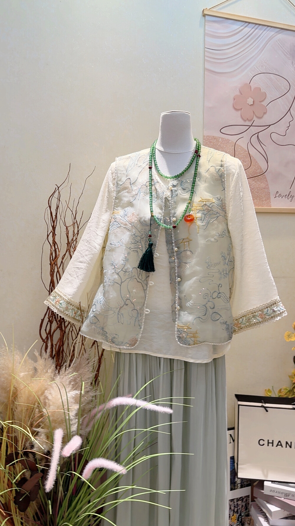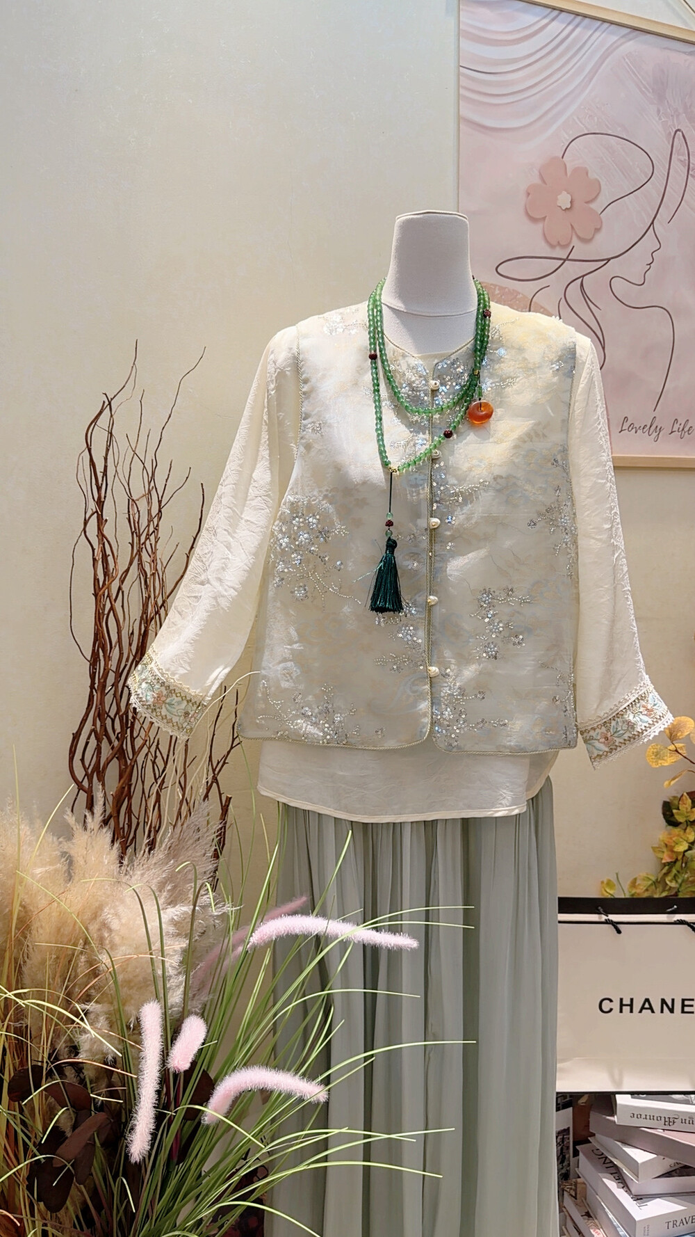 녹색 새로운 중식 무거운 작업 자수 베스트 봄 여름 얇은 스타일 빛 럭셔리 연령 감소 외국 가스 고급 센스 국풍 조끼