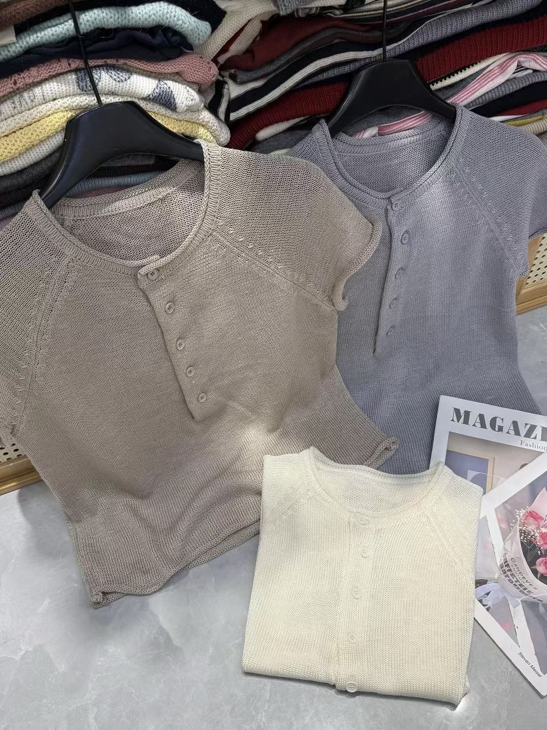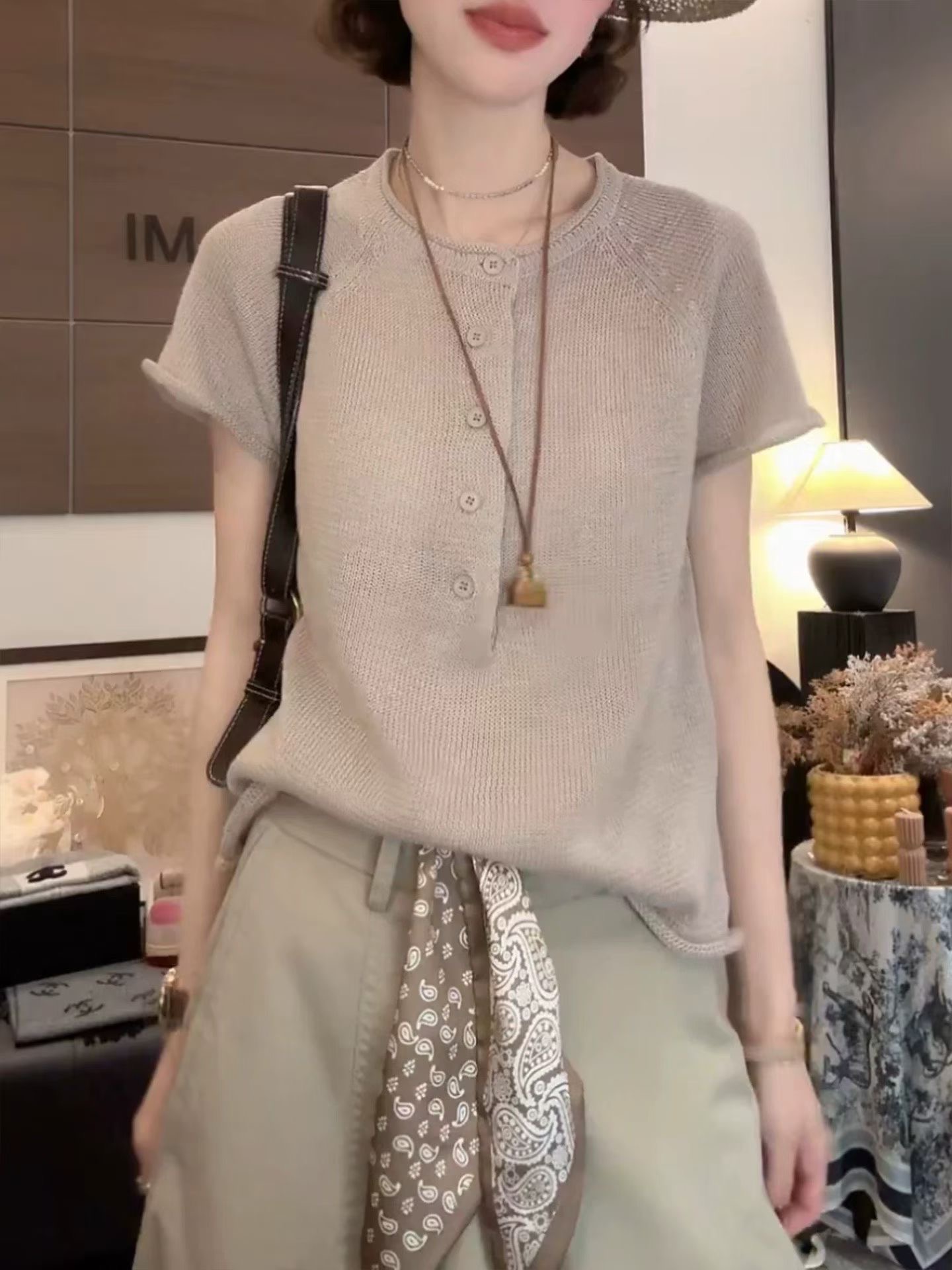 한 부서 착용 가져 가라. 반팔 니트 스웨터 여성 2026 새로운 여름 얇은 스타일 작은 셔츠 패션 슬림해 보이는 표지 고기 품격 맨위
