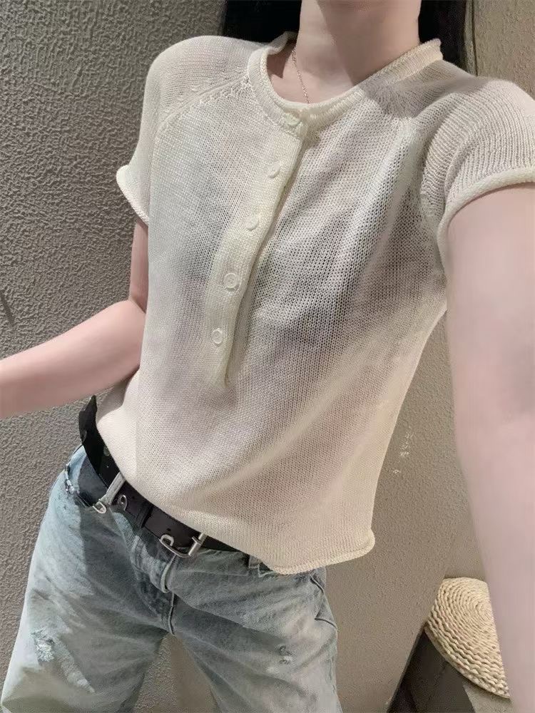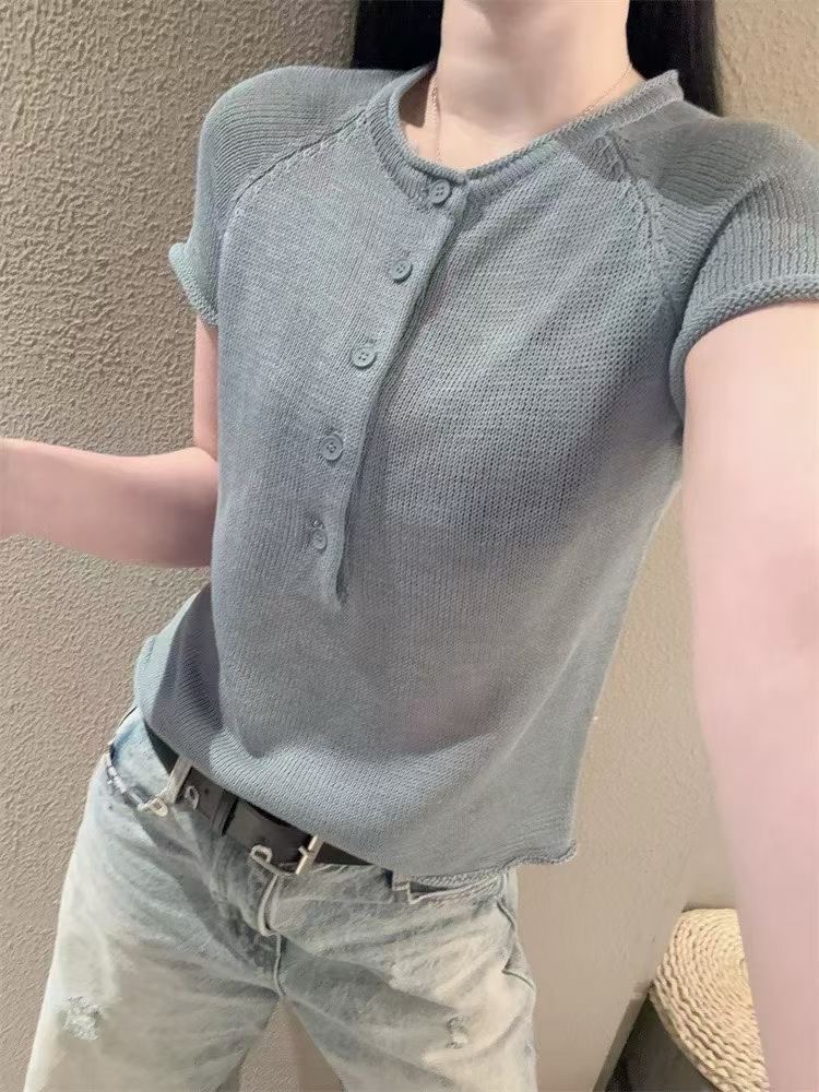 grace li 과일 과립 여름 새로운 한 스타일 미니멀리즘 라운드 넥 품격 하프 단추 몸매 가꾸기 맨위 여성 니트 스웨터