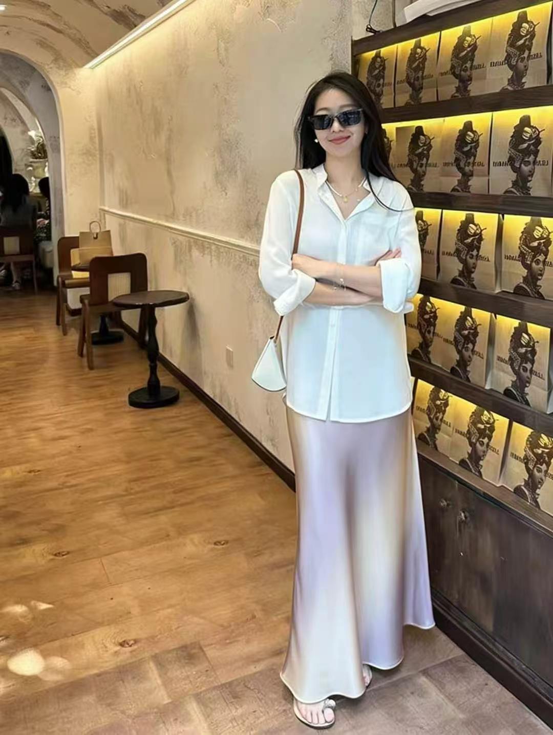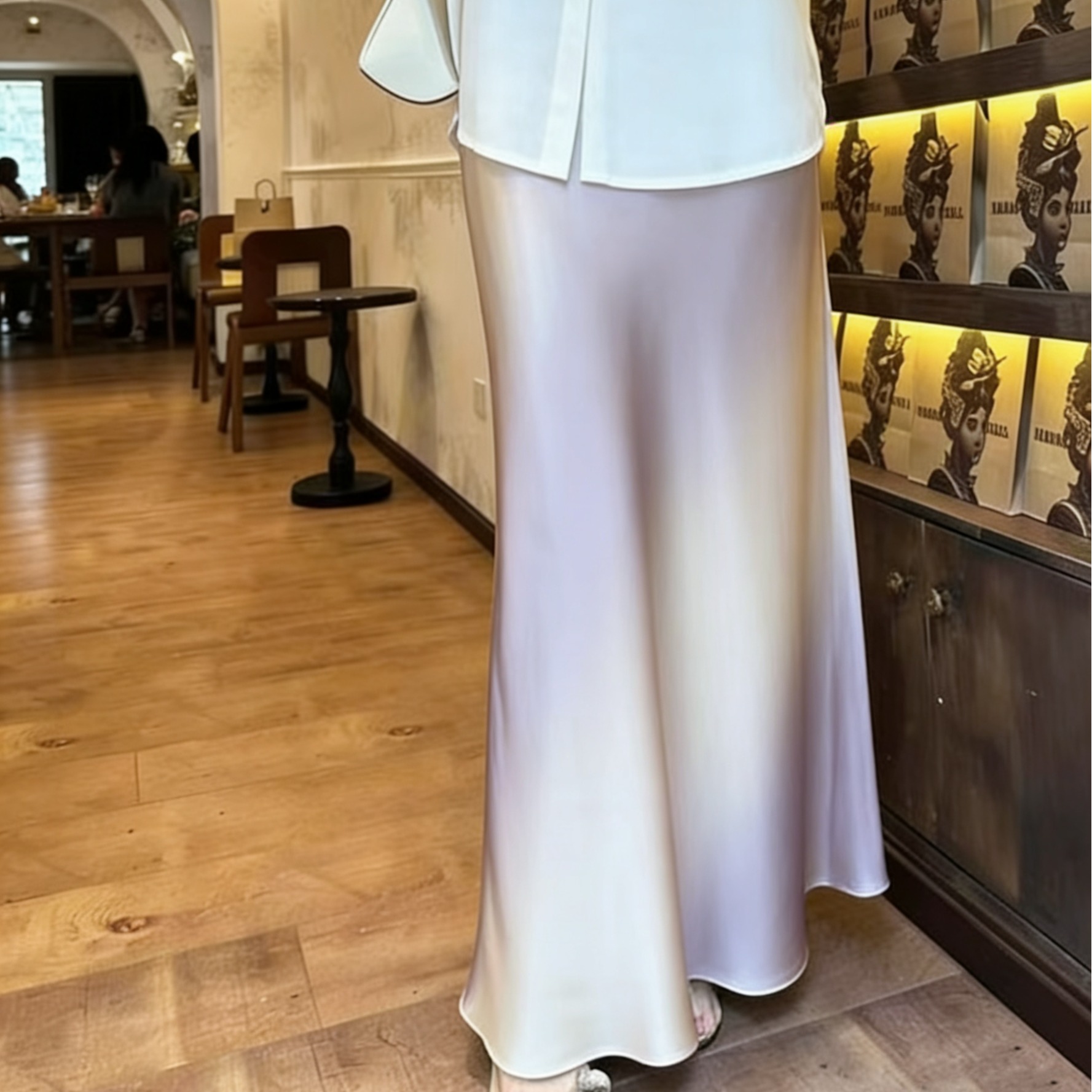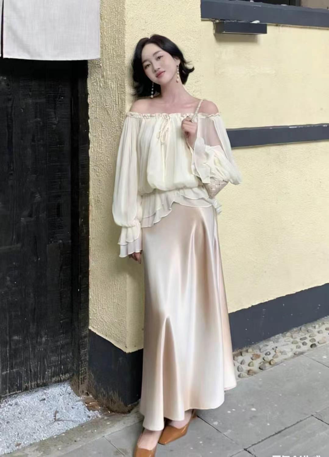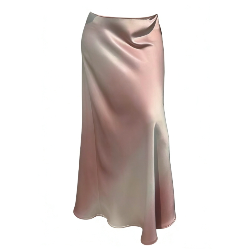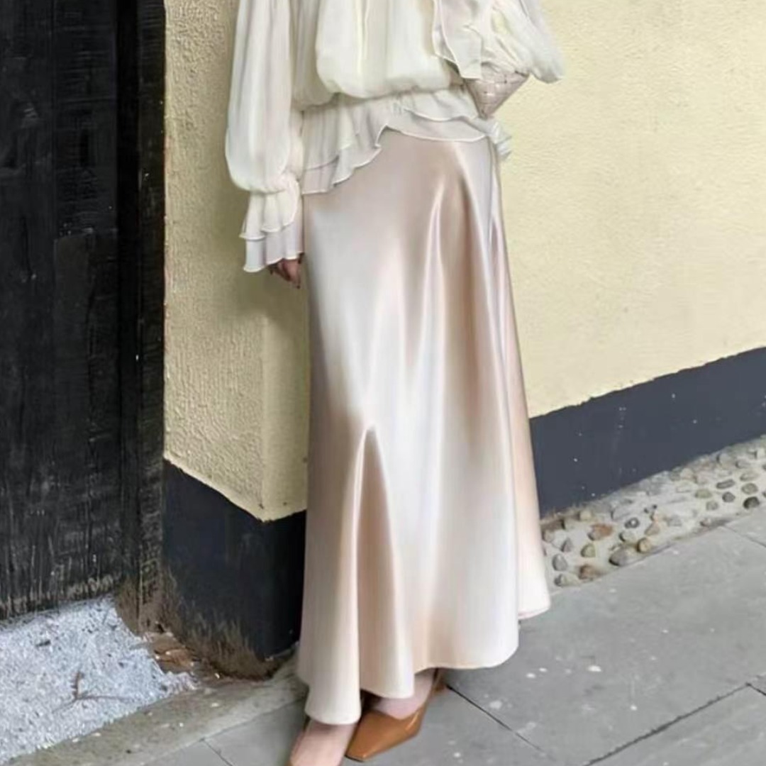 26 봄 여름 켜기 새로운 우아함 품격 새틴 점차적으로 숱이 플래시 광택 도루 가을 센스 슬림해 보이는 한 마디 중간 길이 반신 스커트 여성