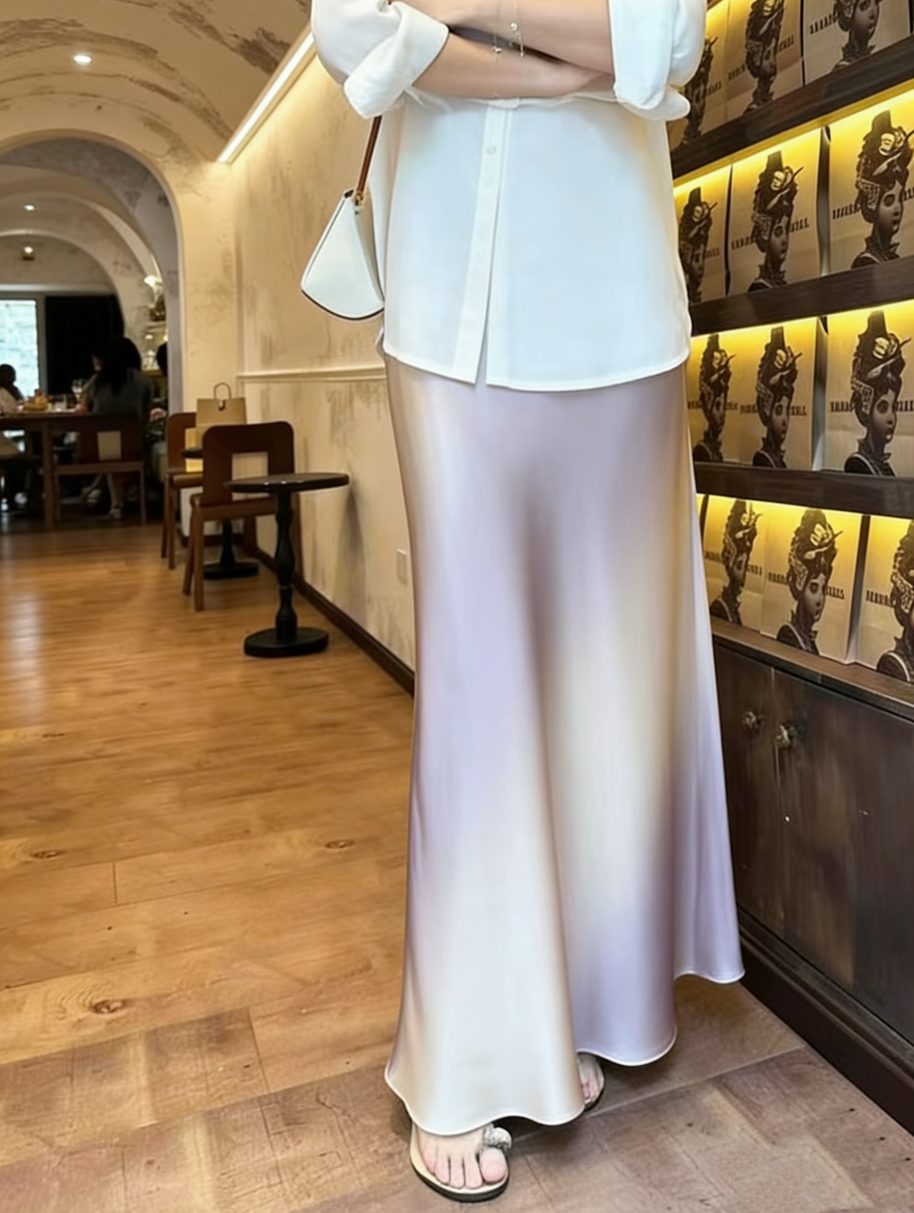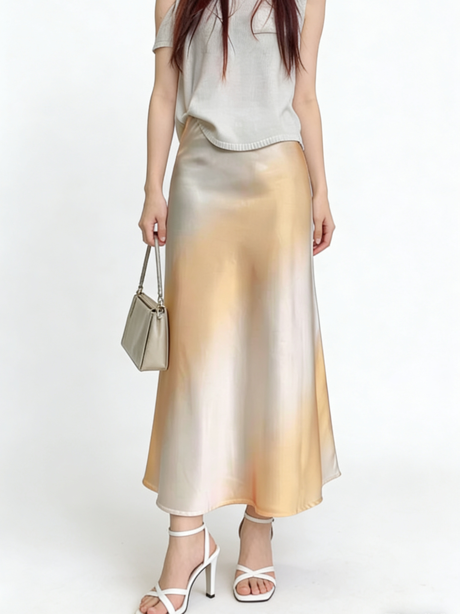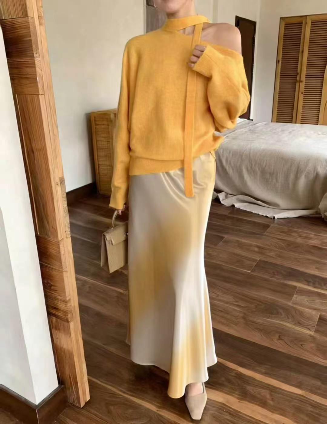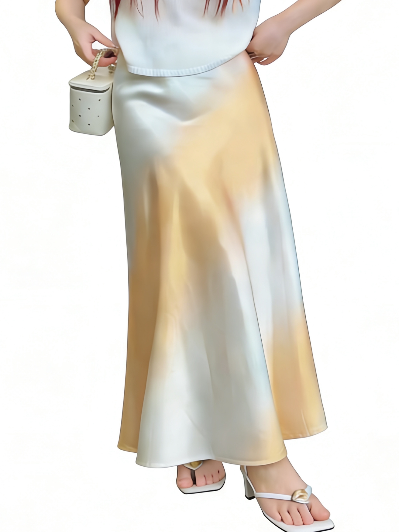 26 봄 여름 켜기 새로운 우아함 품격 새틴 점차적으로 숱이 플래시 광택 도루 가을 센스 슬림해 보이는 한 마디 중간 길이 반신 스커트 여성