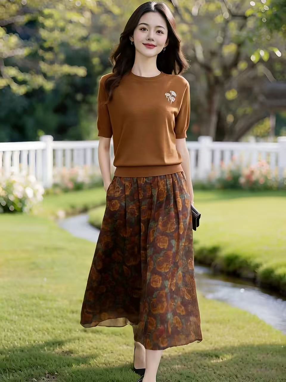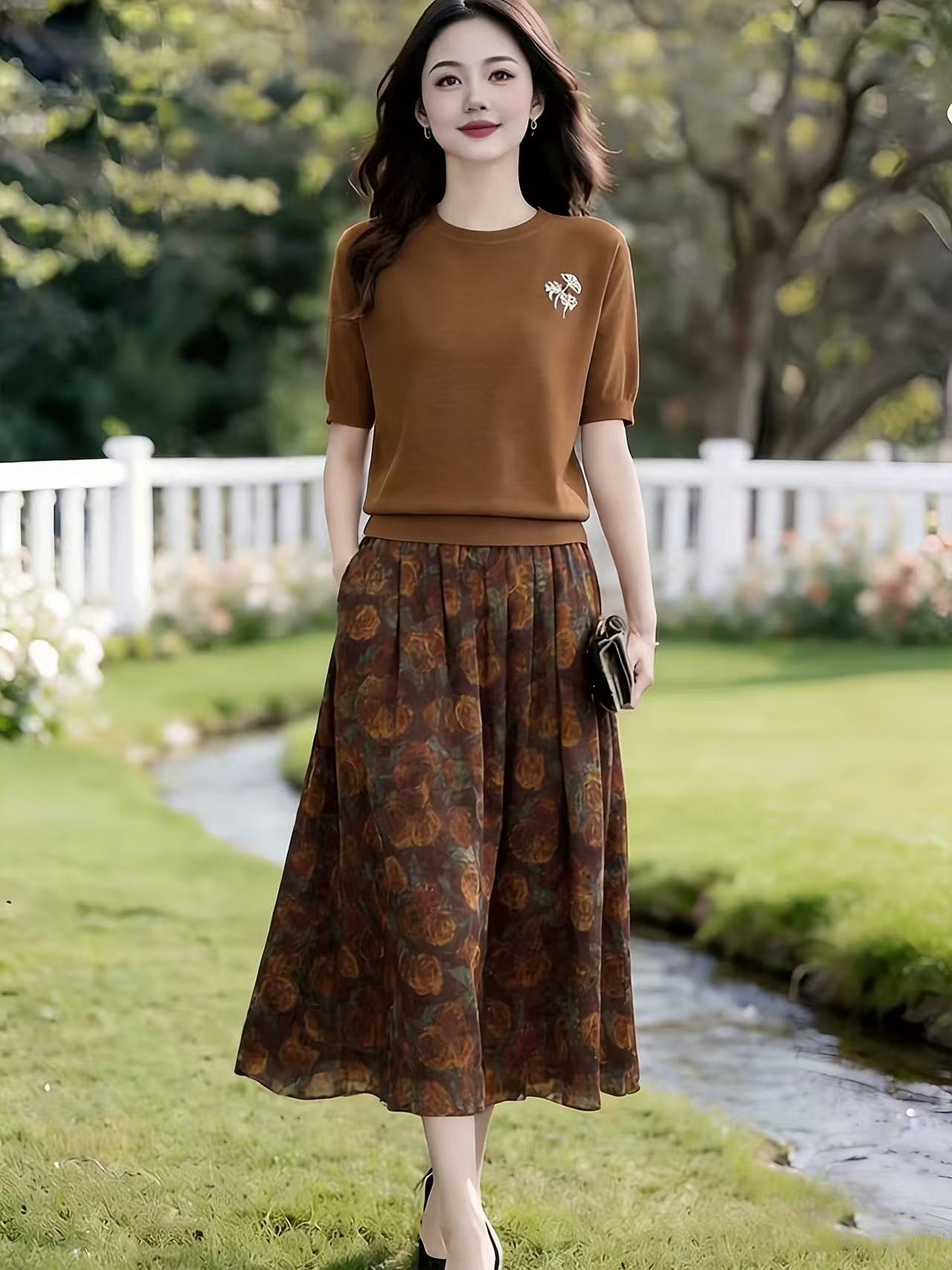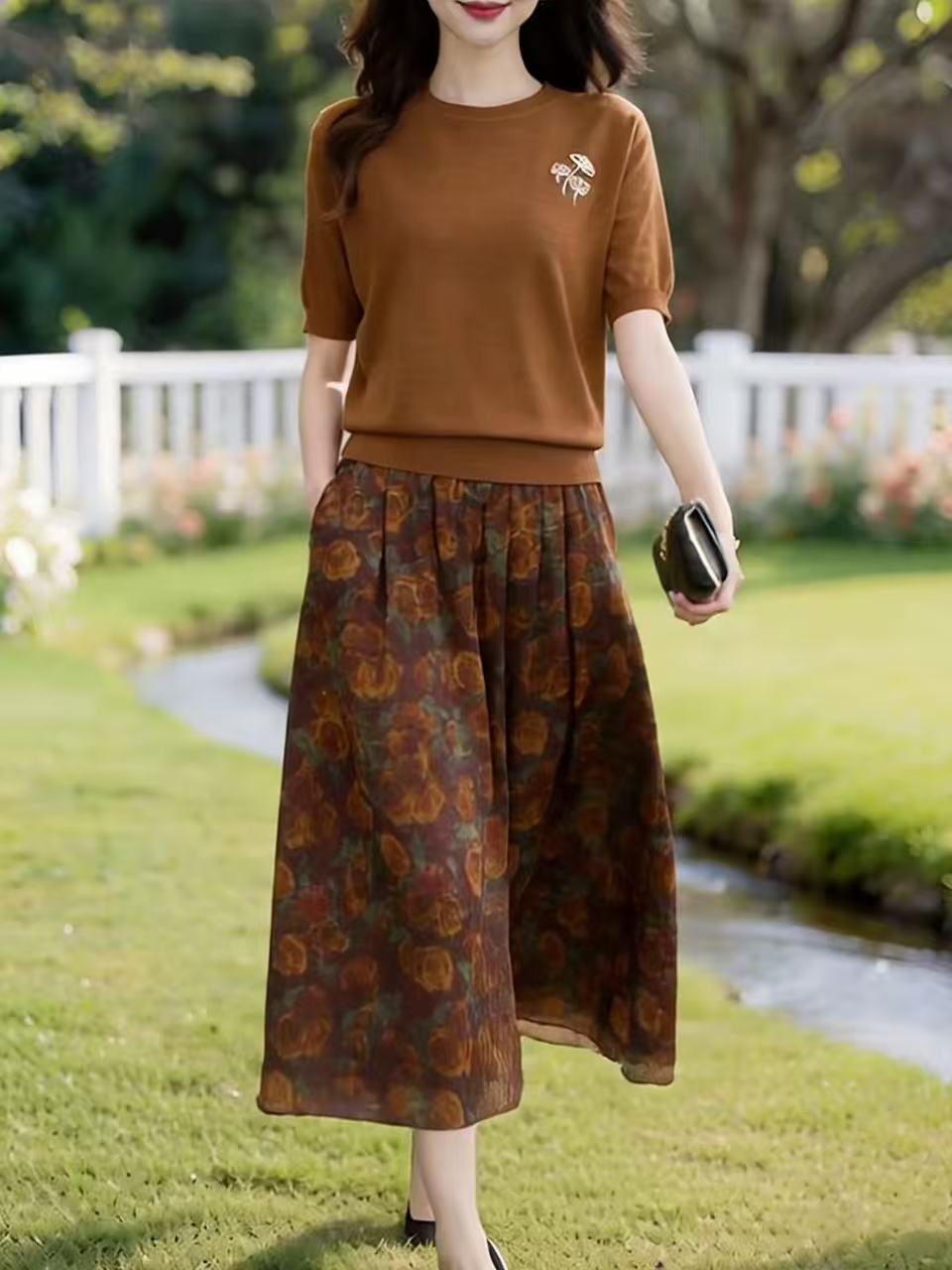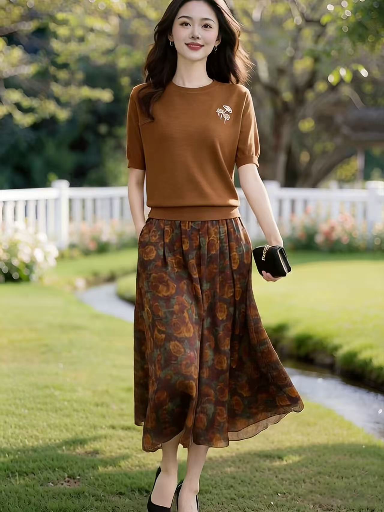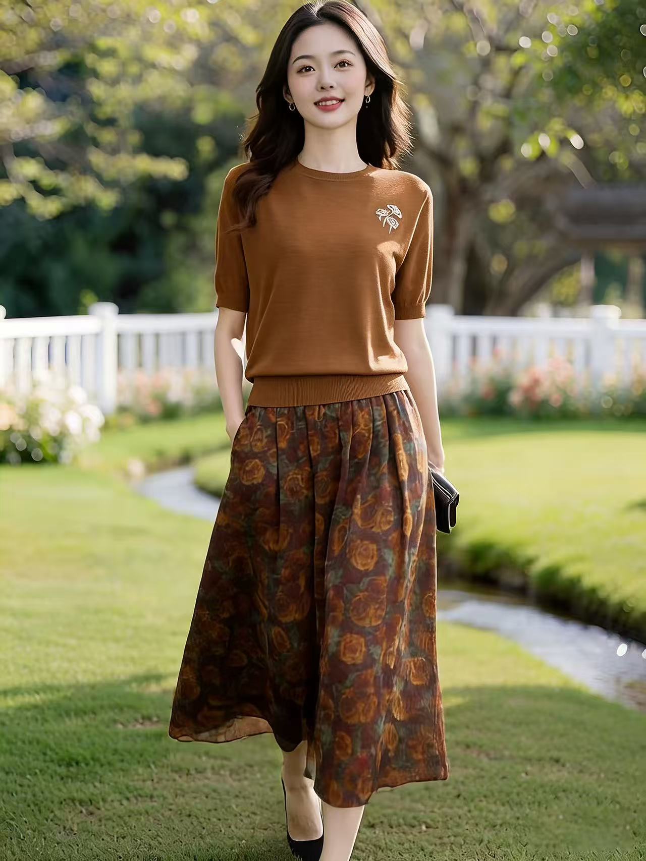 2026 문예 국풍 맨위 꽃무늬 반 스커트 품격 세트 여름 새로운