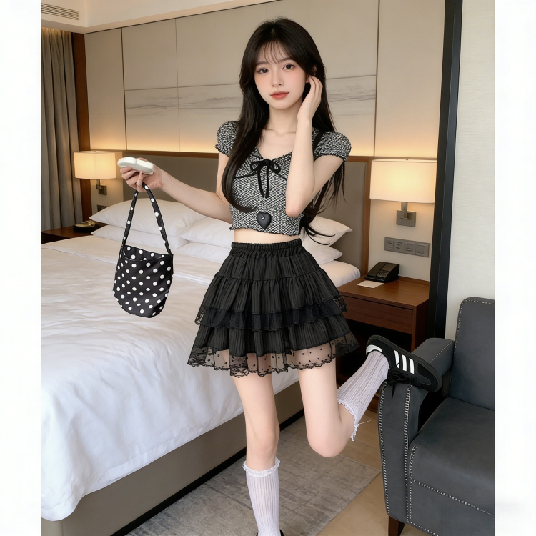 실사 지방 mm 빅 사이즈 프랑스식 바람 퍼프 케이크 드레스 여성 여름 프릴 미니 스커트 하이웨이스트 한 마디 레이스 반신 스커트