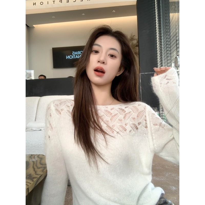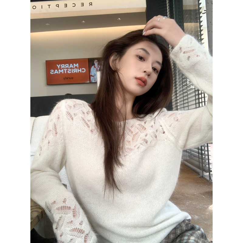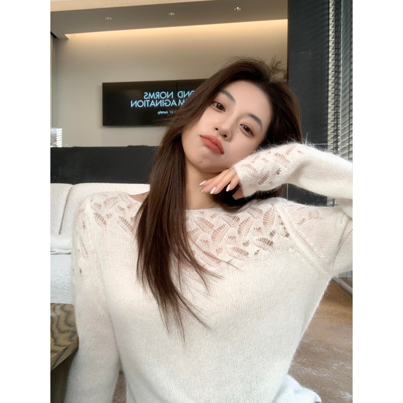 정가 재고 있음 미니멀리즘 바람 화이트 홀로우 아웃 무늬 니트 스웨터 여자 2025 가을 겨울 새로운 품격 긴팔 맨위