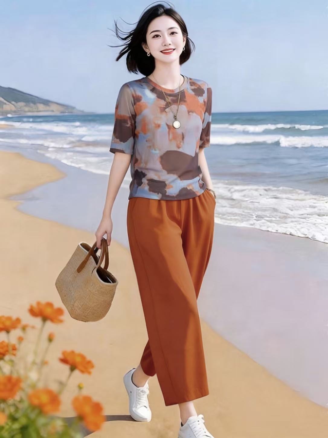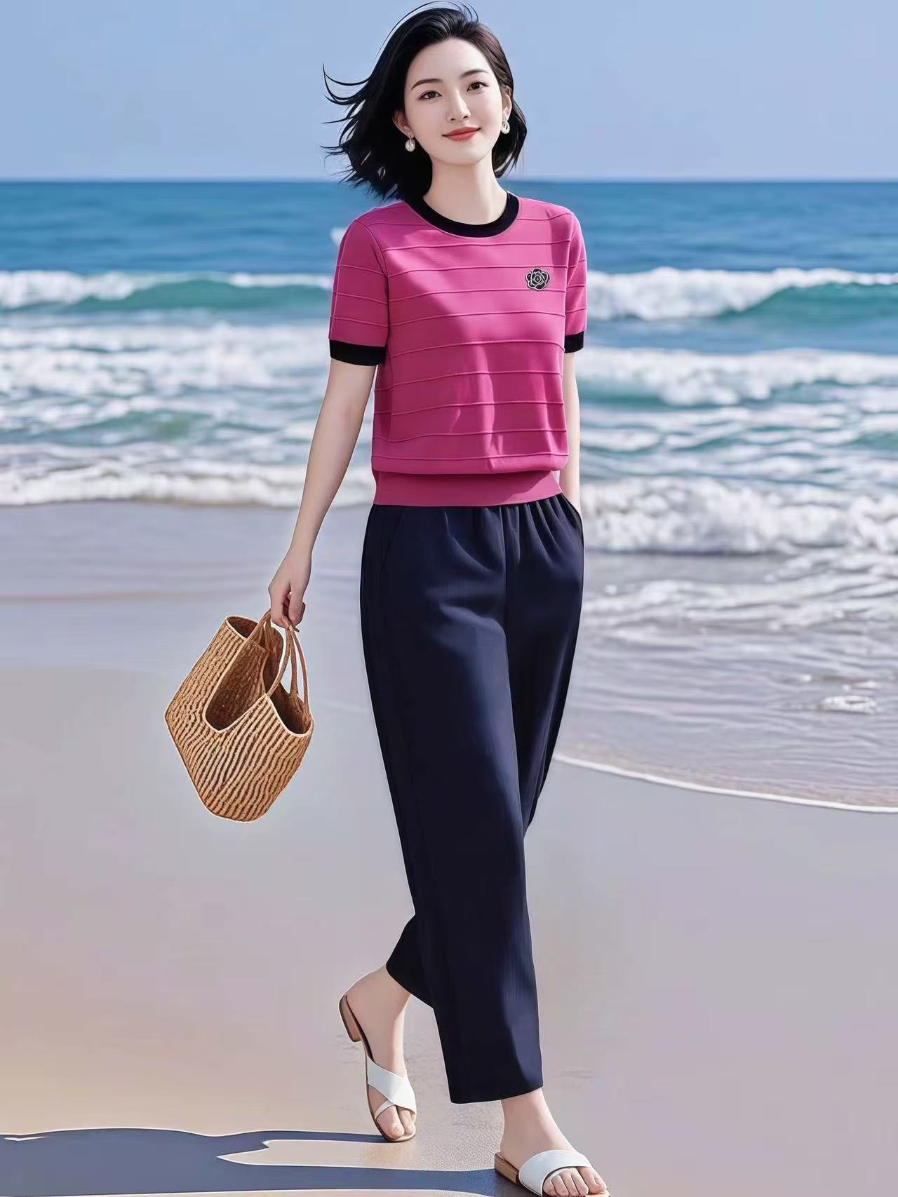 배색 니트 스웨터 허리밴드 캐주얼 바지 세트 여름 새로운