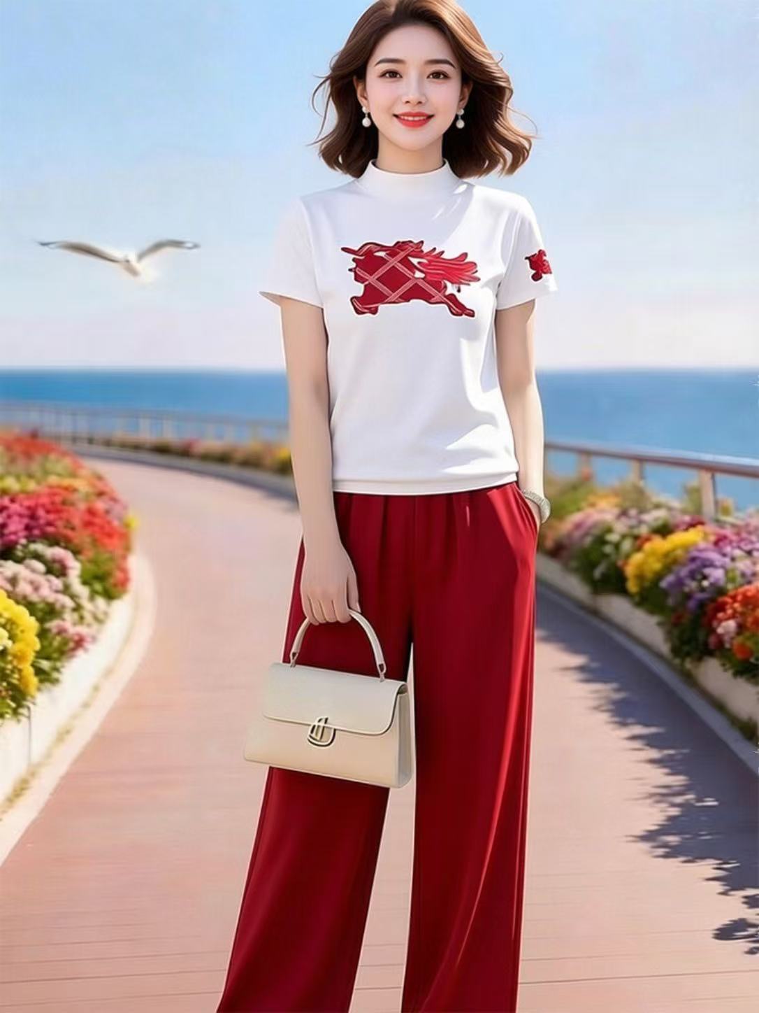 여름 색상 라스베리 빨간색 프린트 셔츠 허리밴드 하렘 바지 세트