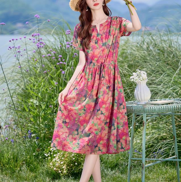 레트로 프린트 면 린넨 반팔 여성 드레스 2026 여름 새로운 허리 수축 슬림해 보이는 외국 가스 캐주얼 품격 꽃무늬 치마