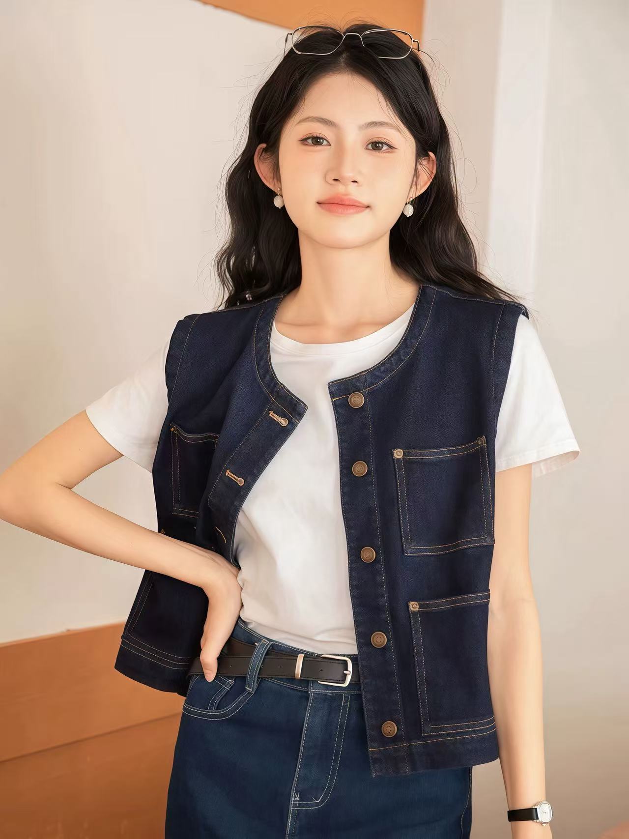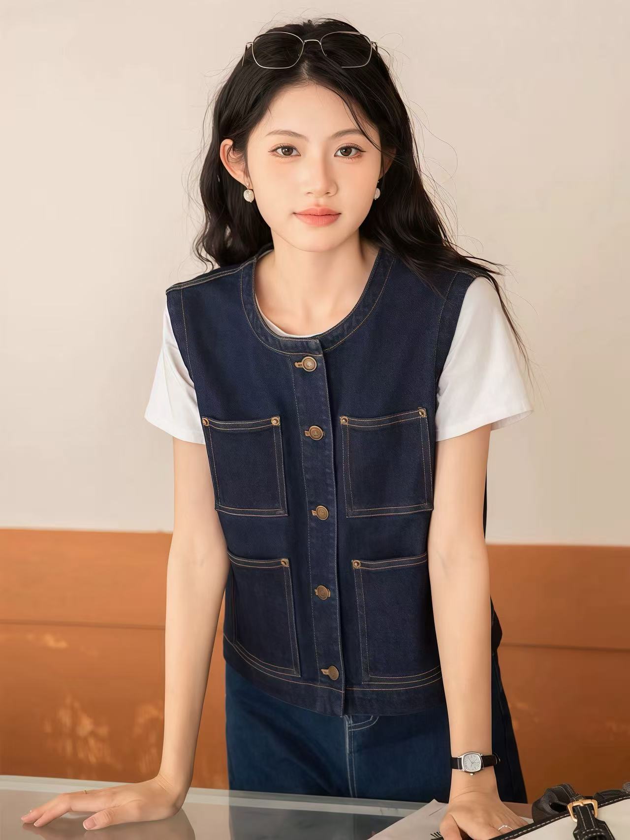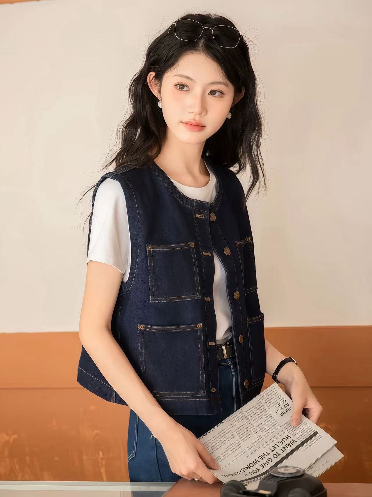 일본식 레트로 파란색 데님 조끼 여자 봄 가을 스택 착용 조끼 외부 가져 가라. 작은 키 어깨 조끼 민소매 맨위