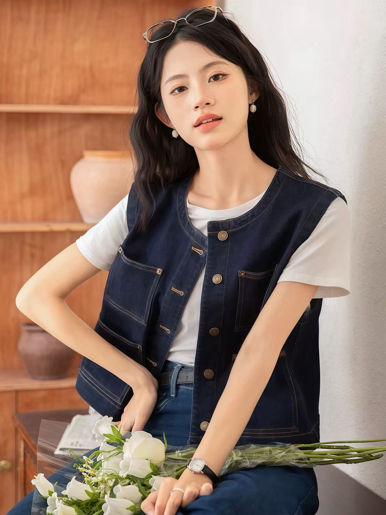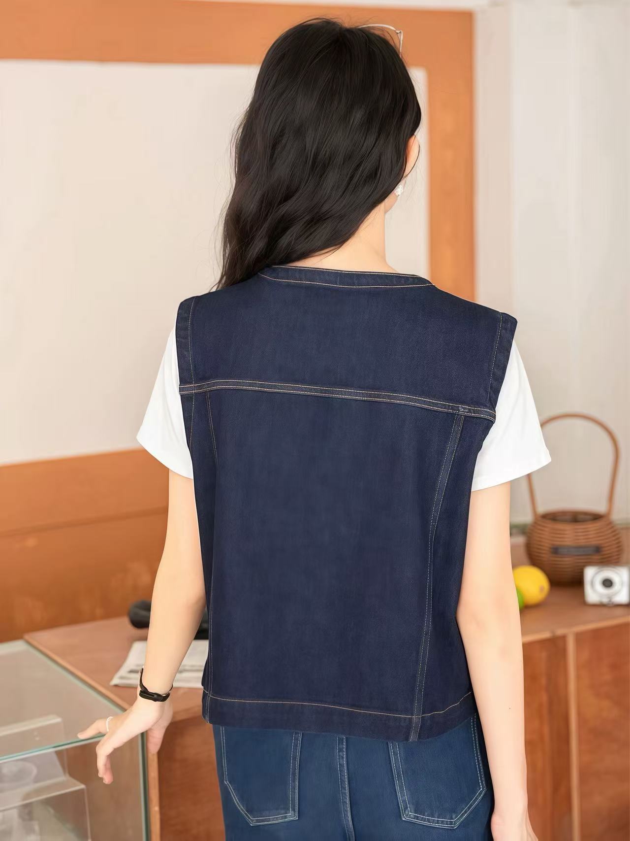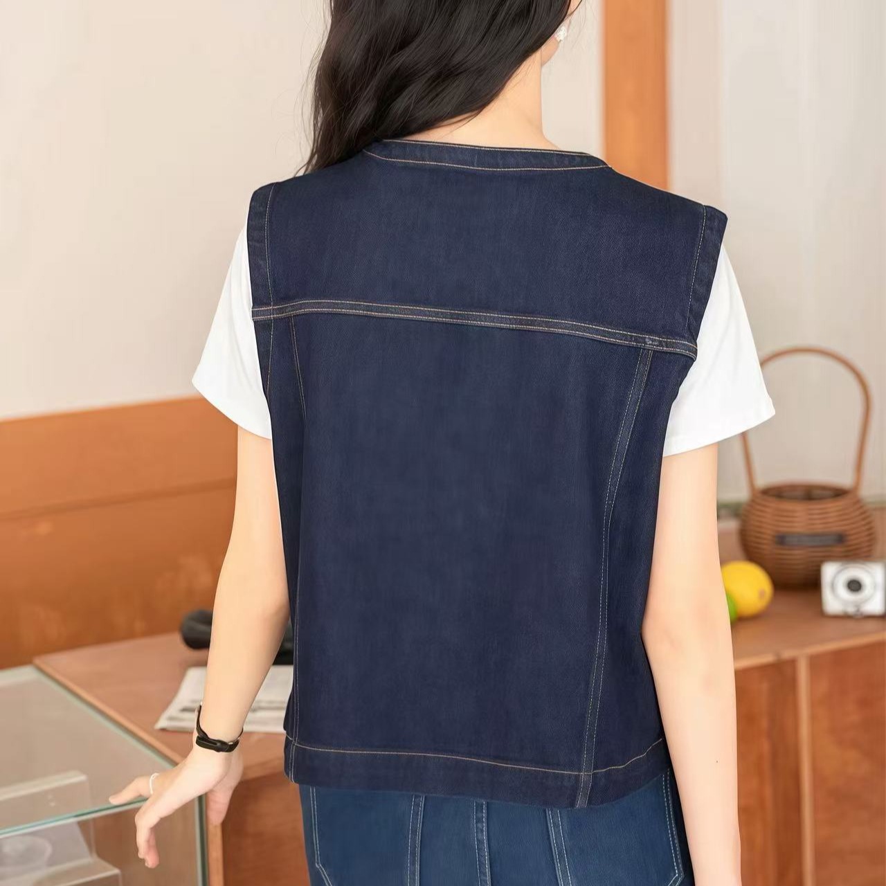 일본식 레트로 파란색 데님 조끼 여자 봄 가을 스택 착용 조끼 외부 가져 가라. 작은 키 어깨 조끼 민소매 맨위