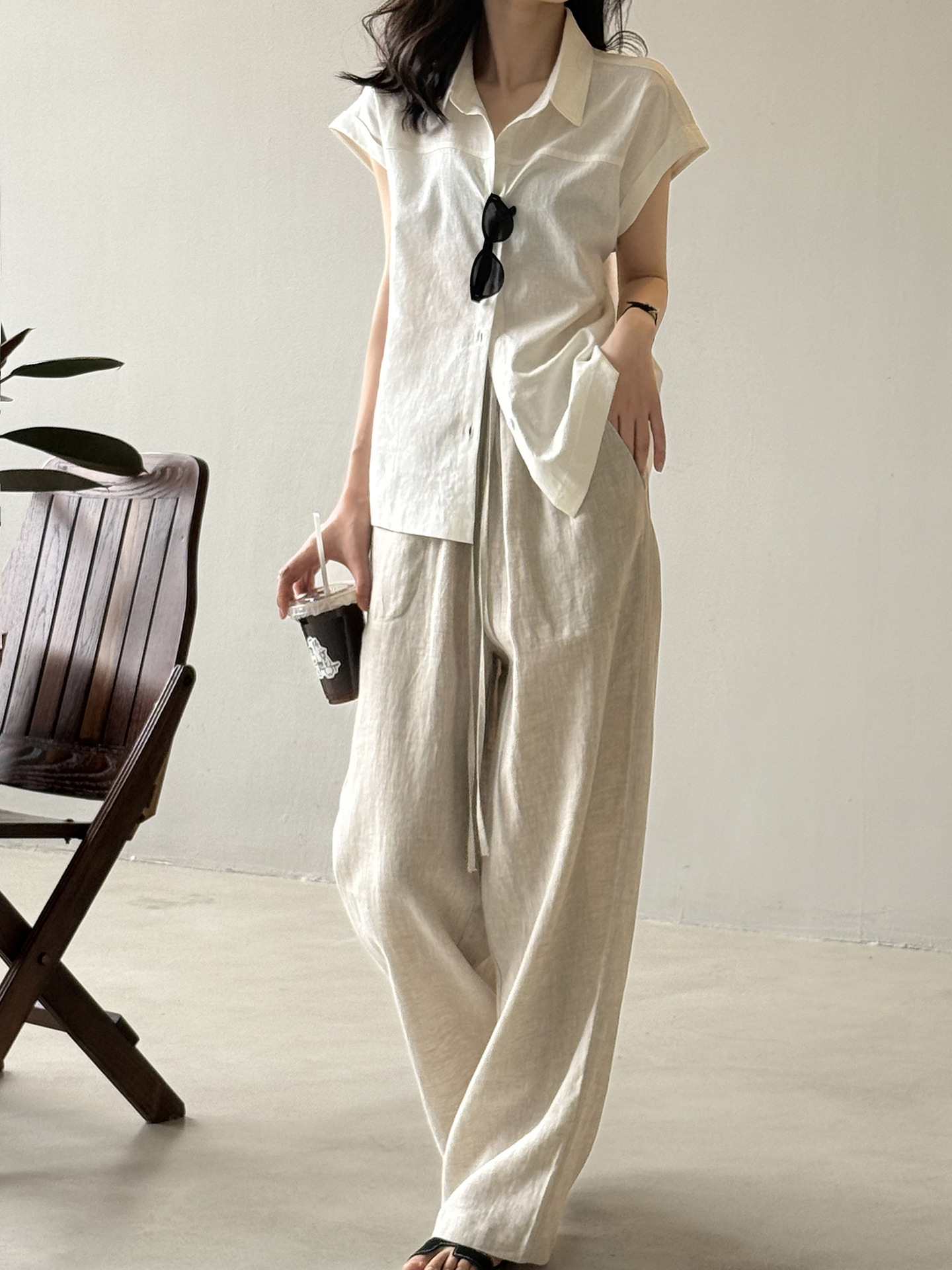 오래된 돈 바람 V넥 아마 스트랩 허리 수축 민소매 맨위 캐주얼 바지 여름 새로운 투피스 세트