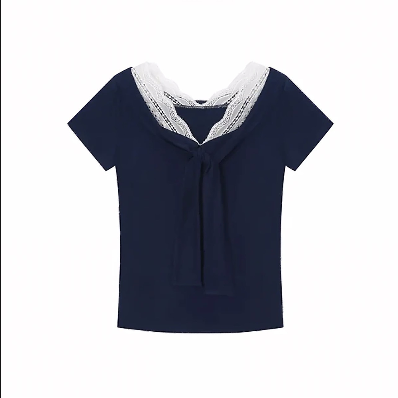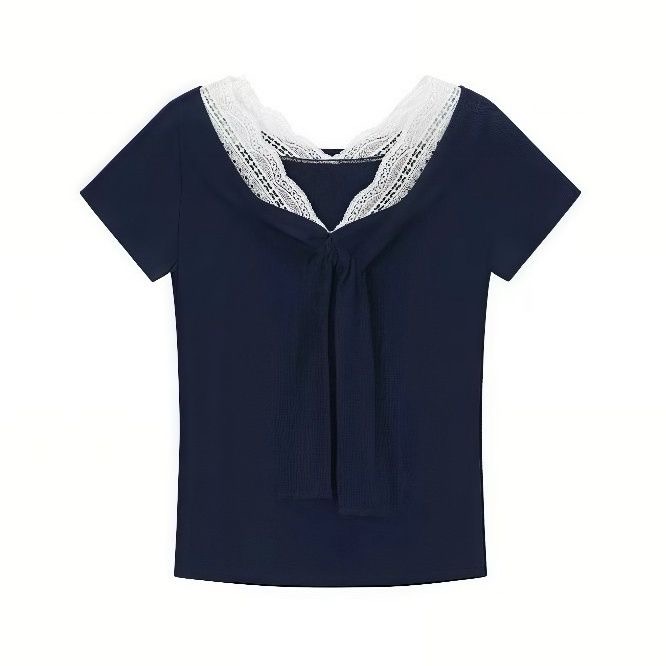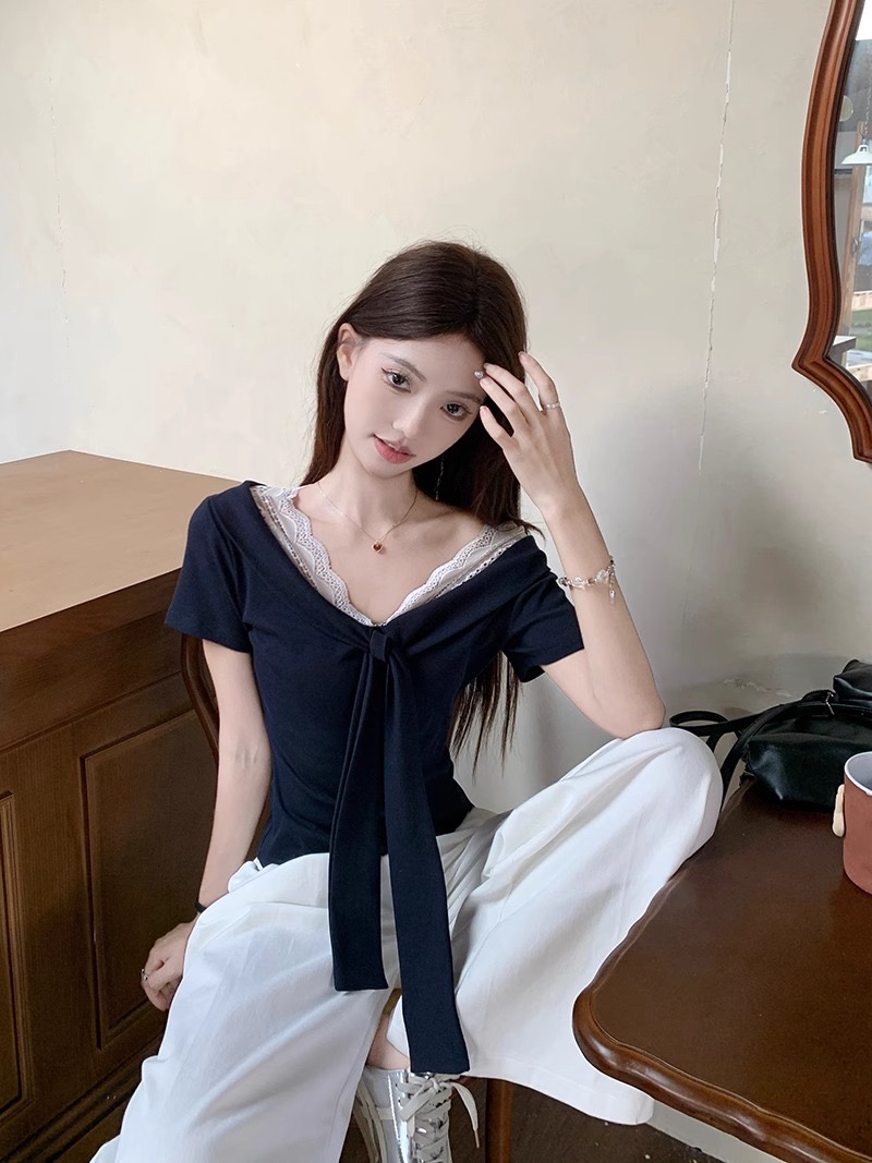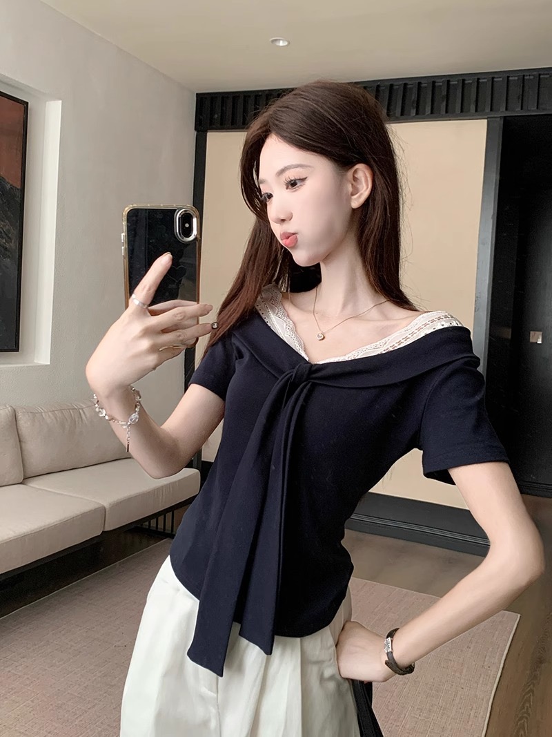 반팔 티셔츠 여성 2026 새로운 여름 검정색 반소매 쇼트 스타일 몸매 가꾸기 레이스 조각 아름다운 순면 V넥 맨위