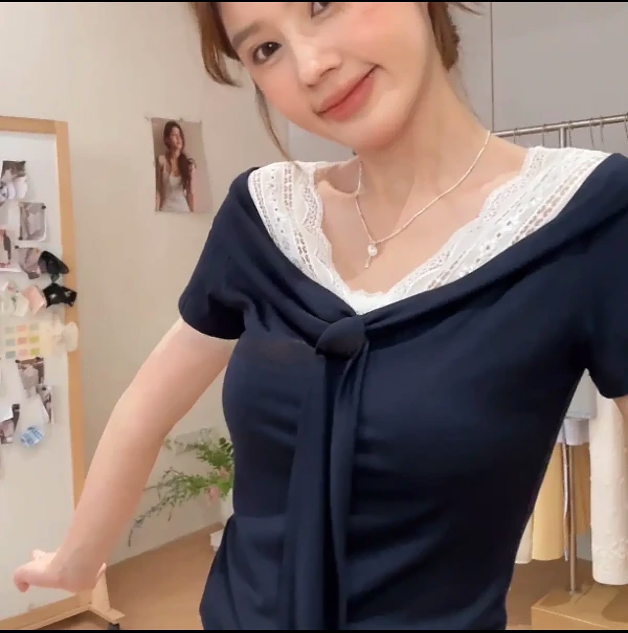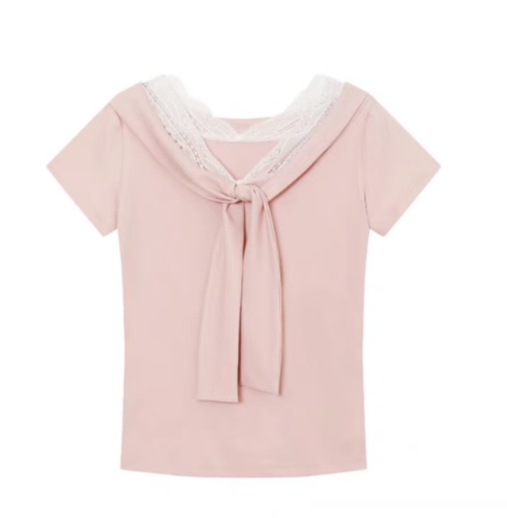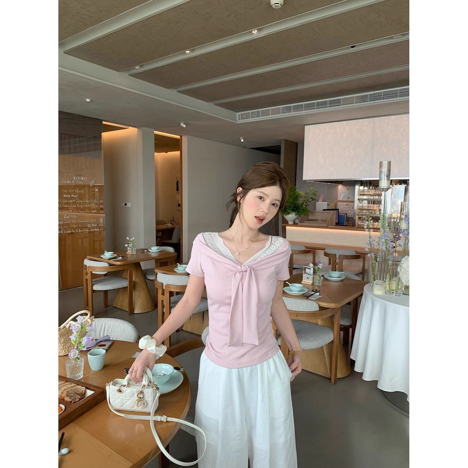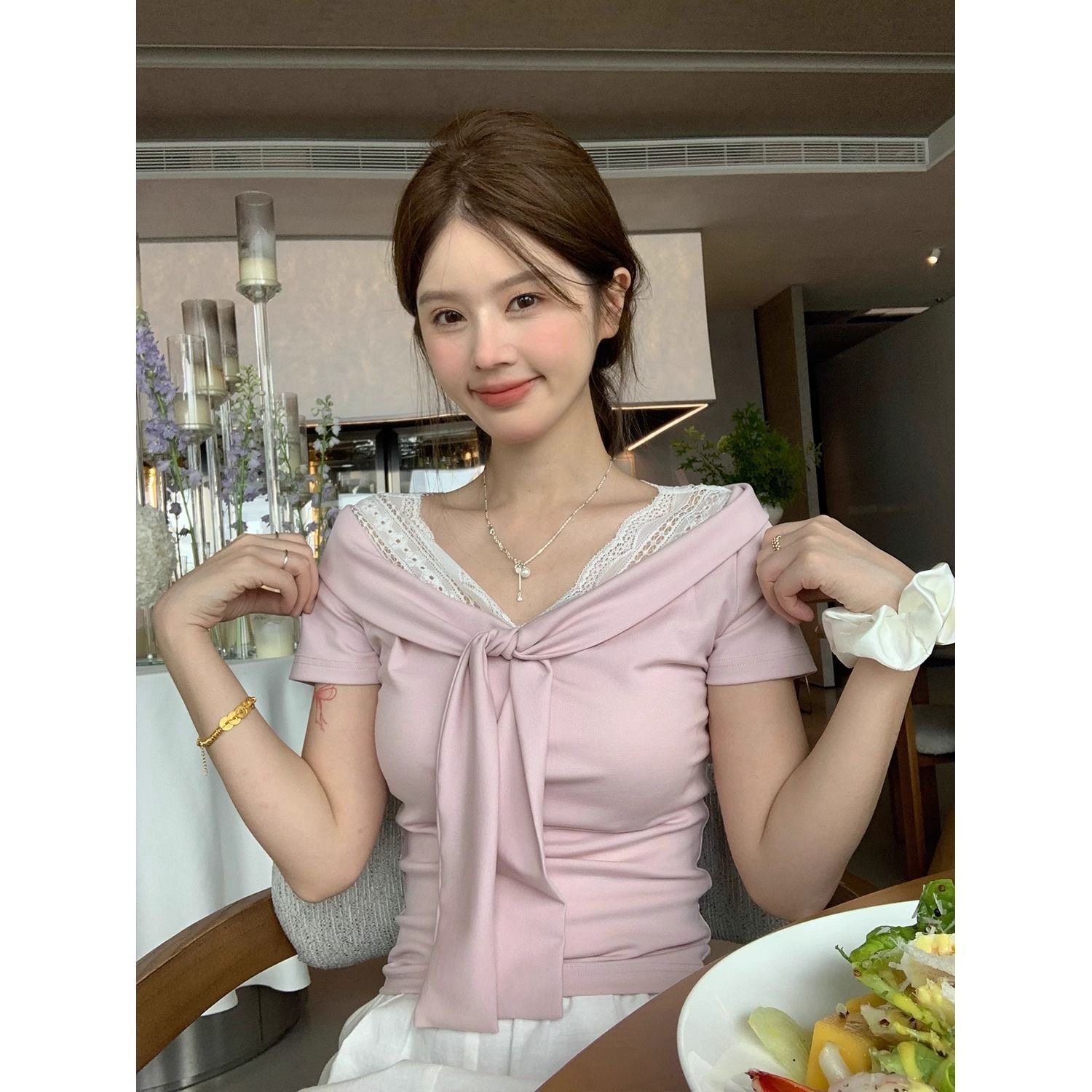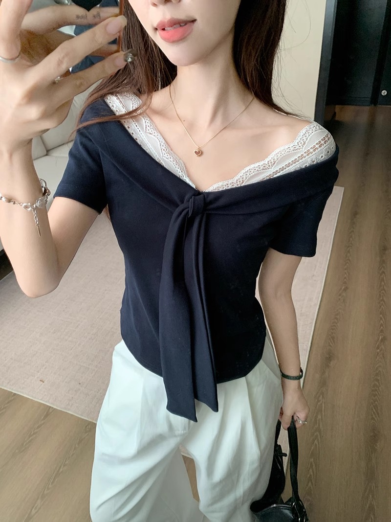 송 긍정적 인 En 화이트 V넥 레이스 레이스 스트랩 긍정적 인 어깨 반팔 티셔츠 여성 여름 몸매 가꾸기 고유 한 슈퍼 잘 생긴 맨위