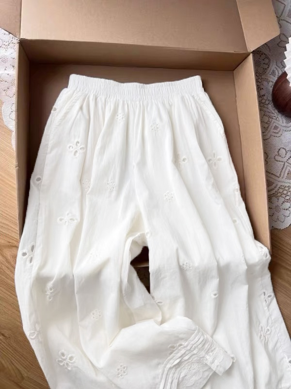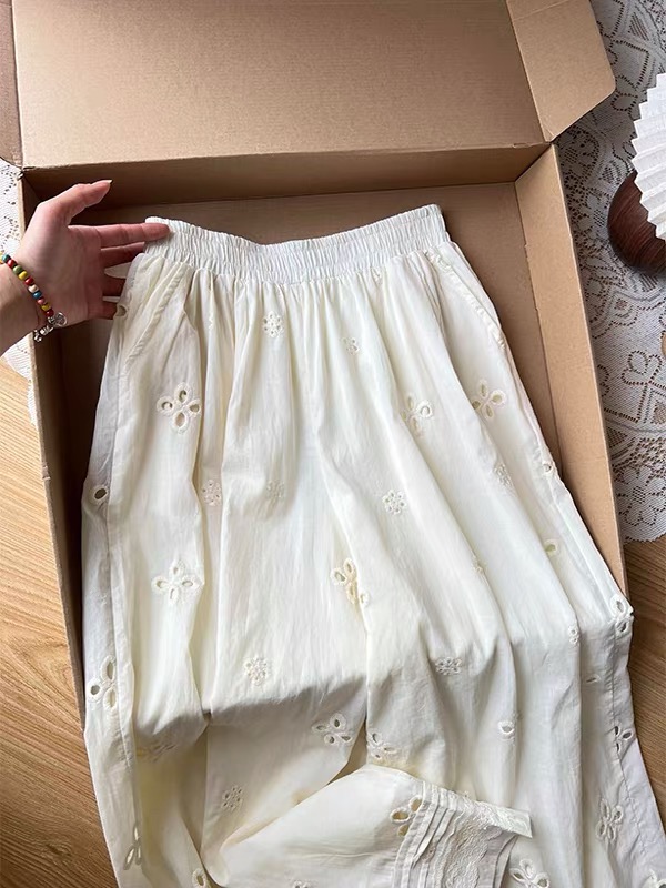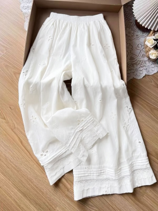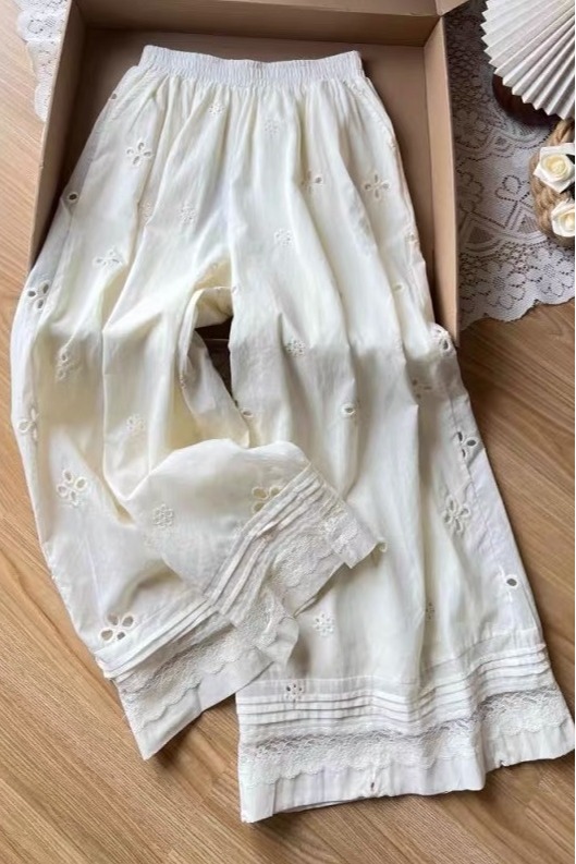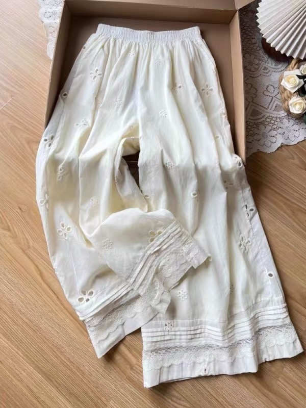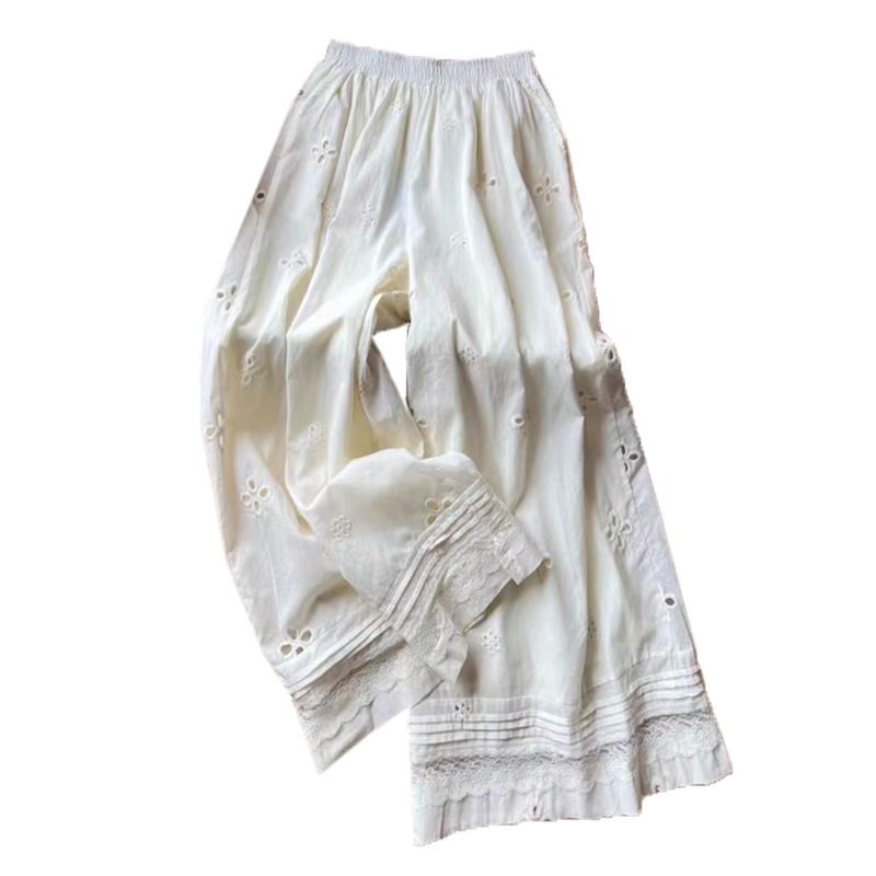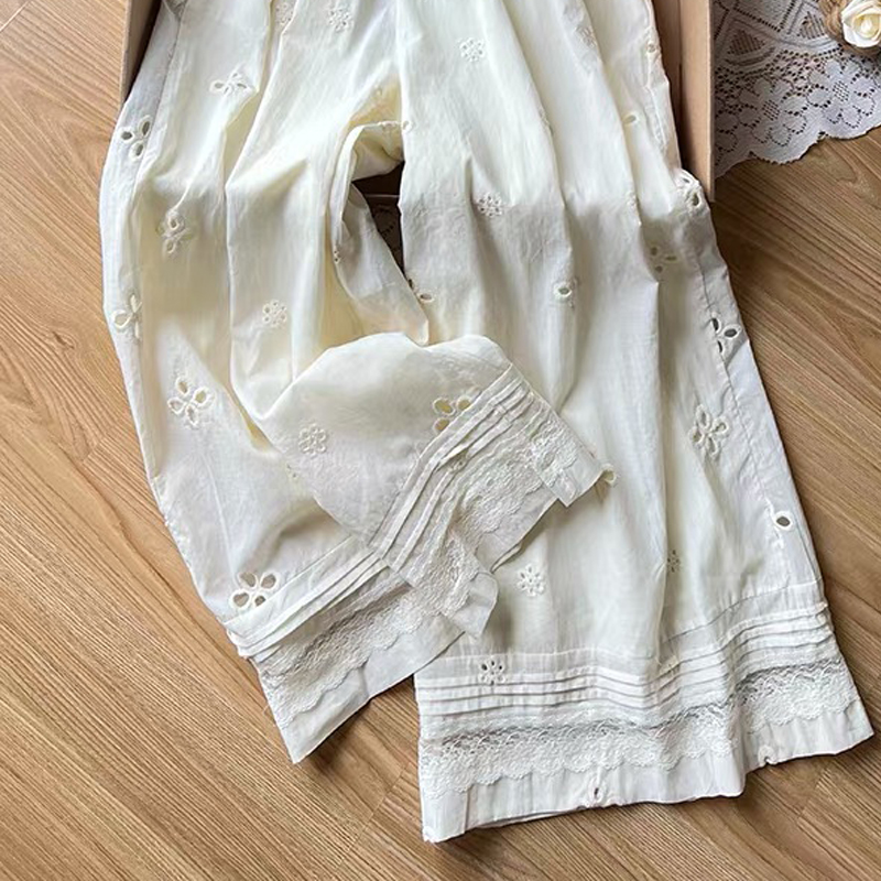 2025 여름 새로운 자수 홀로우 아웃 스트레이트 캐주얼 바지 여성 느긋한 바람 레이스 조각 한국 스타일 다용도 와이드 레그 팬츠