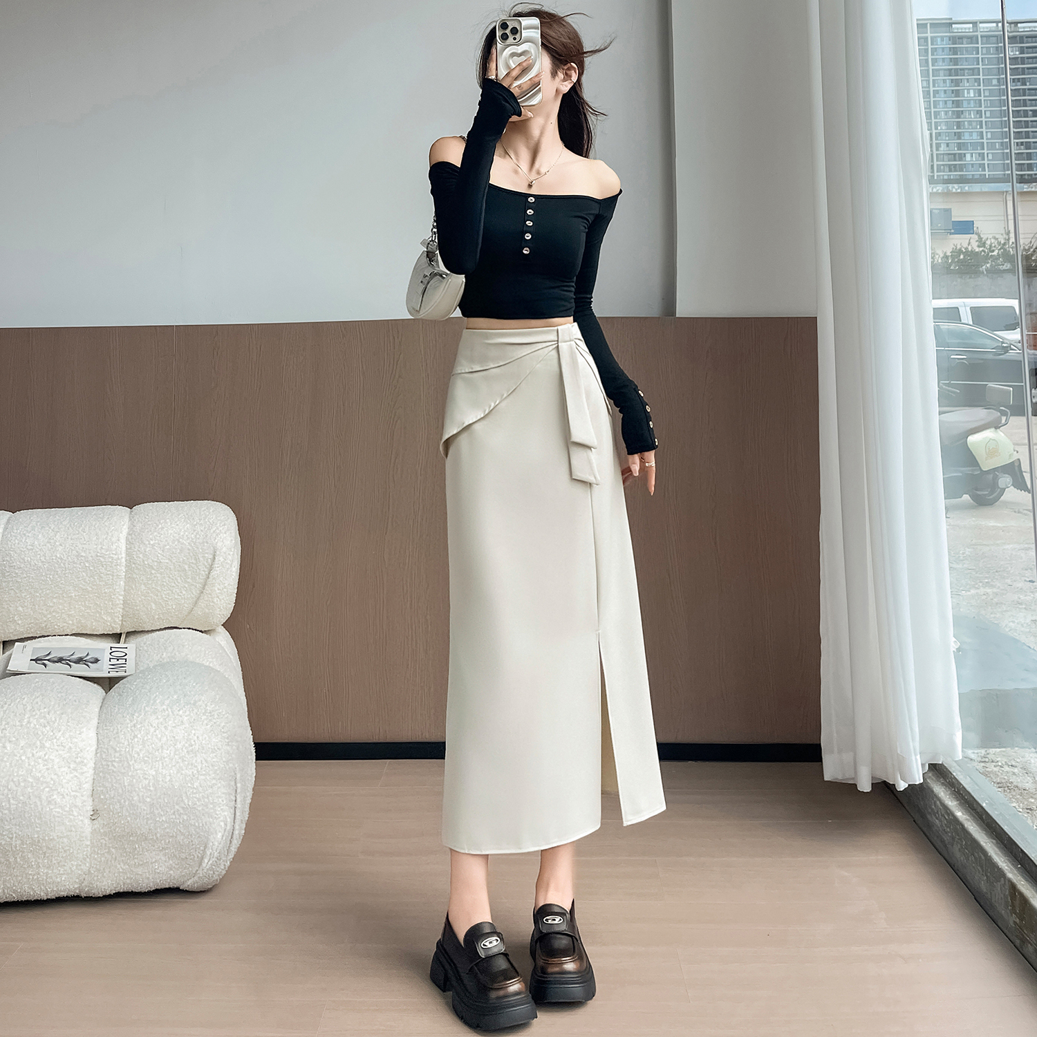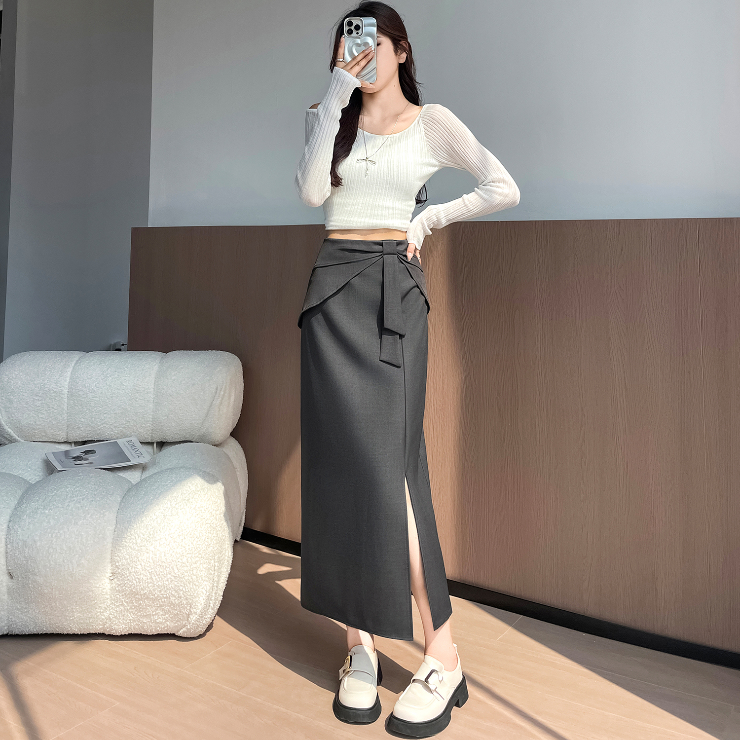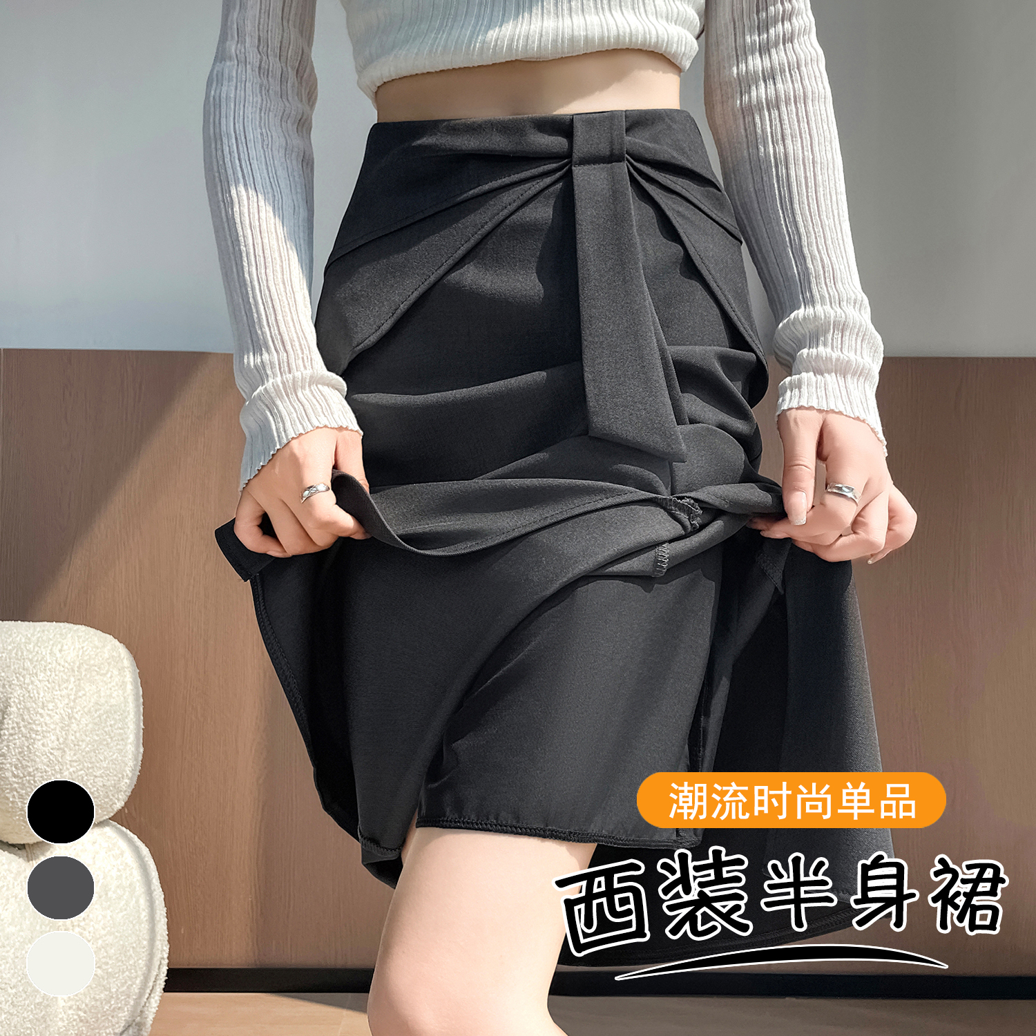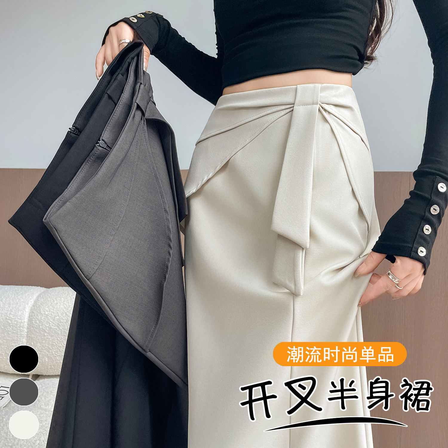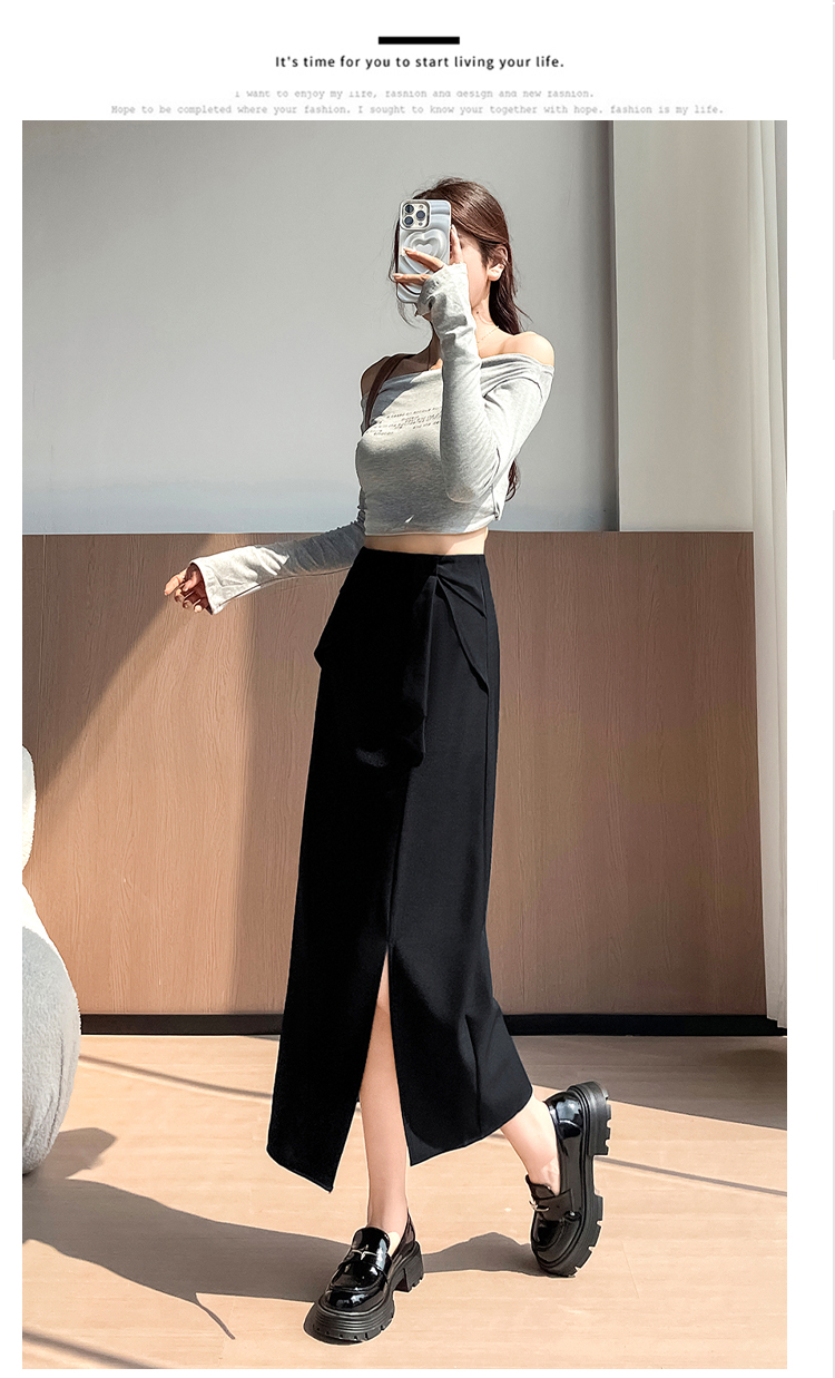 실사 이른 가을 새로운 디자인 센스 나비 매듭 트임 정장 반신 스커트 여성 다용도 하이웨이스트 길다 치마