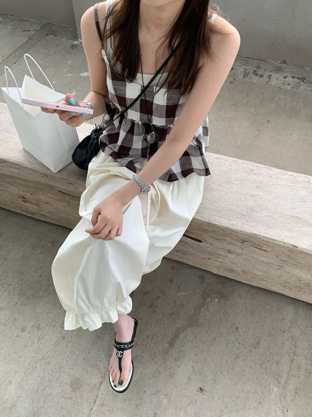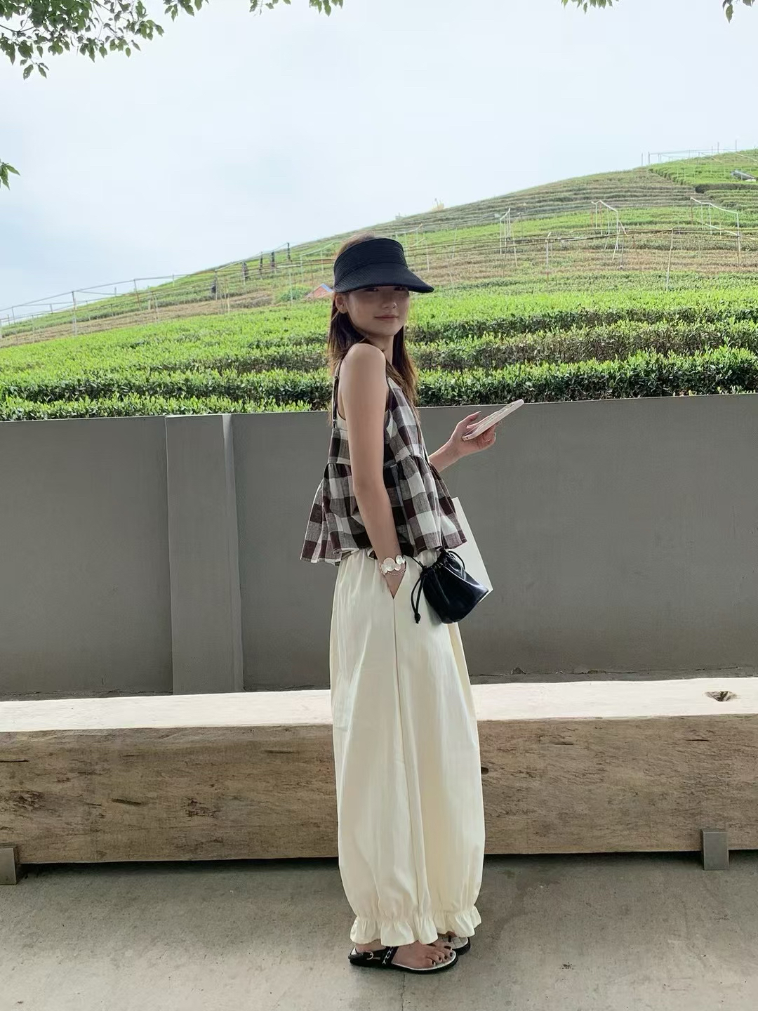 한국 ins 봄 여름 레트로 레이스 패치워크 작은 체크무늬 루즈핏 느긋한 바람 스트레이트 캐주얼 바지