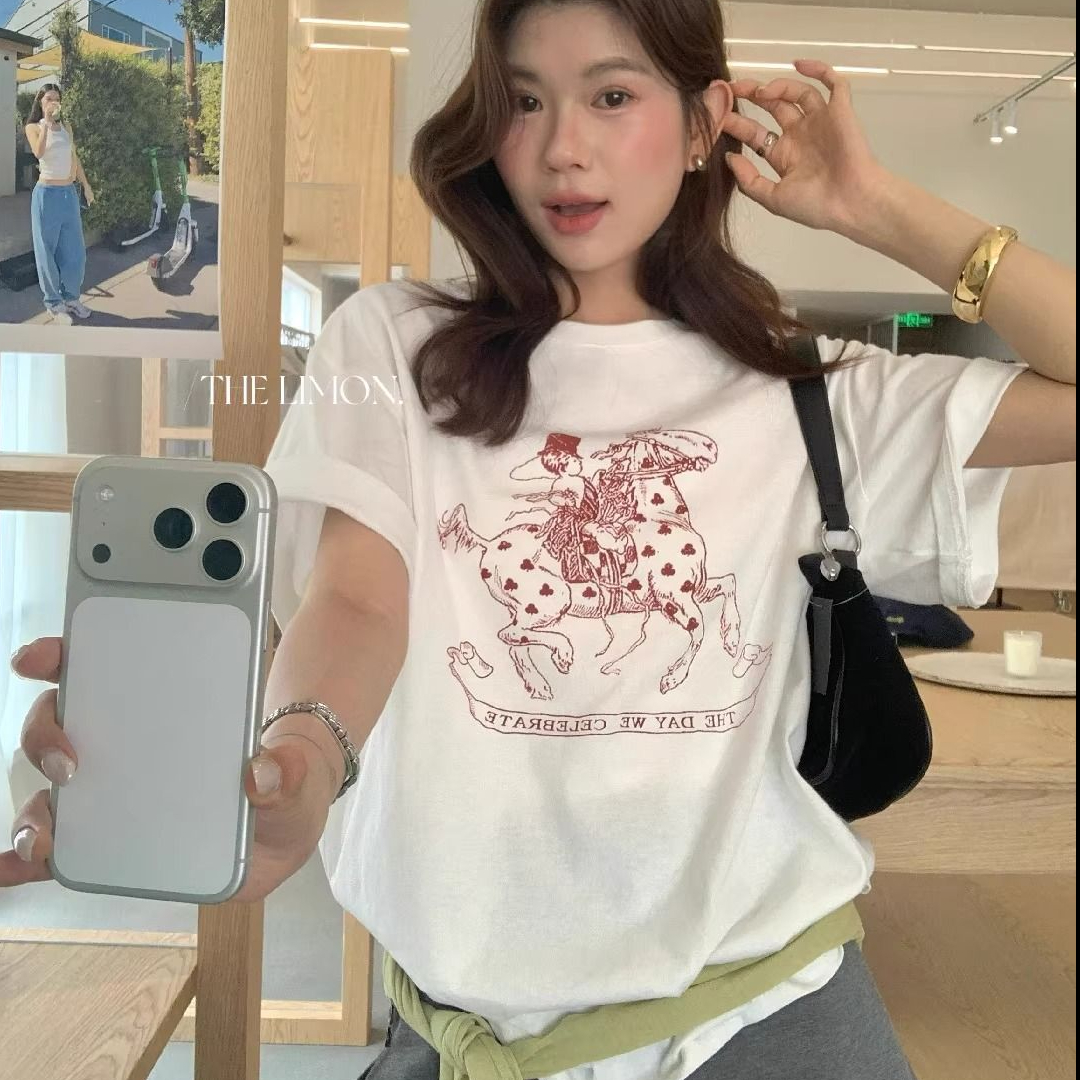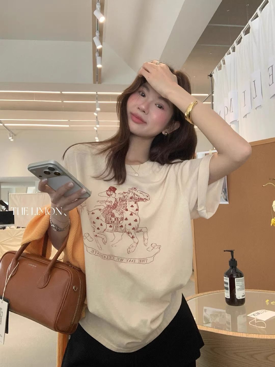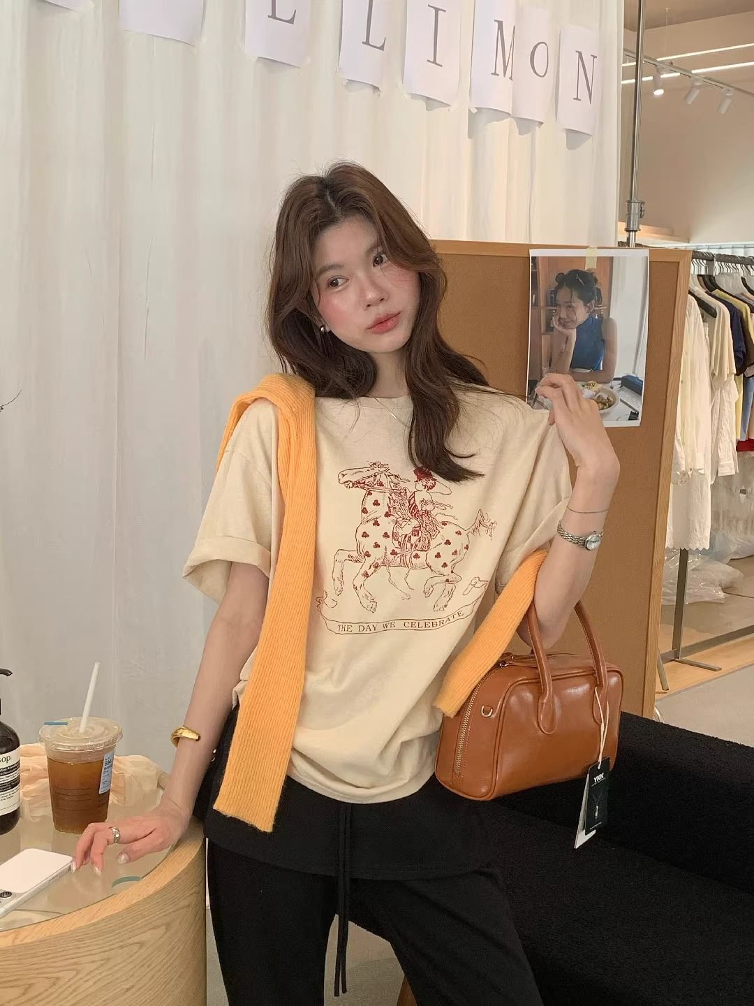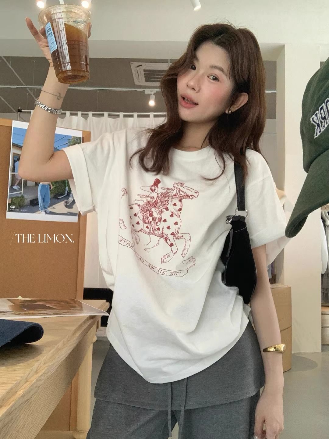2026 여름 한 부서 캐주얼 바람 라운드 넥 프린트 반팔 티셔츠 여성 루즈핏 맨위
