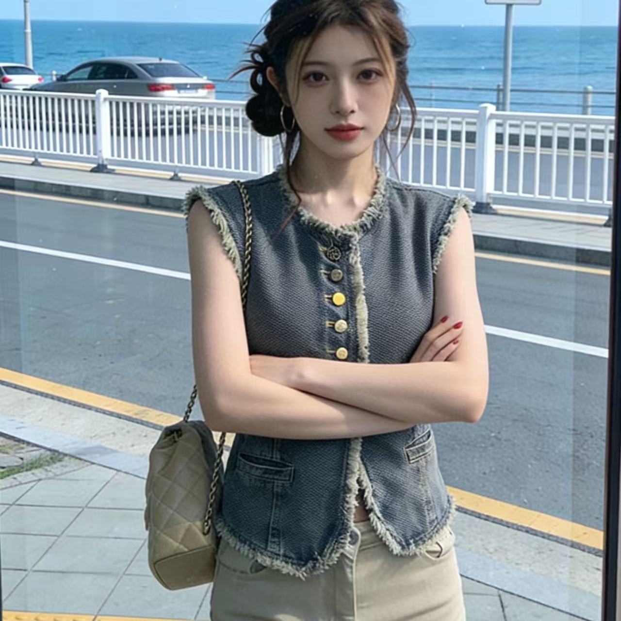 레트로 거친 가장자리 데님 베스트 여성 코트 가을 2026 새로운 세련된 외국 가스 루즈핏 민소매 어깨 조끼 조끼