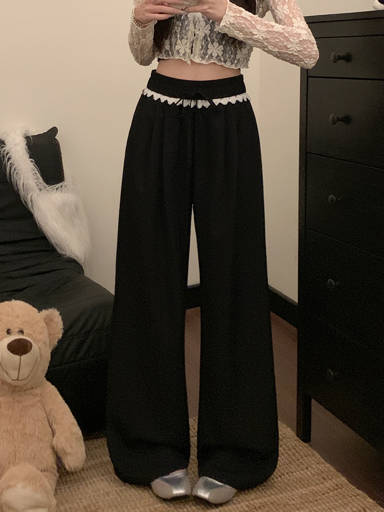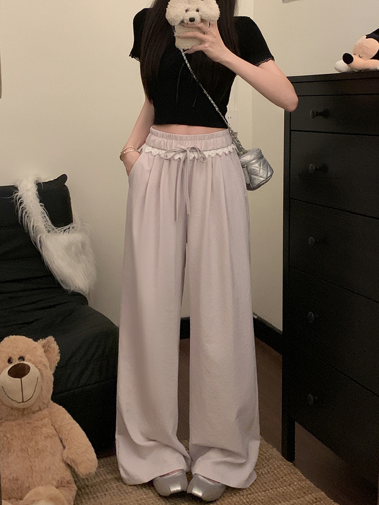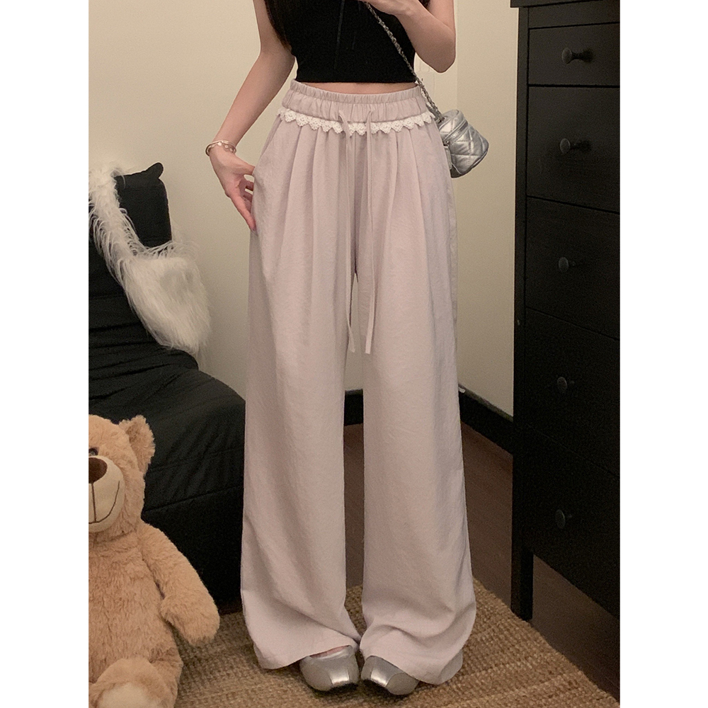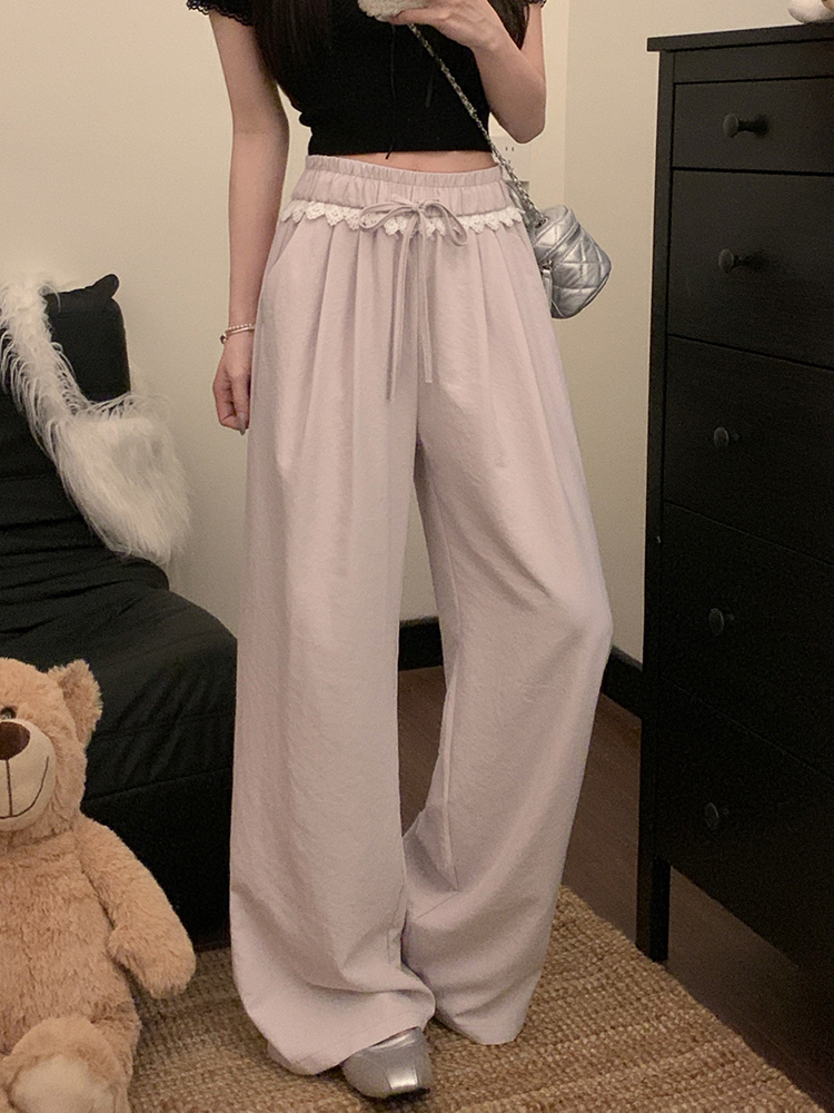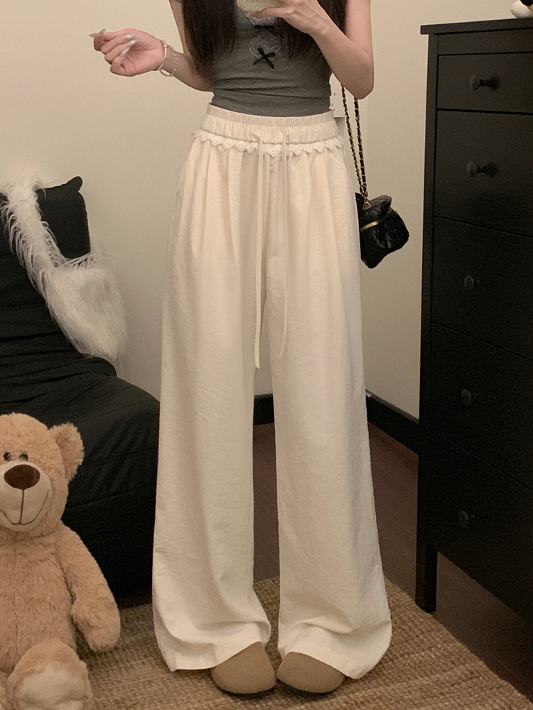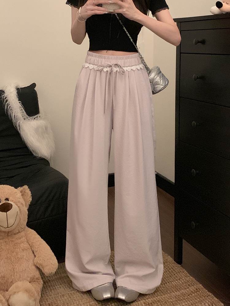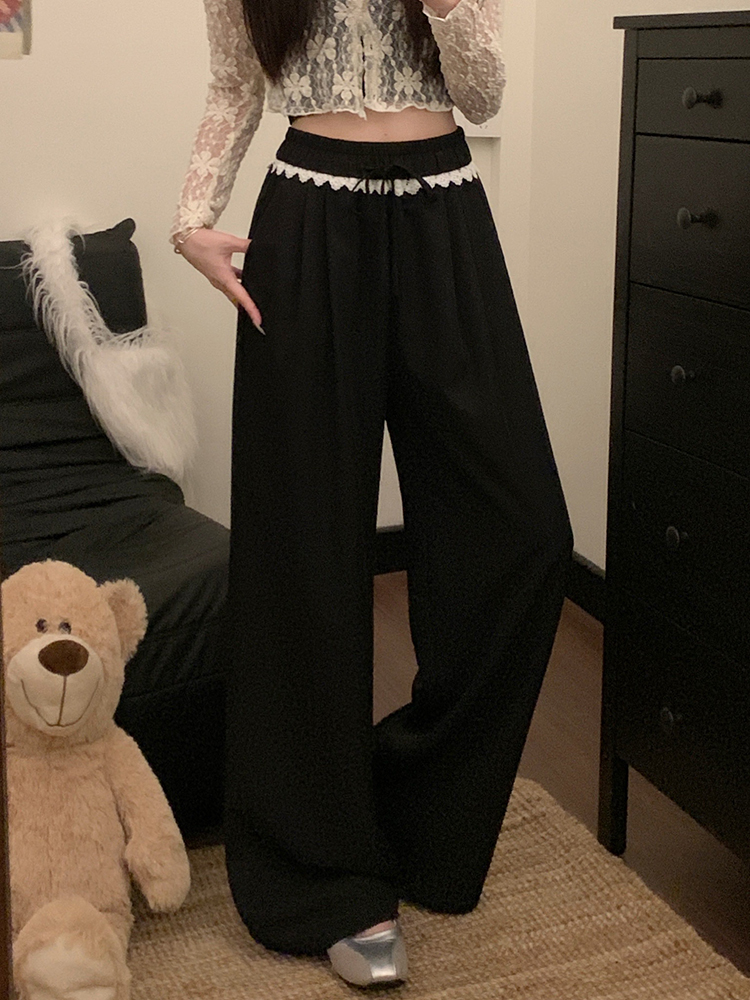실사 2026 새로운 개성 레이스 와이드 레그 팬츠 펌프 로프 레이스업 허리밴드 캐주얼 루즈핏 바지 여성
