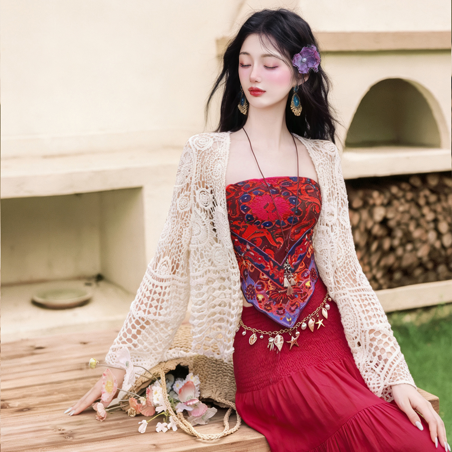 언어 그리스어 실사 빨간색 튜브탑 코디 반신 스커트 자외선 차단 재킷 휴가 롱 스커트 세트