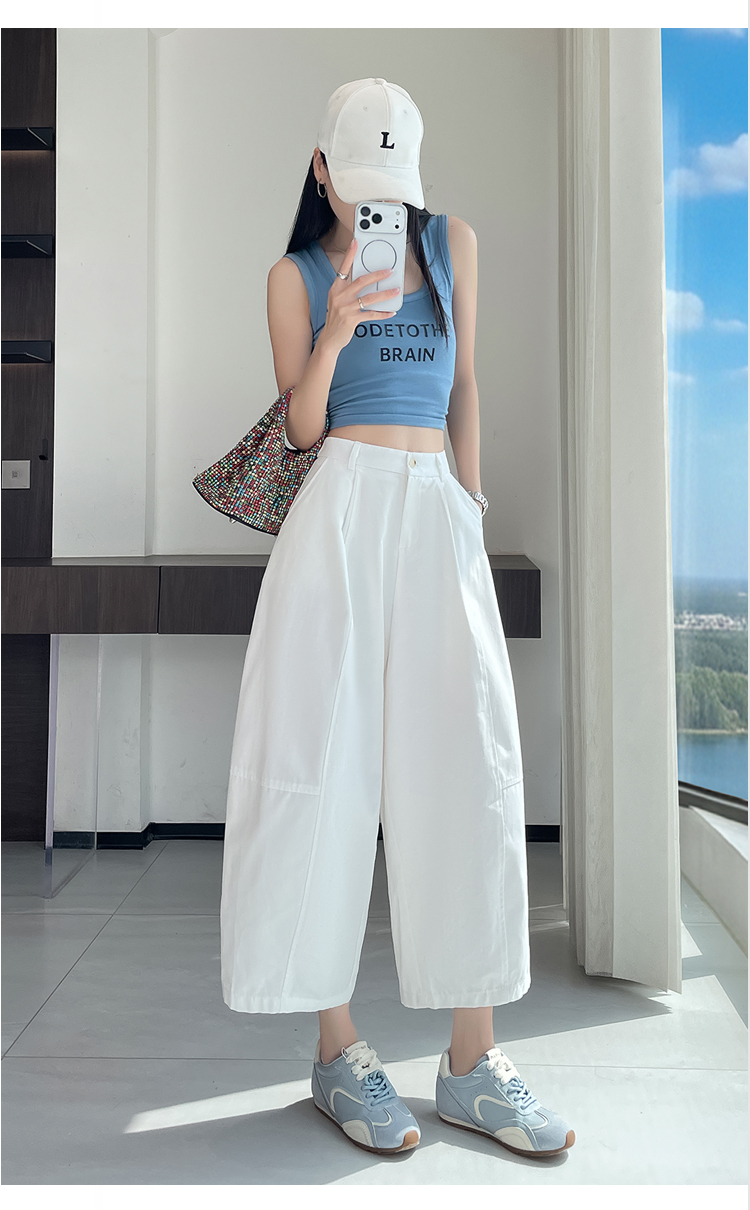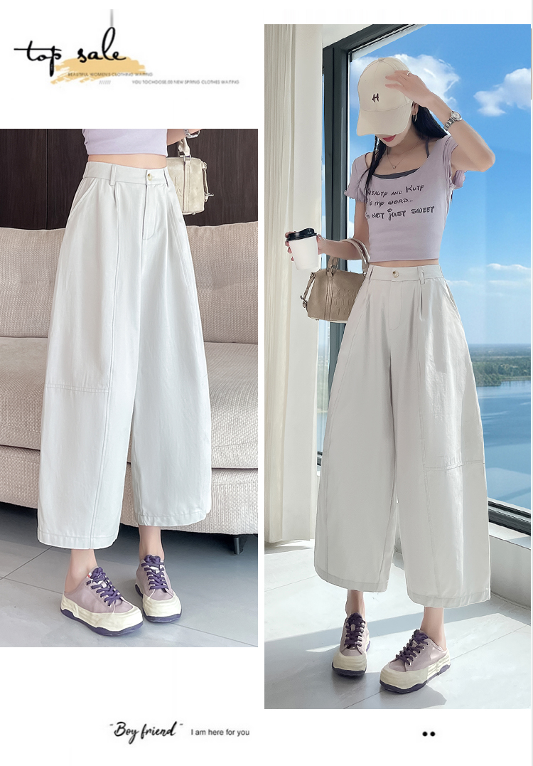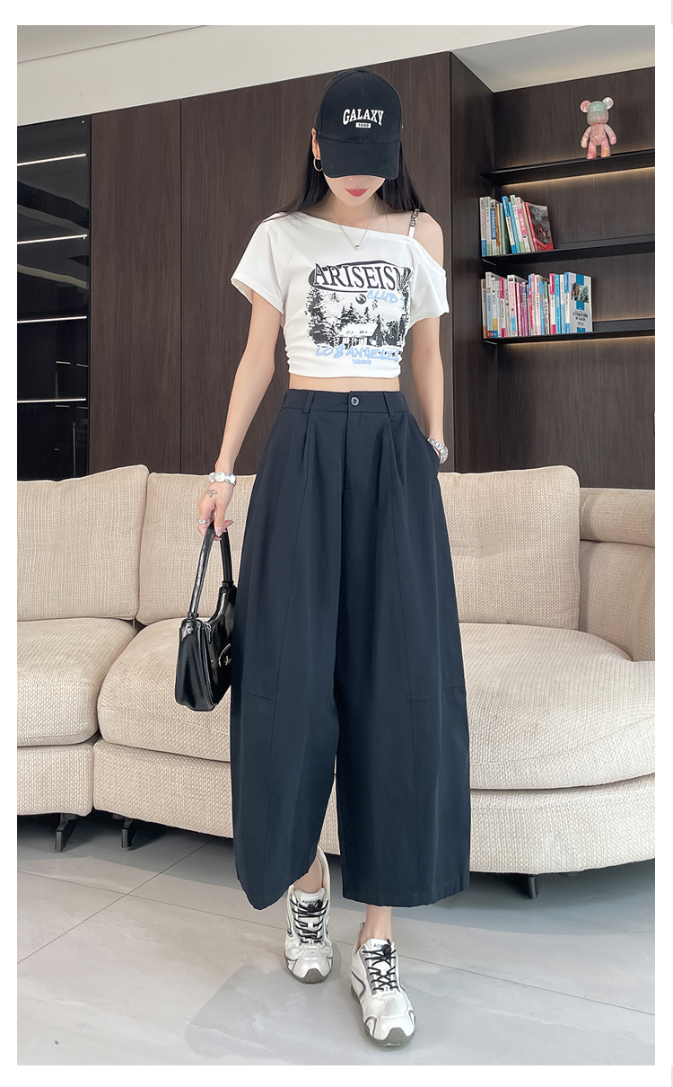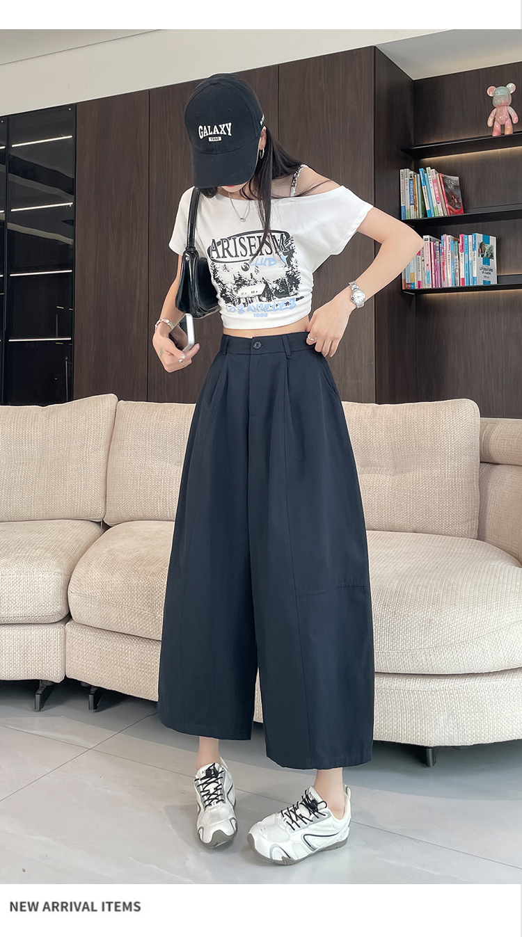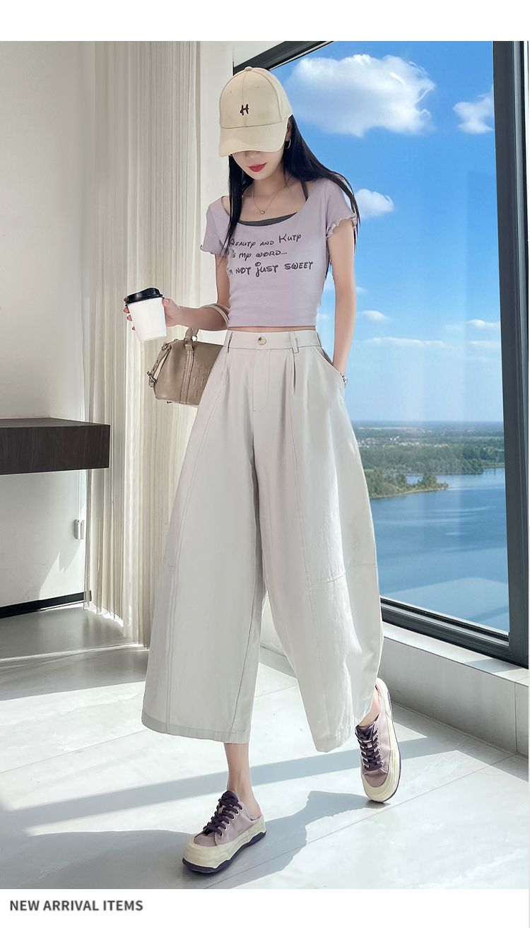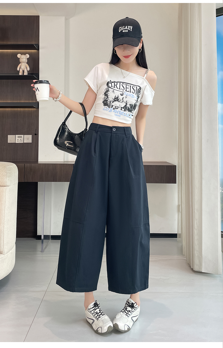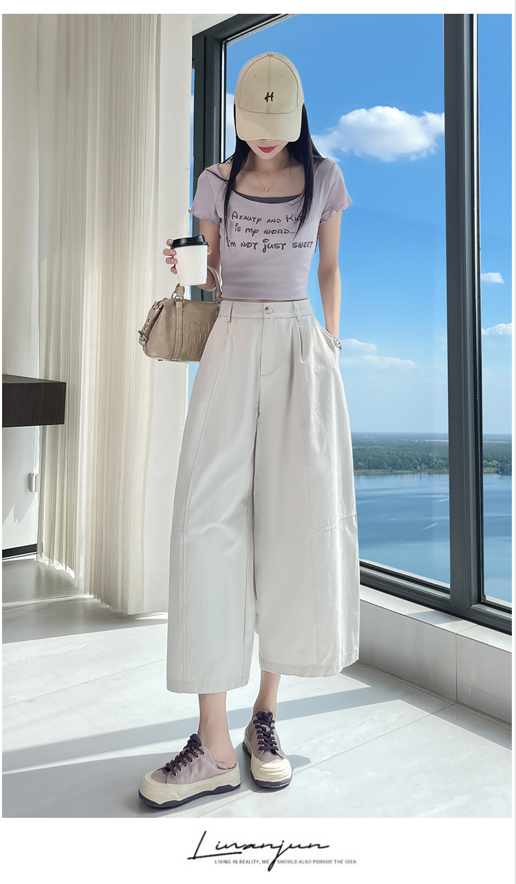 실사 풍선 스트레이트 낫 캐주얼 바지 여성 여름 새로운 하이웨이스트 슬림해 보이는 루즈핏 넓은 다리 9 포인트 바지