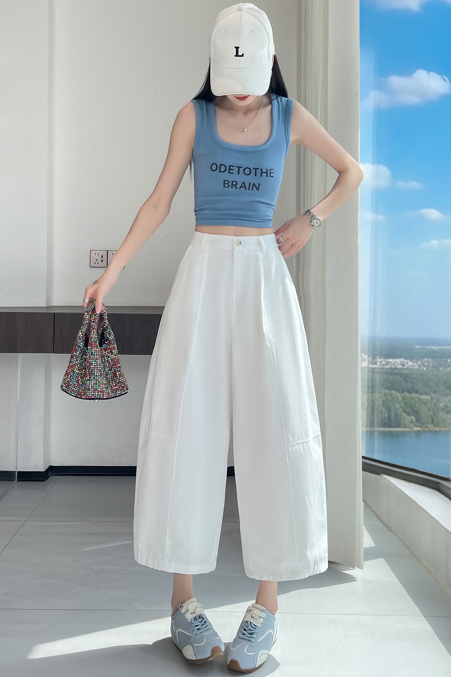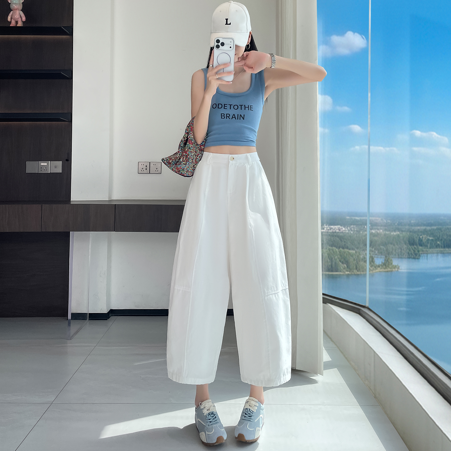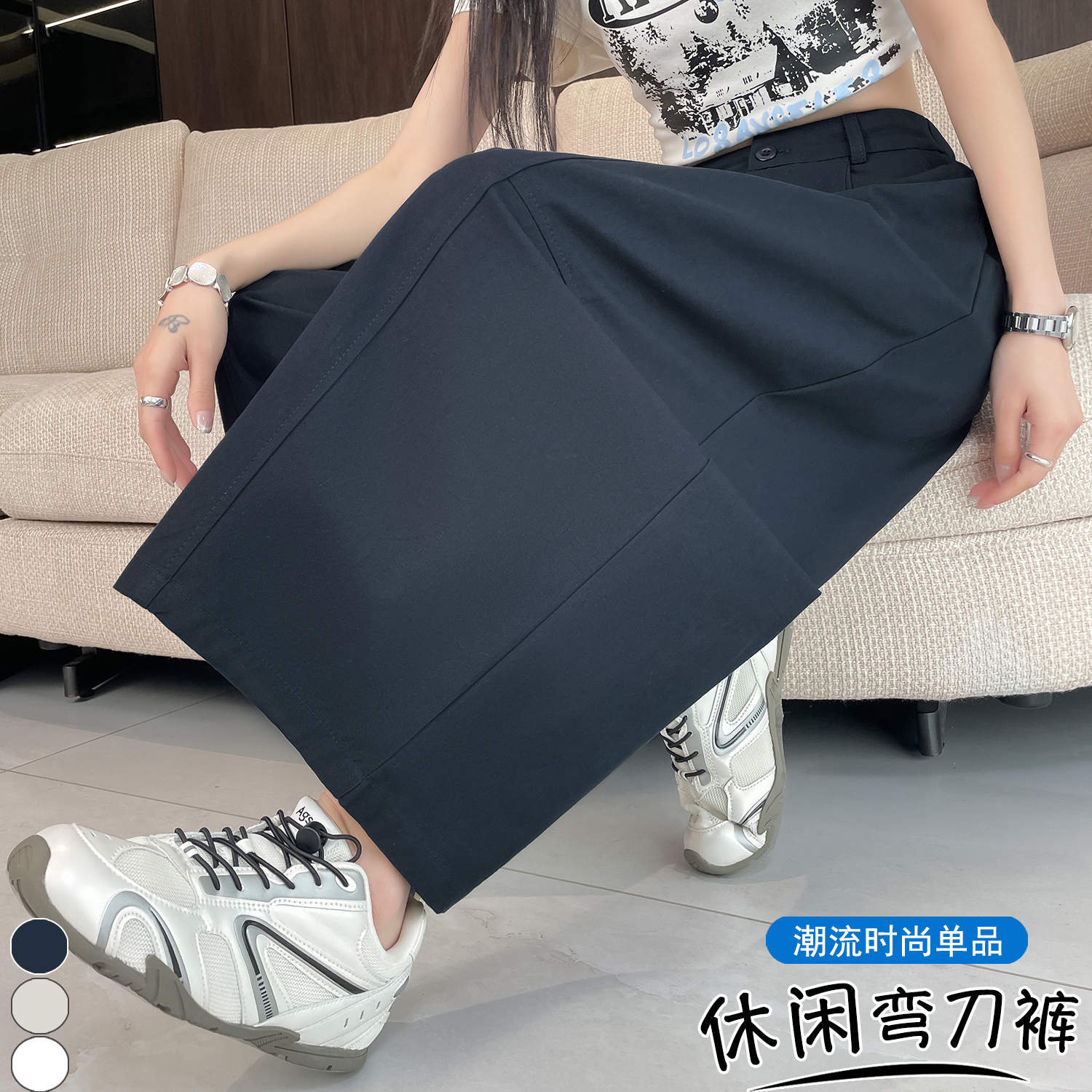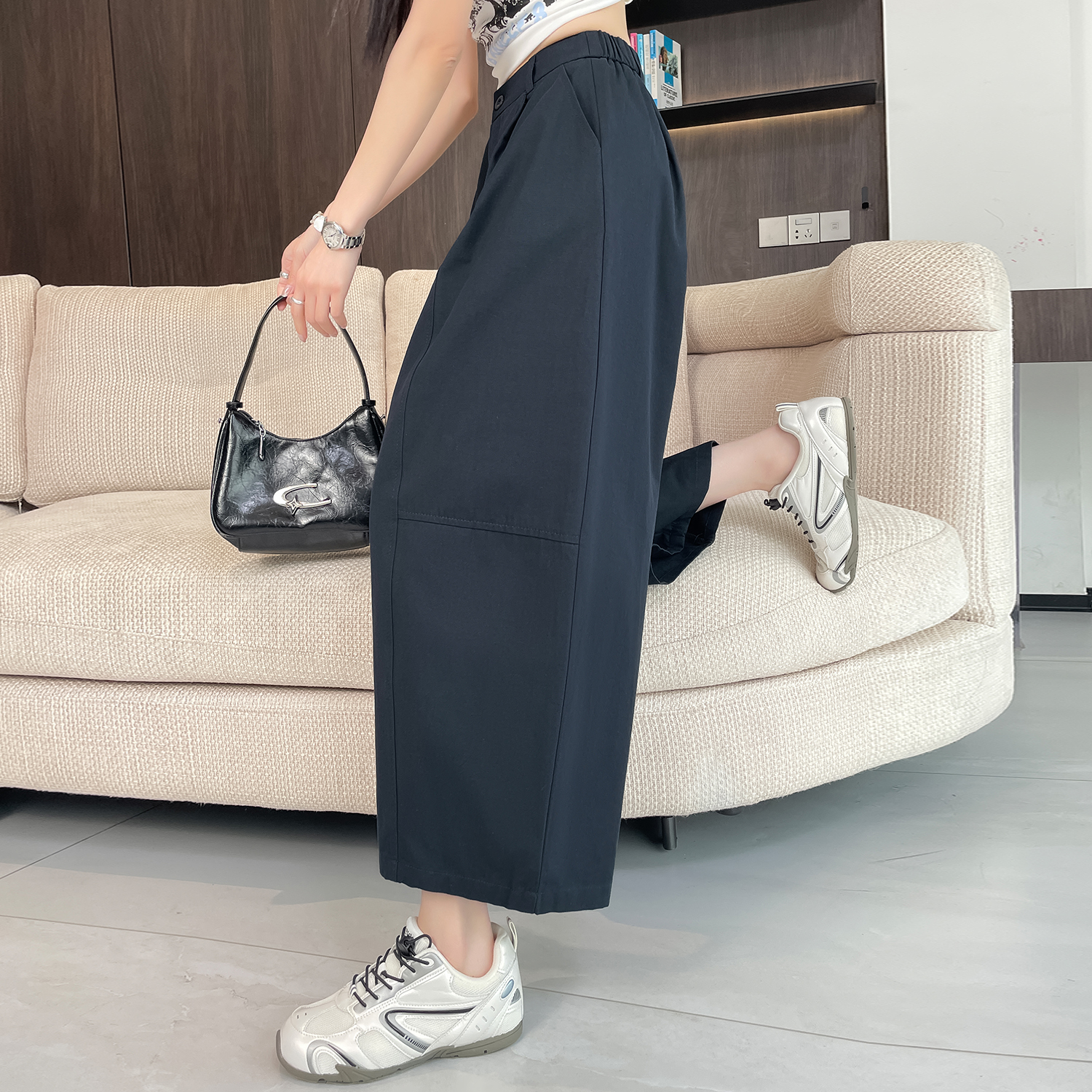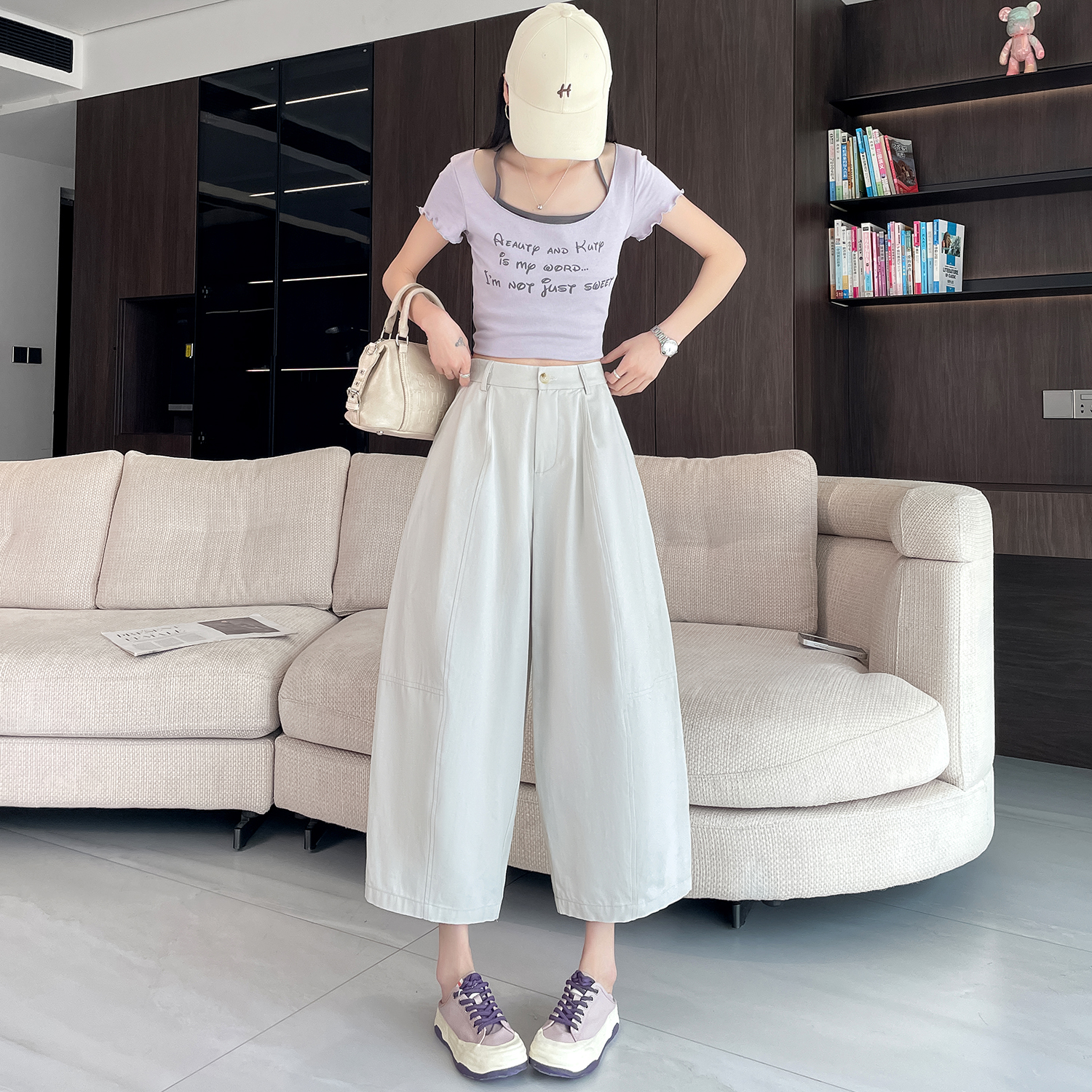 실사 풍선 스트레이트 낫 캐주얼 바지 여성 여름 새로운 하이웨이스트 슬림해 보이는 루즈핏 넓은 다리 9 포인트 바지