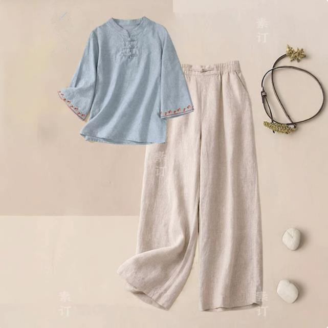 레트로 국풍 스탠드 칼라 단추 자수 맨위 가져 가라. 와이드 레그 팬츠 투피스 세트