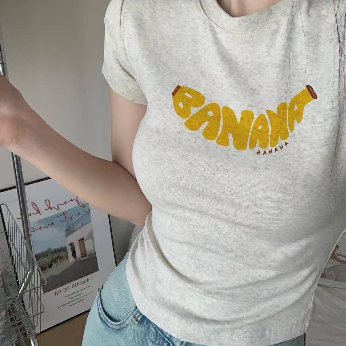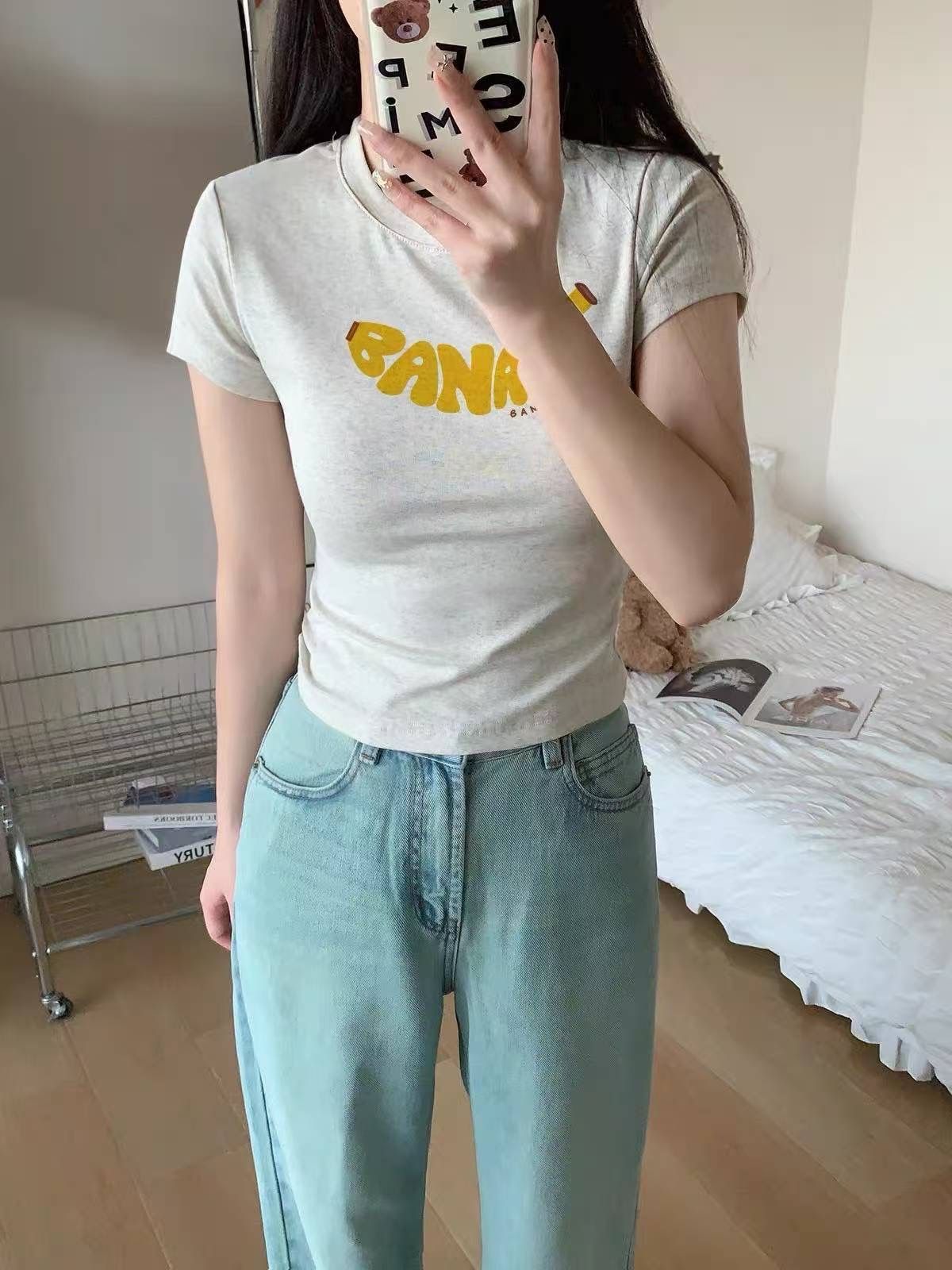 회색 프린트 긍정적 인 어깨 반팔 티셔츠 여성 여름 2026 새로운 여름 소녀 반소매 타이트 몸매 가꾸기 쇼트 스타일 맨위