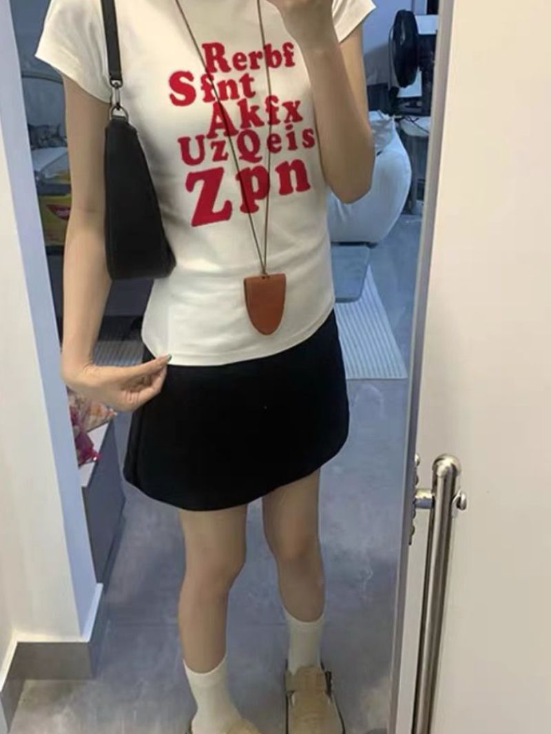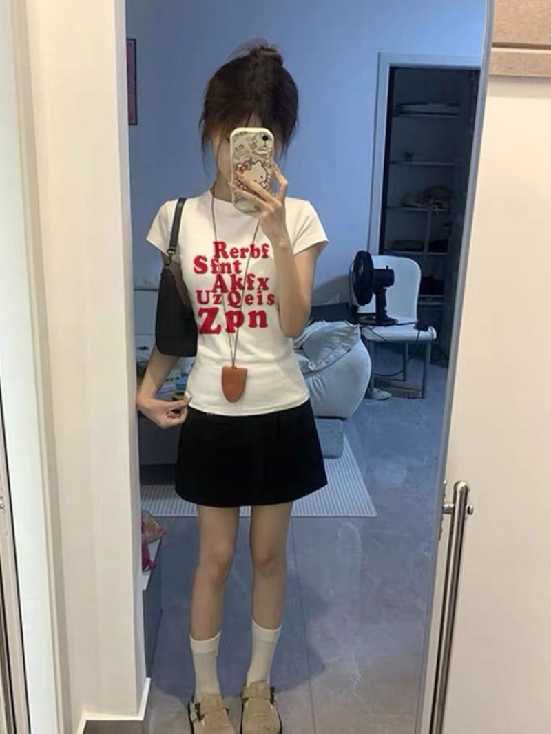 아메리칸 한 부서 알파벳 전체 인쇄 도트 무늬 화이트 반팔 티셔츠 여성 여름 달콤한 스타일 몸매 가꾸기 슬림해 보이는 쇼트 스타일 맨위