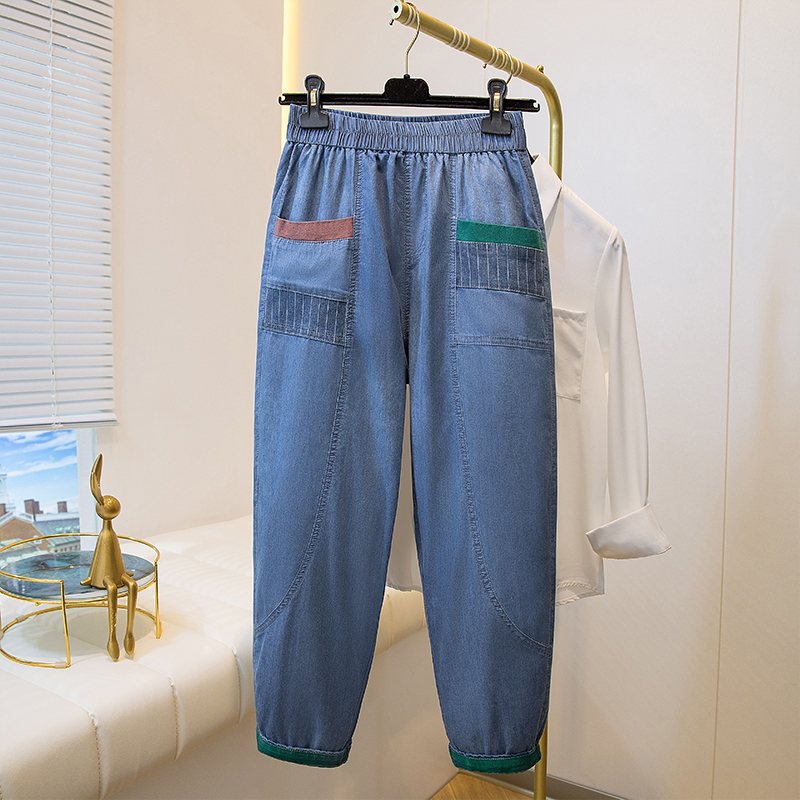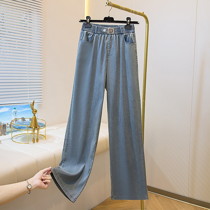 주간 실크 청바지 여성 봄 여름 섹션 밴딩 하이웨이스트 지방 mm 루즈핏 빅 사이즈 슬림해 보이는 얼음 실크 9 포인트 초박형 스트레이트 팬츠