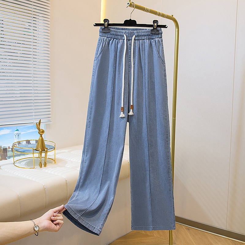 허리밴드 주간 실크 부드러운 청바지 여성 여름 얇은 스타일 2026 새로운 루즈핏 스트레이트 작은 키 얼음 실크 와이드 레그 팬츠