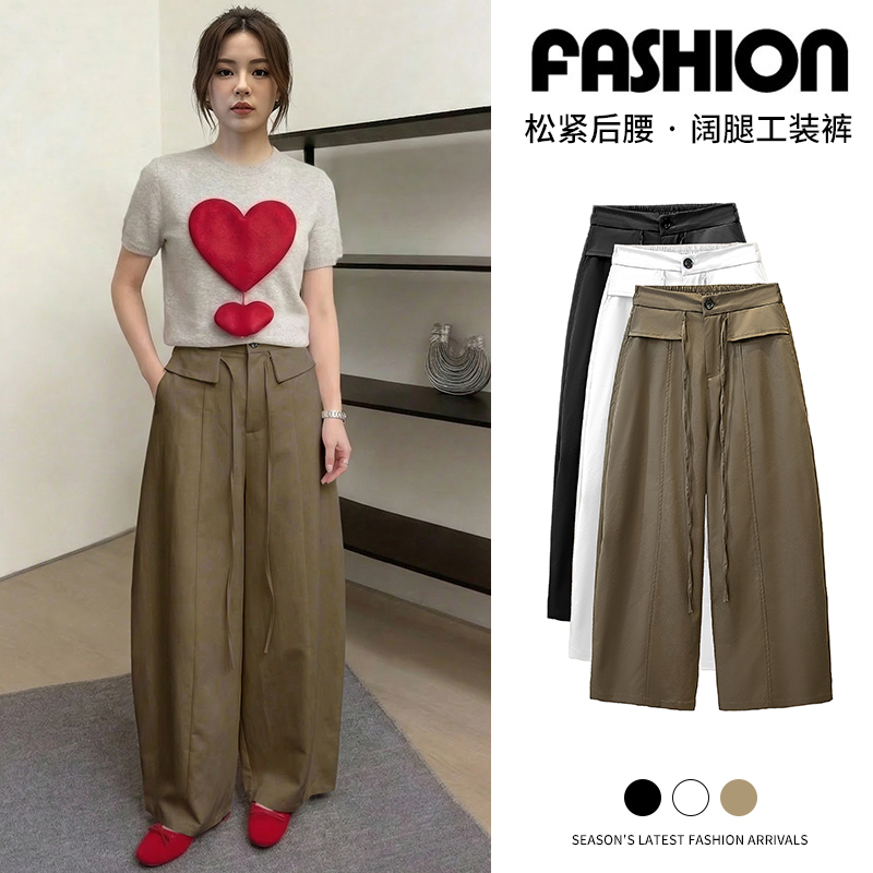 유럽 역 캐주얼 바지 여성 2026 봄 새로운 하이웨이스트 펌프 로프 루즈핏 와이드 레그 팬츠 느긋한 바람 느슨함 모통이 칼 바지