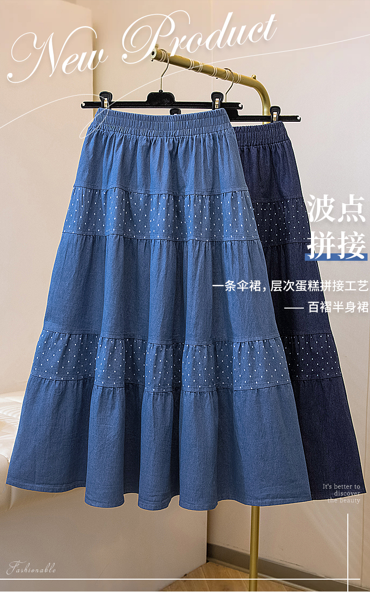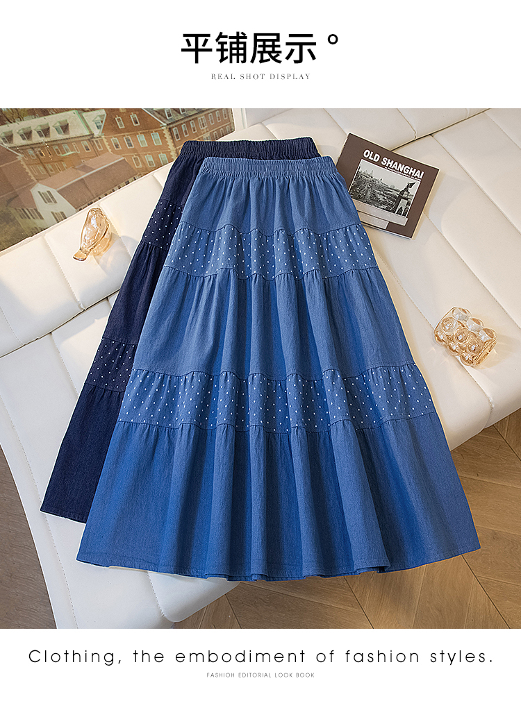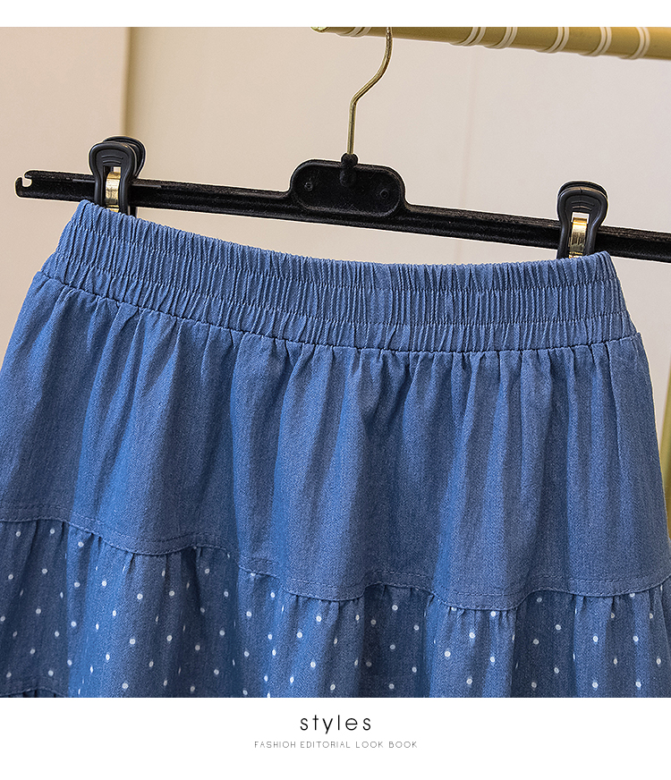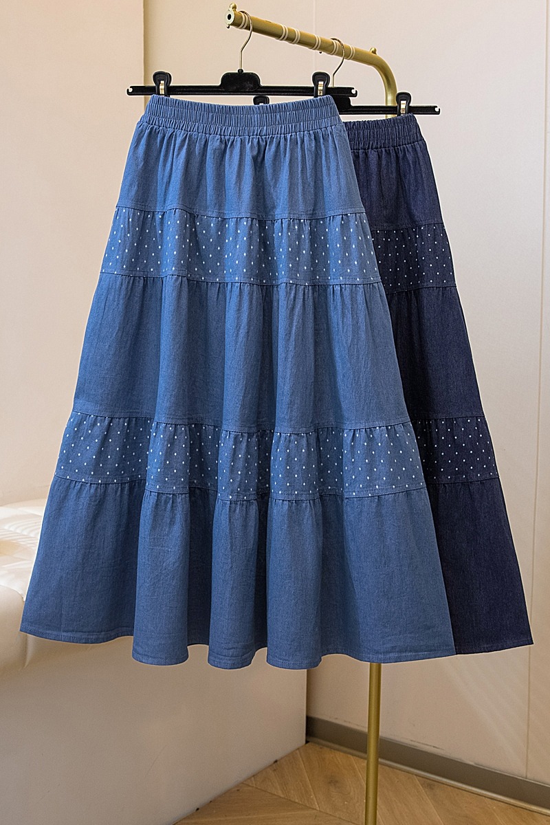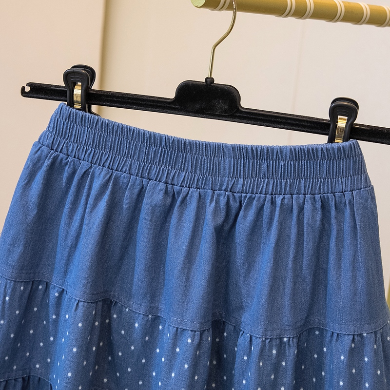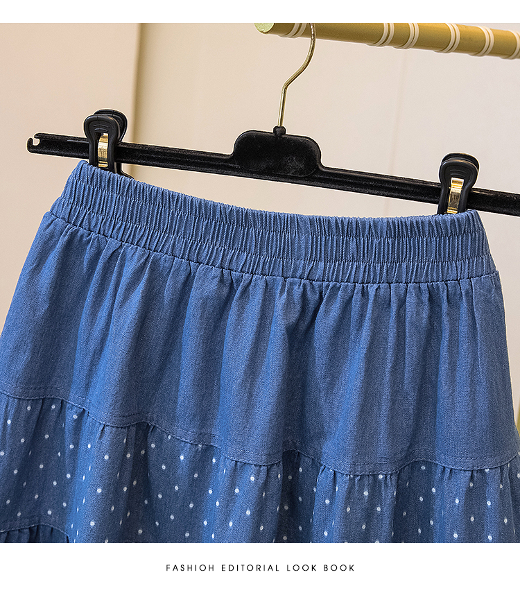 2026 봄 여름 새로운 빅 사이즈 얇은 데님 레트로 도트 무늬 프린트 데님 스커트 여성 허리밴드 소나무 슬림해 보이는 A라인 스커트