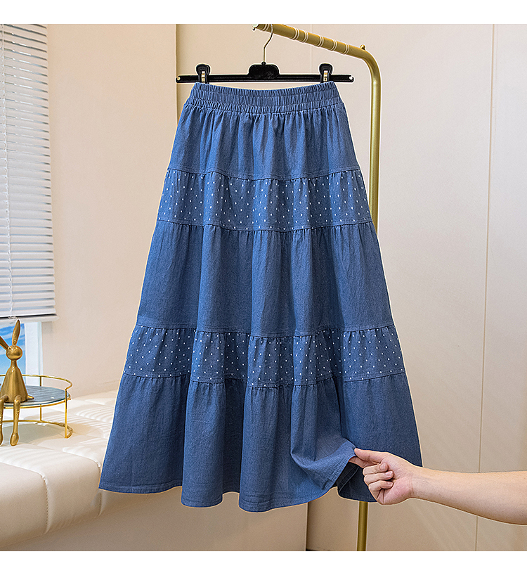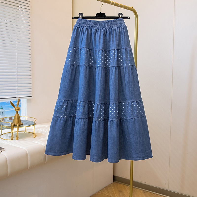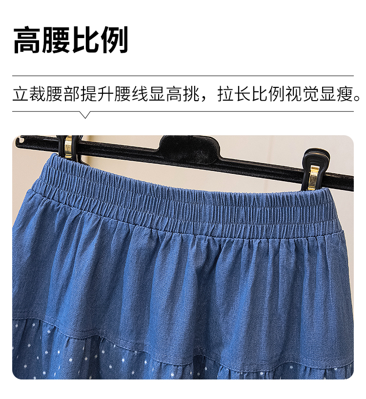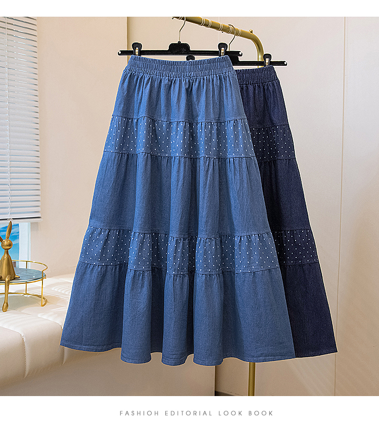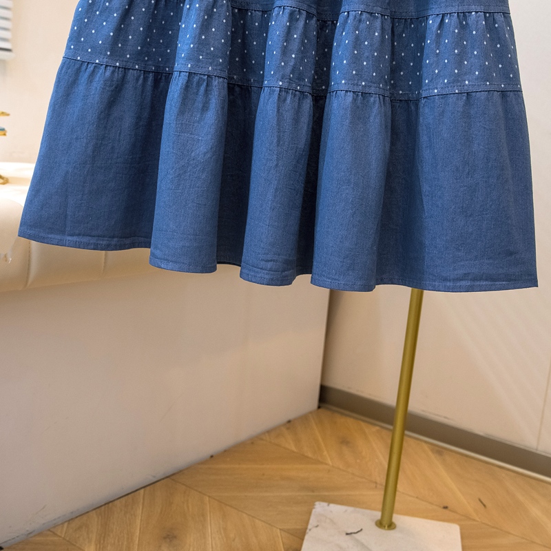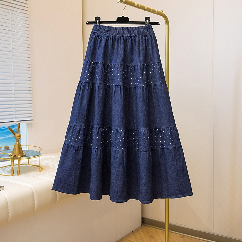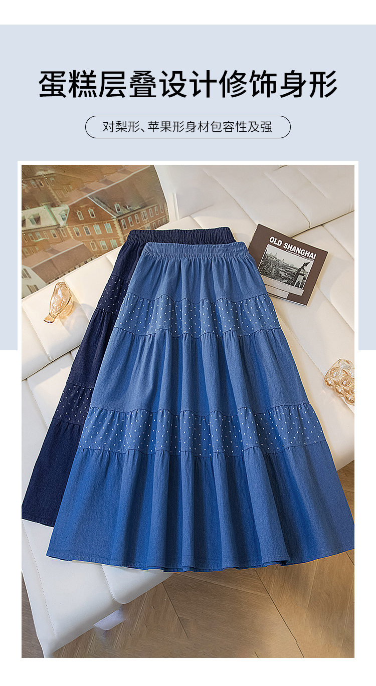 2026 봄 여름 새로운 빅 사이즈 얇은 데님 레트로 도트 무늬 프린트 데님 스커트 여성 허리밴드 소나무 슬림해 보이는 A라인 스커트
