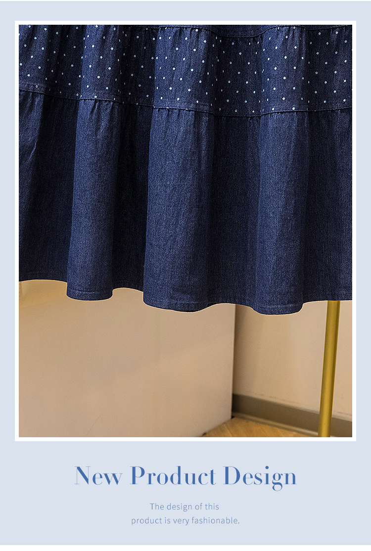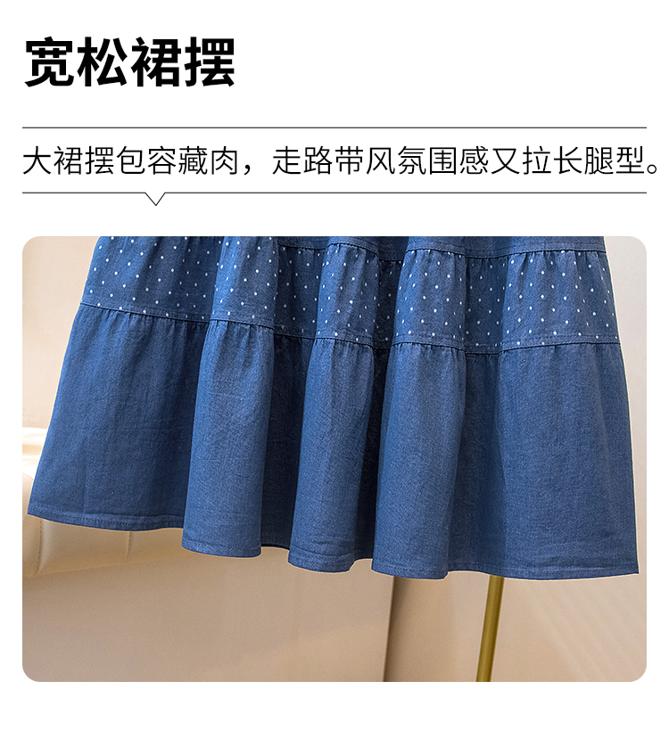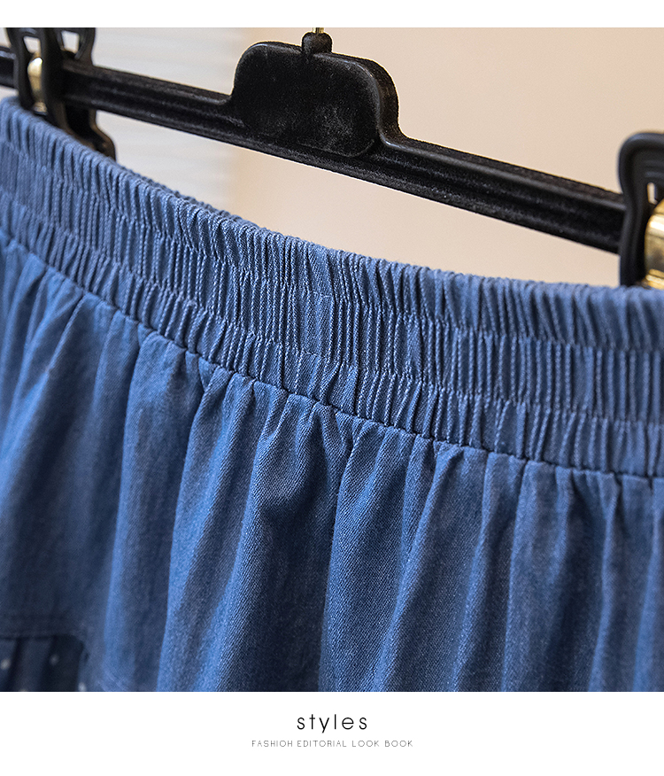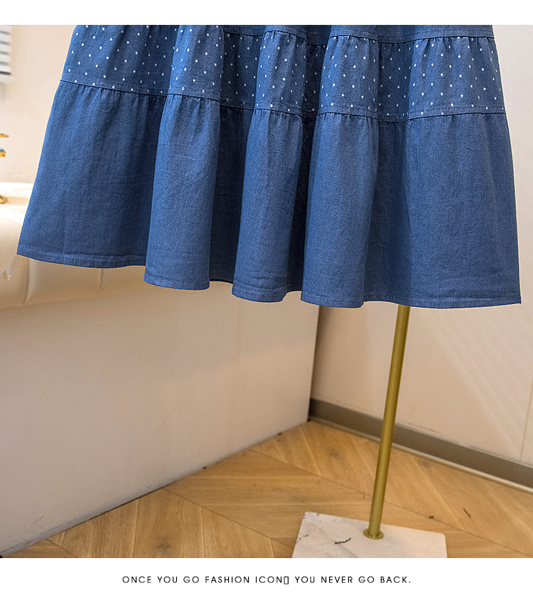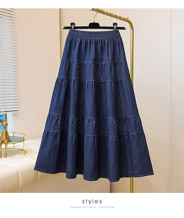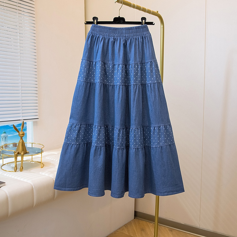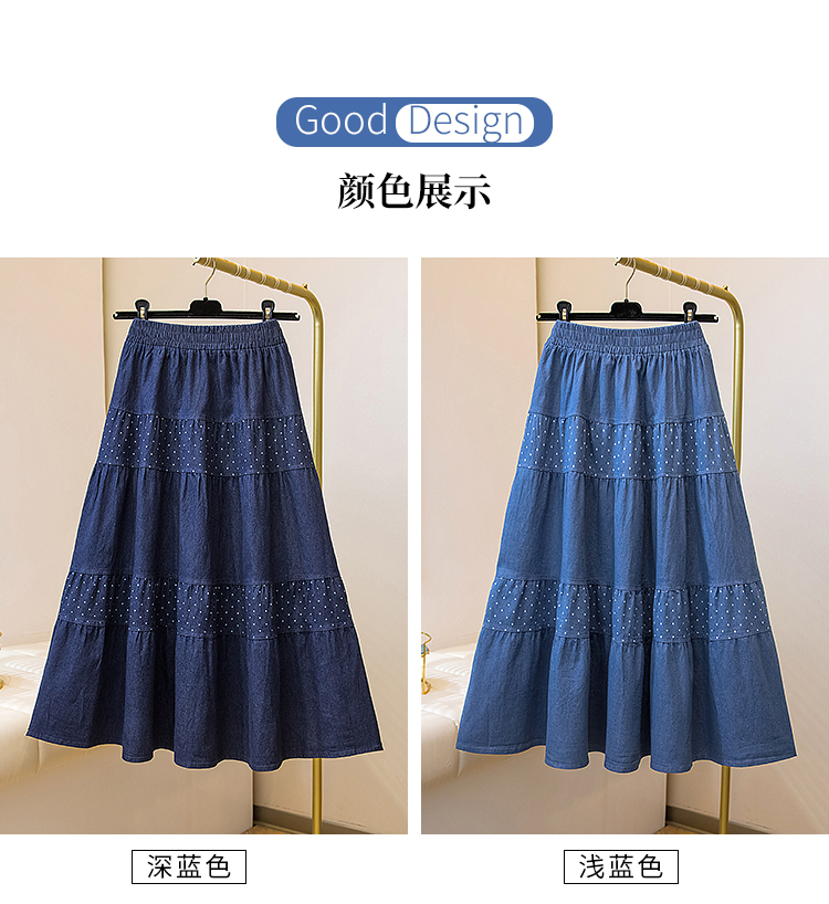 2026 봄 여름 새로운 빅 사이즈 얇은 데님 레트로 도트 무늬 프린트 데님 스커트 여성 허리밴드 소나무 슬림해 보이는 A라인 스커트