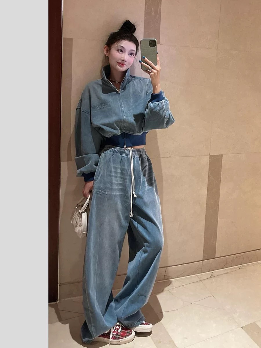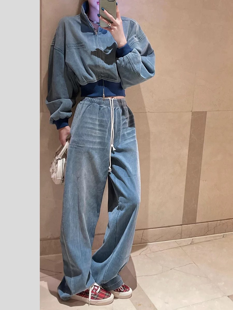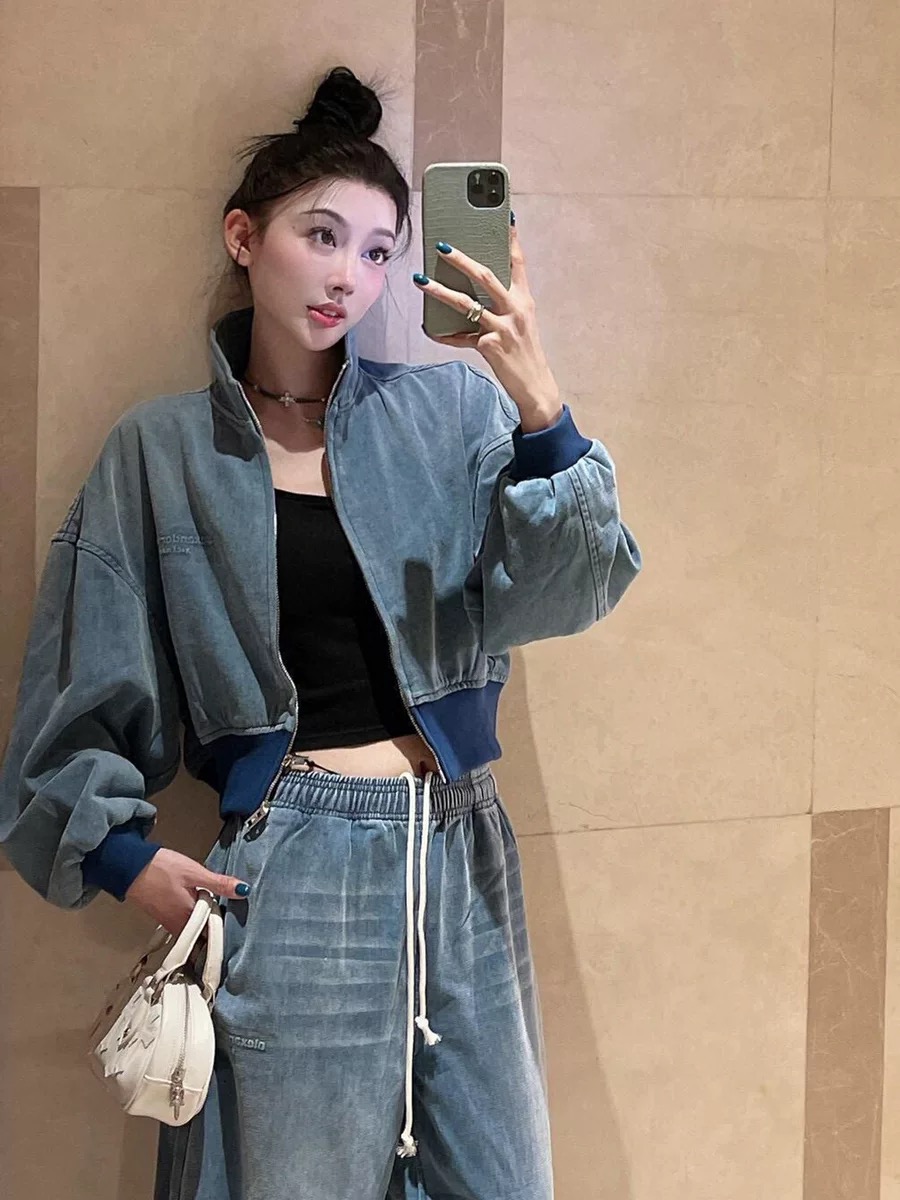 자이언트 잘 생긴 이른 봄 전체 집합 감기 느슨함 센스 miu 부서 착용 가져 가라. 파란색 데님 야구 유니폼 와이드 레그 팬츠 세트