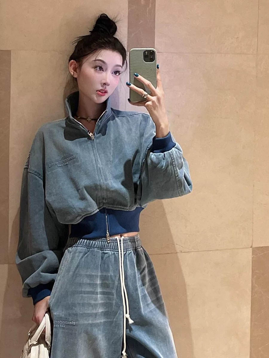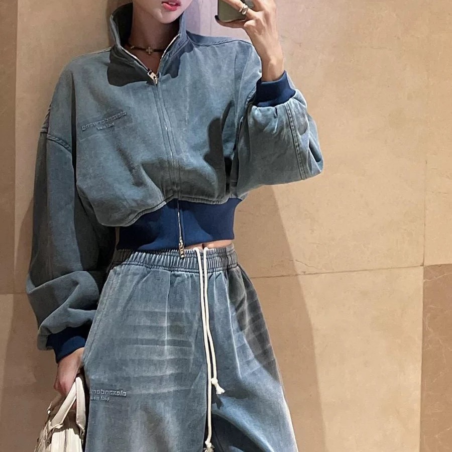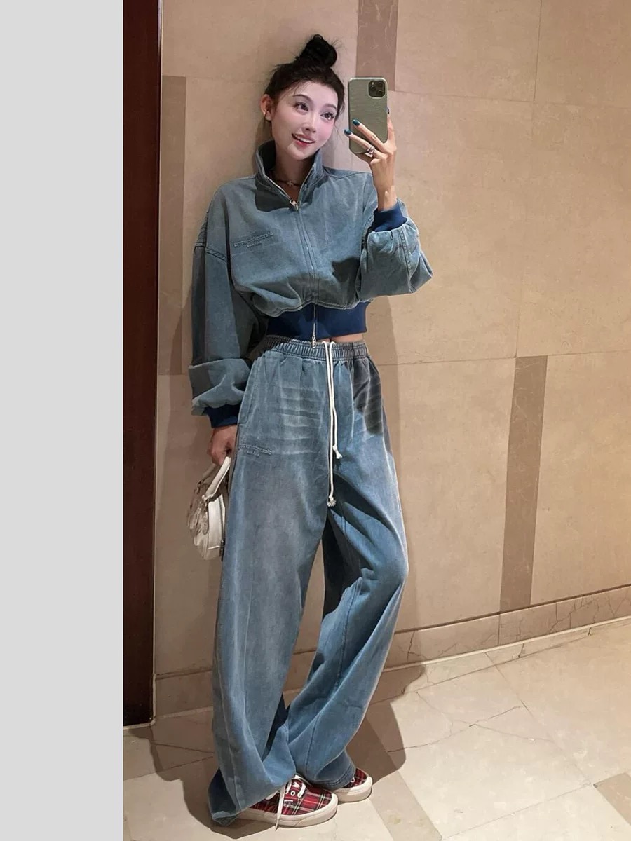 자이언트 잘 생긴 이른 봄 전체 집합 감기 느슨함 센스 miu 부서 착용 가져 가라. 파란색 데님 야구 유니폼 와이드 레그 팬츠 세트
