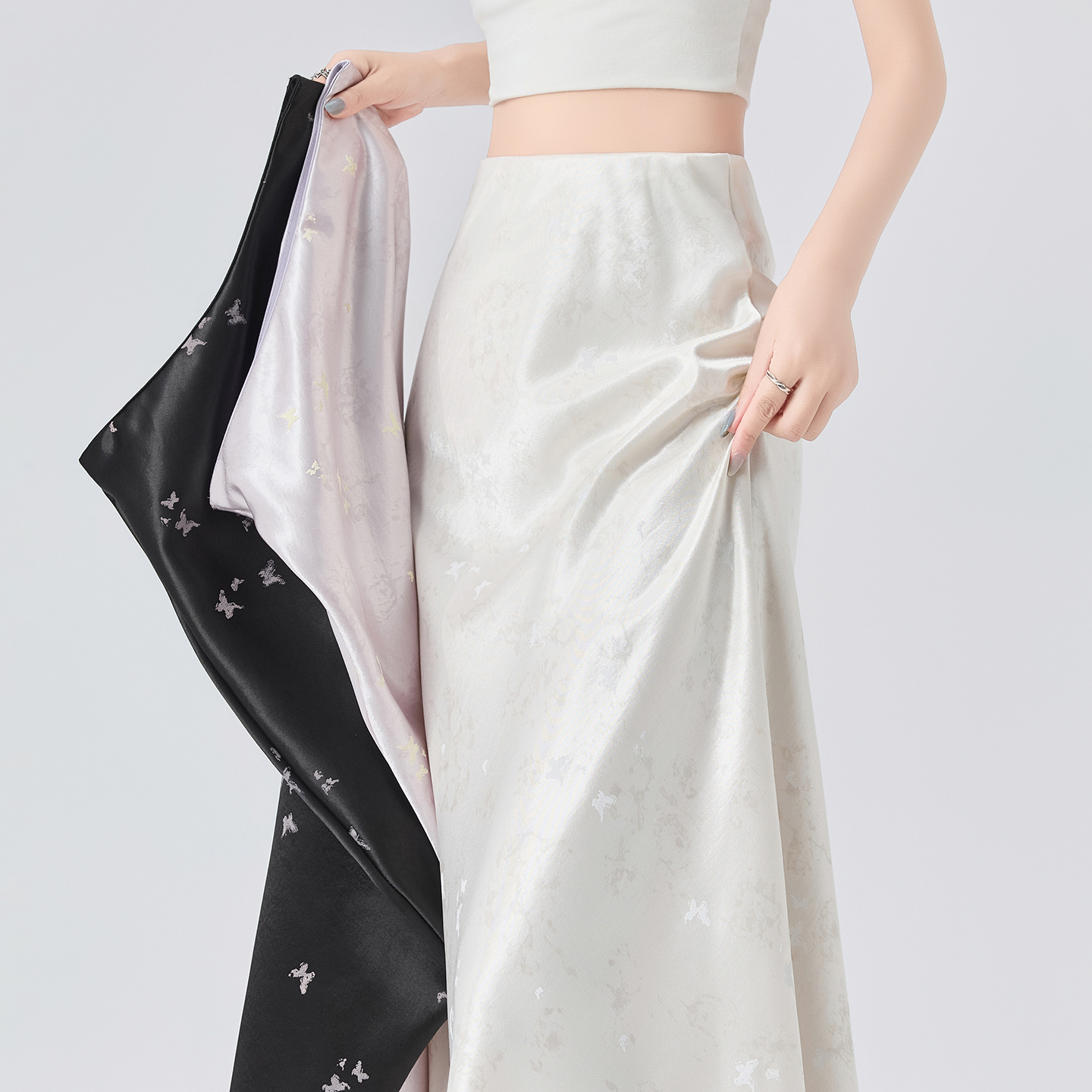 실사 아세트산 새틴 나비 프린트 반신 스커트 여성 여름 2026 새로운 도루 센스 한 마디 타이트 스커트 인어 꼬리 롱 스커트