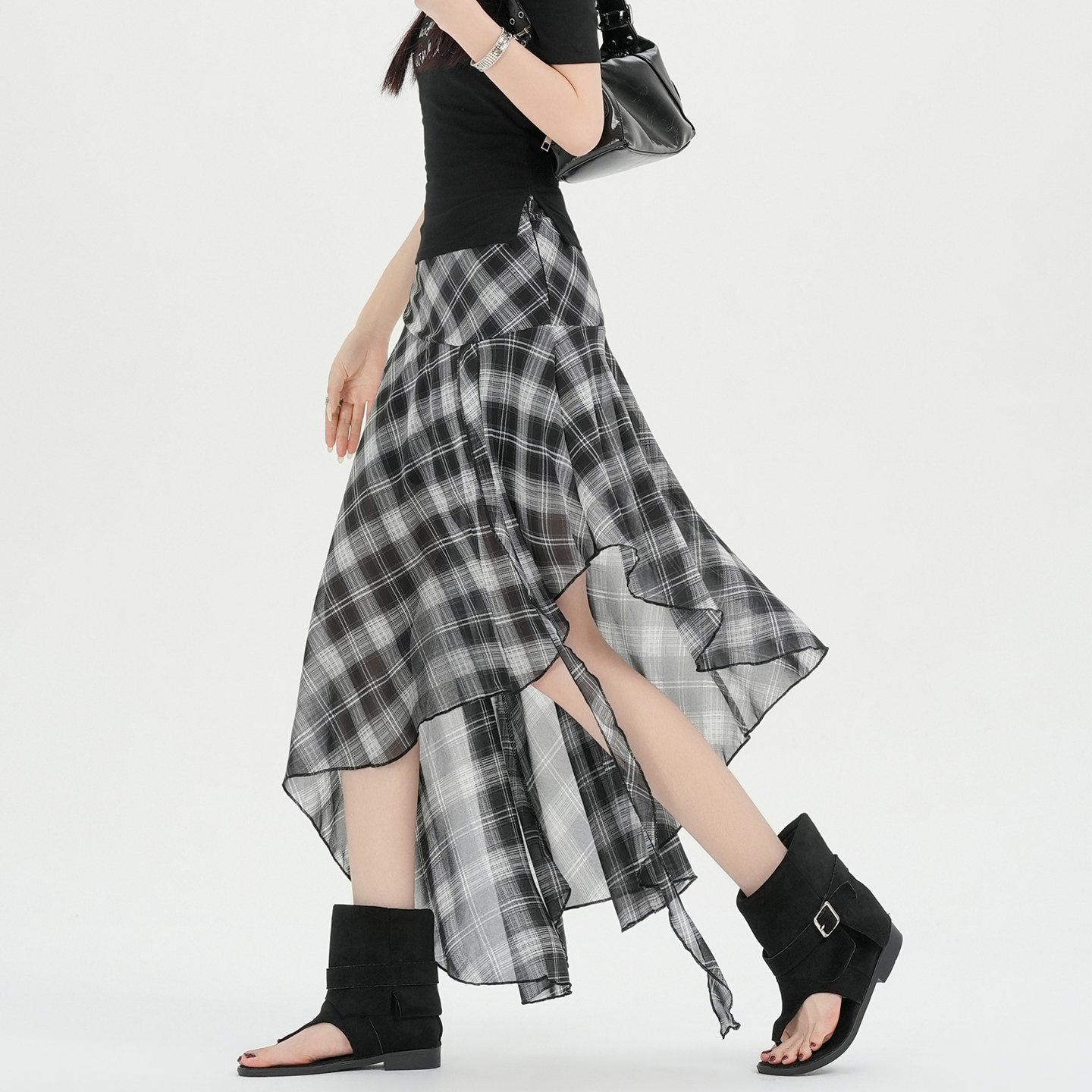 실사 한국 스타일 불규칙 체크무늬 반신 스커트 여성 여름 2026 새로운 레트로 몸매 가꾸기 슬림해 보이는 하이웨이스트 반 스커트 여성