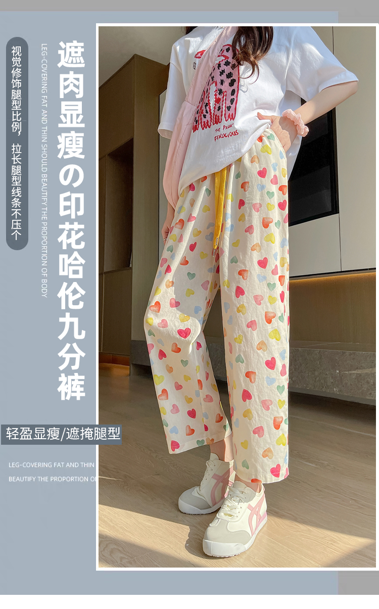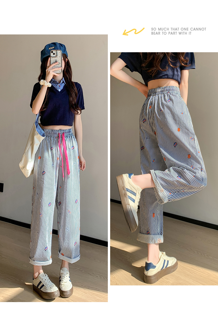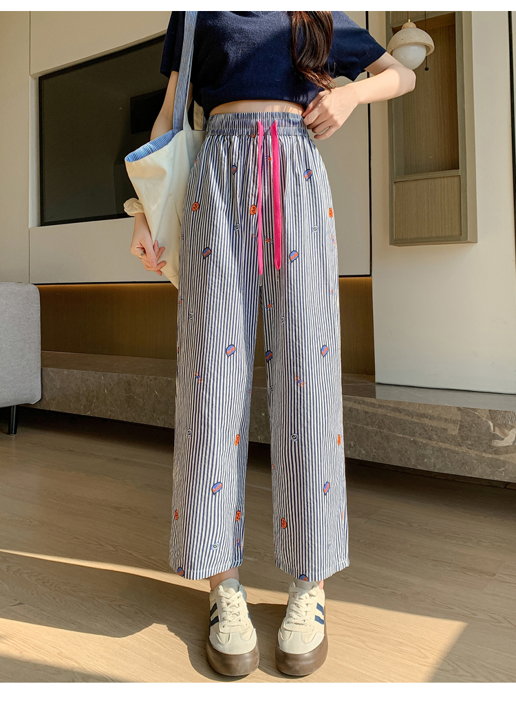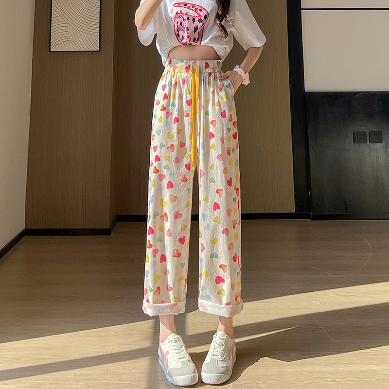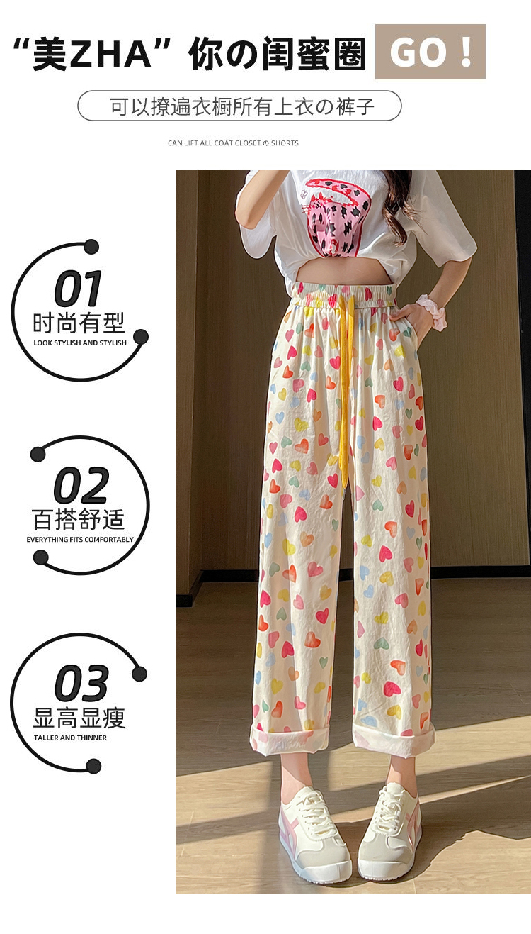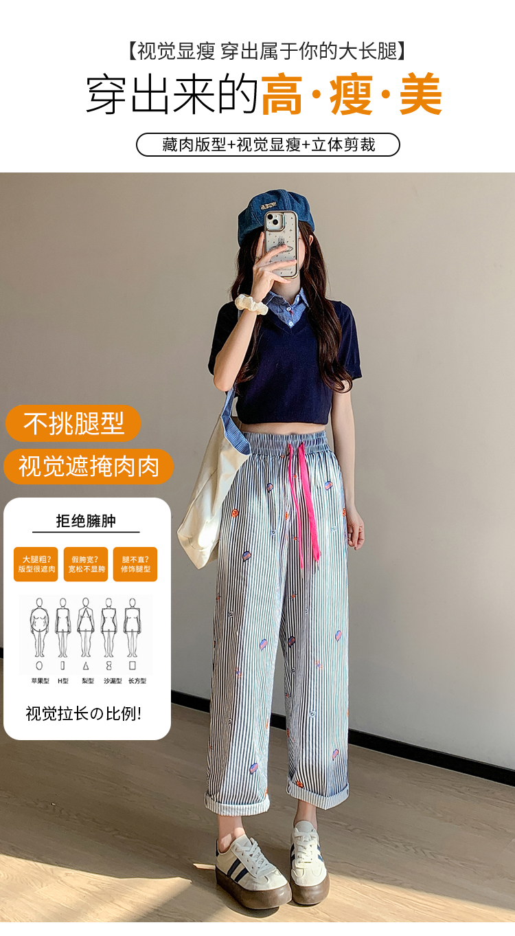 실사 여름 새로운 워시 물 면 밴딩 하이웨이스트 슬림해 보이는 루즈핏 캐주얼 스트레이트 도루 센스 와이드 레그 팬츠 9부 바지 여성