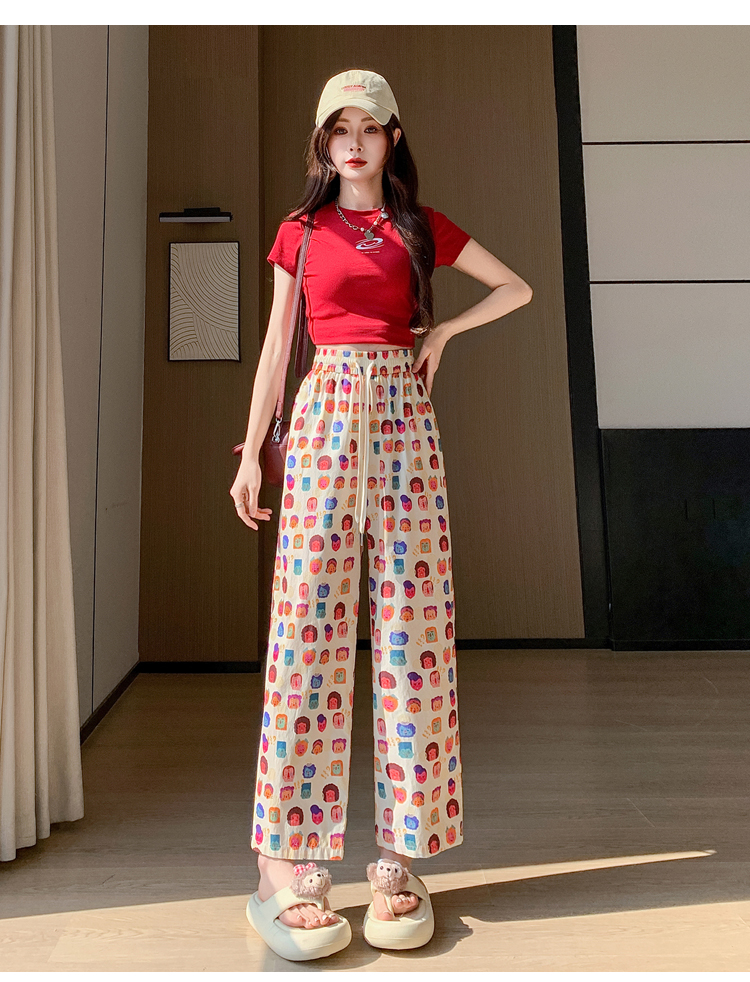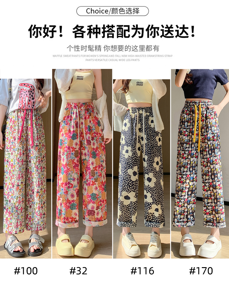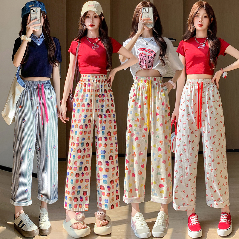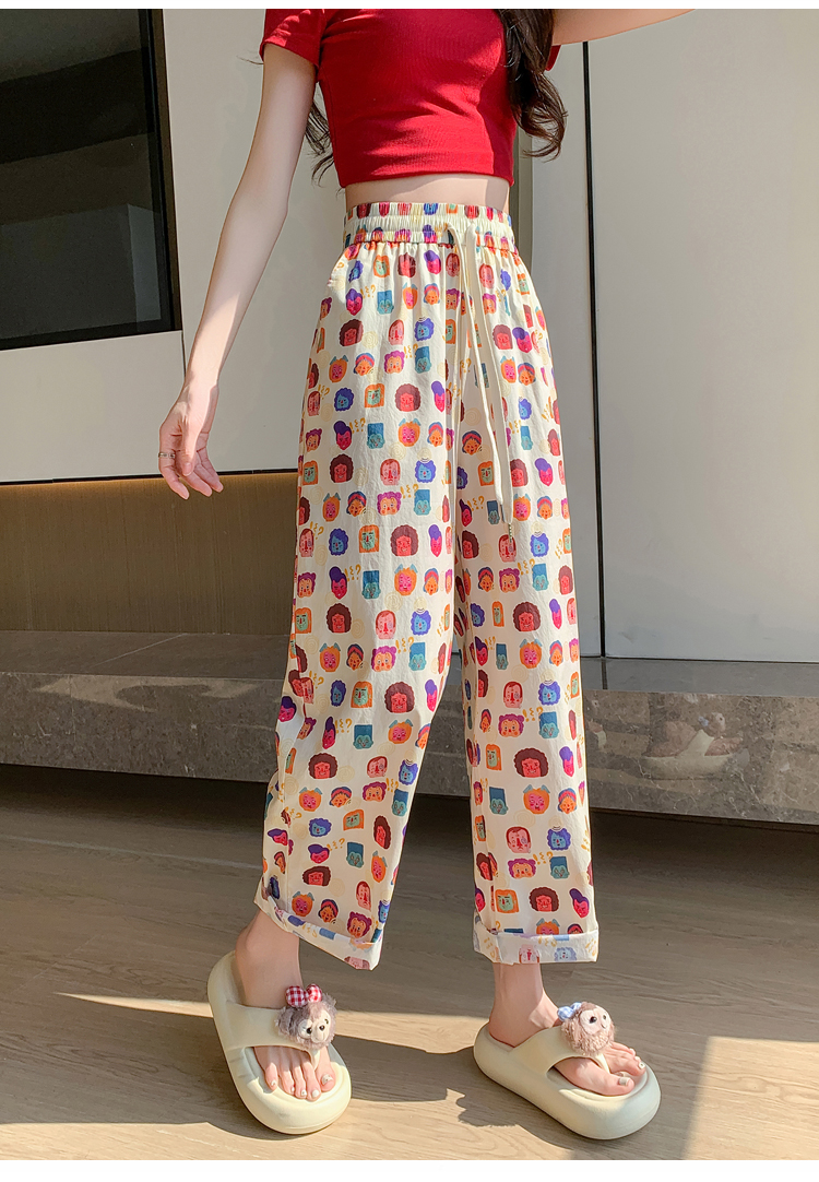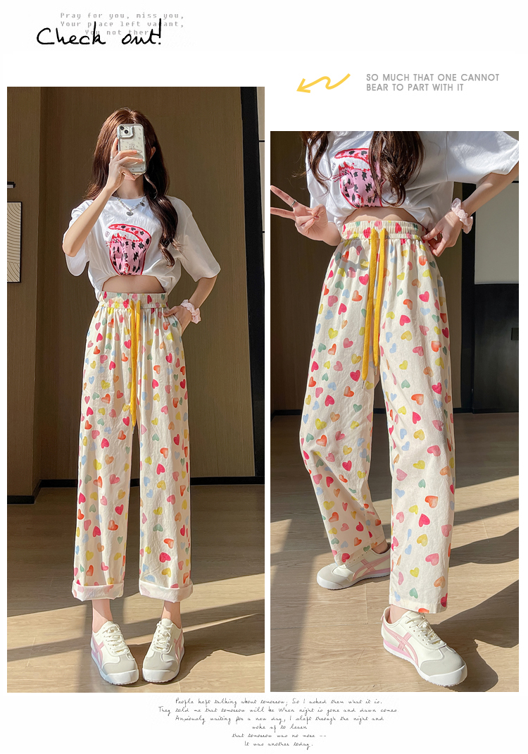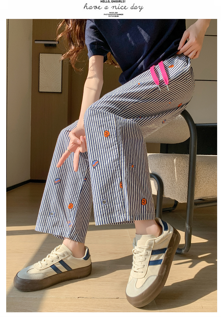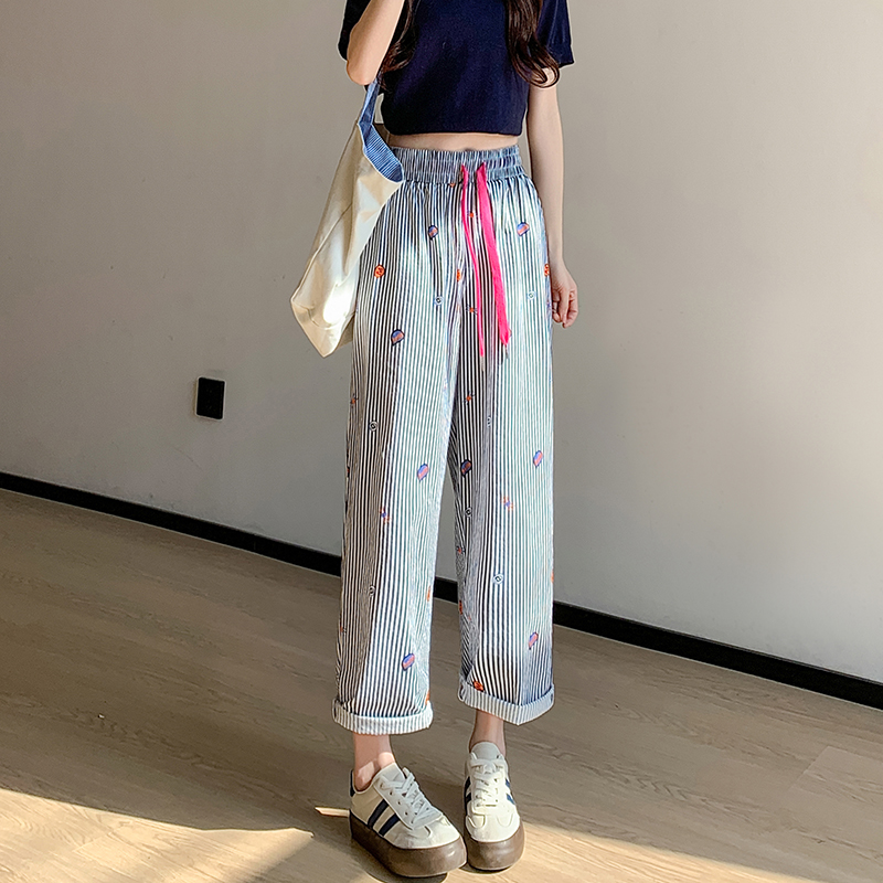 실사 여름 새로운 워시 물 면 밴딩 하이웨이스트 슬림해 보이는 루즈핏 캐주얼 스트레이트 도루 센스 와이드 레그 팬츠 9부 바지 여성
