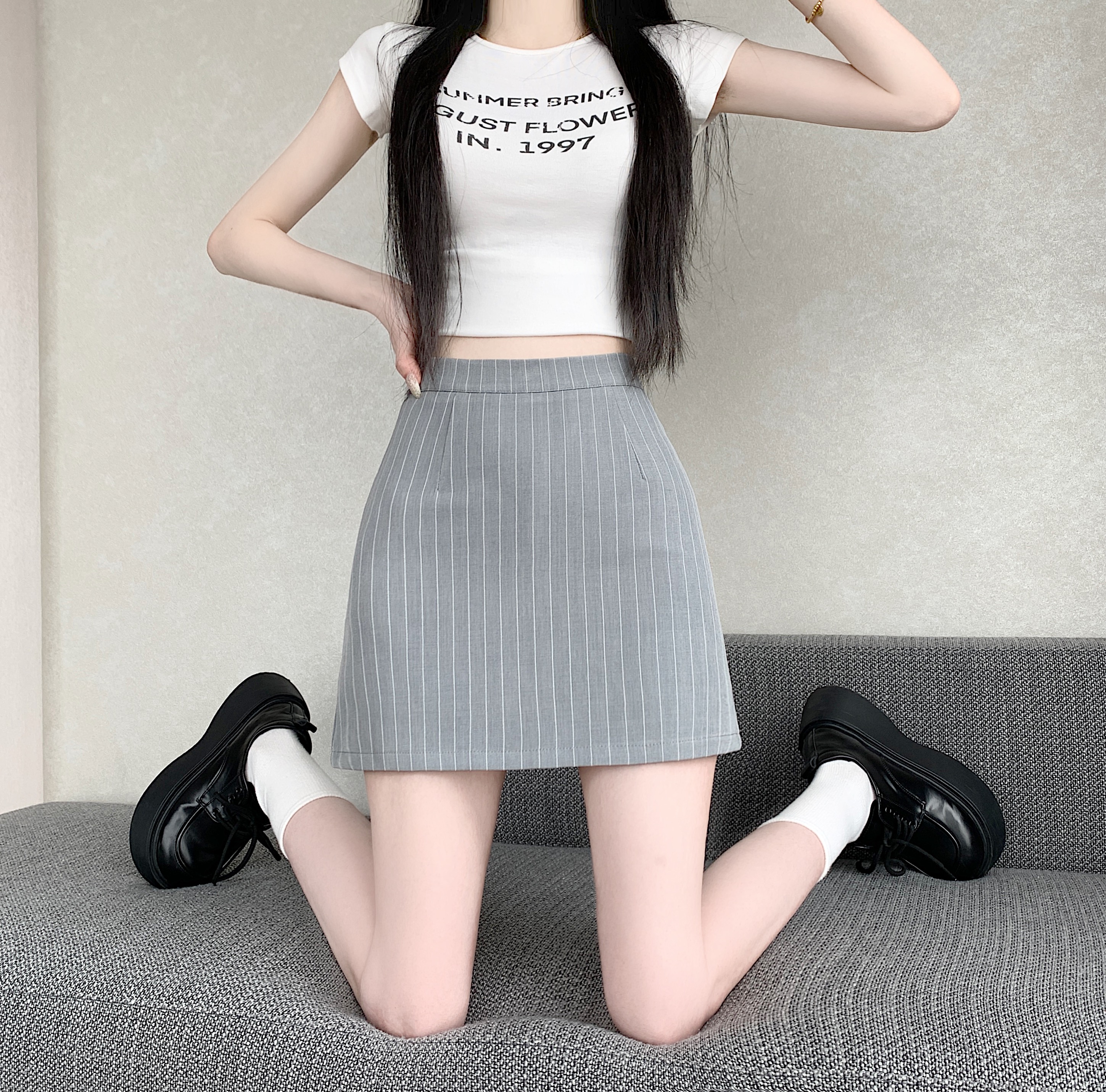 실사 2026 년 여름 새로운 반신 스커트 패션 몸매 가꾸기 스트라이프 정장 치마