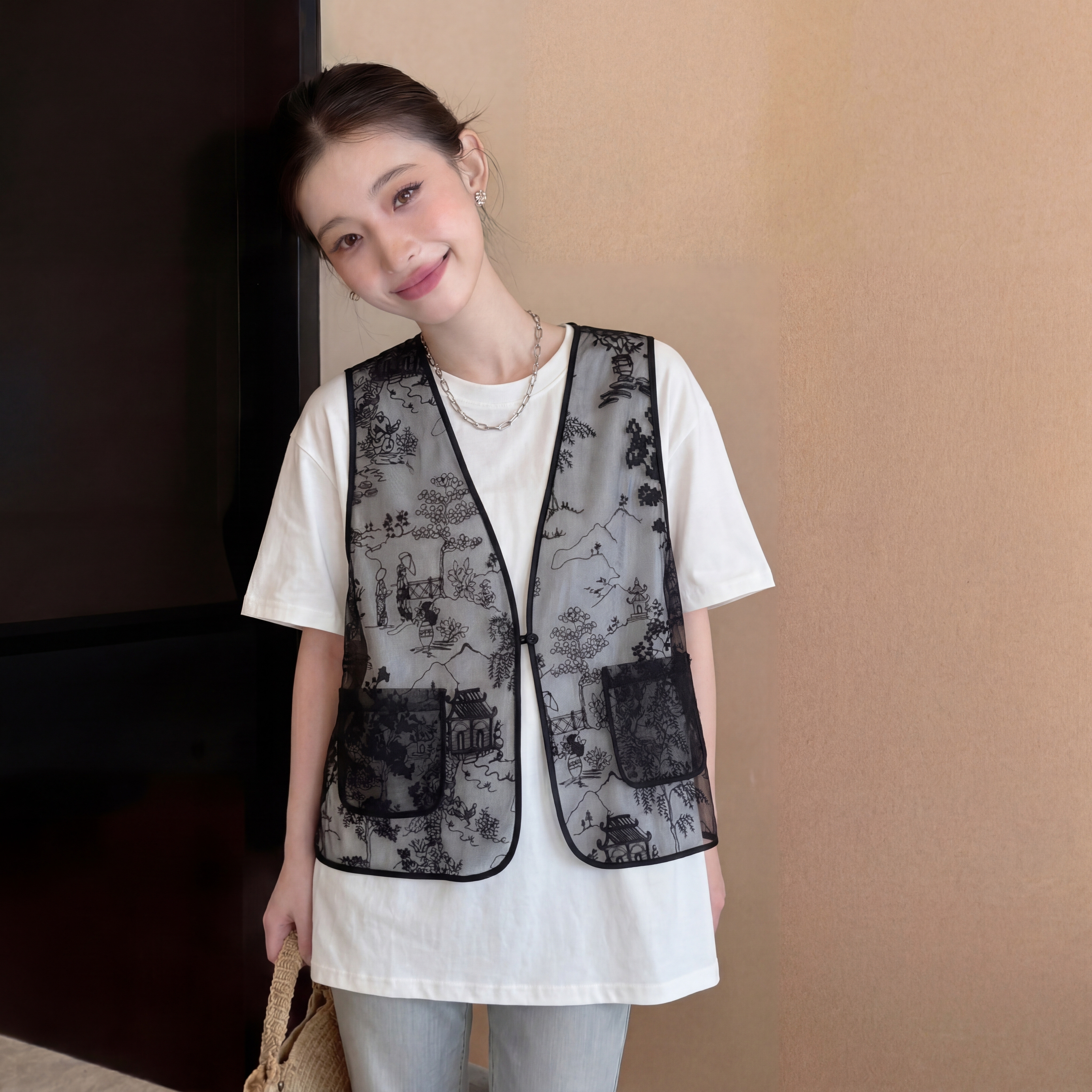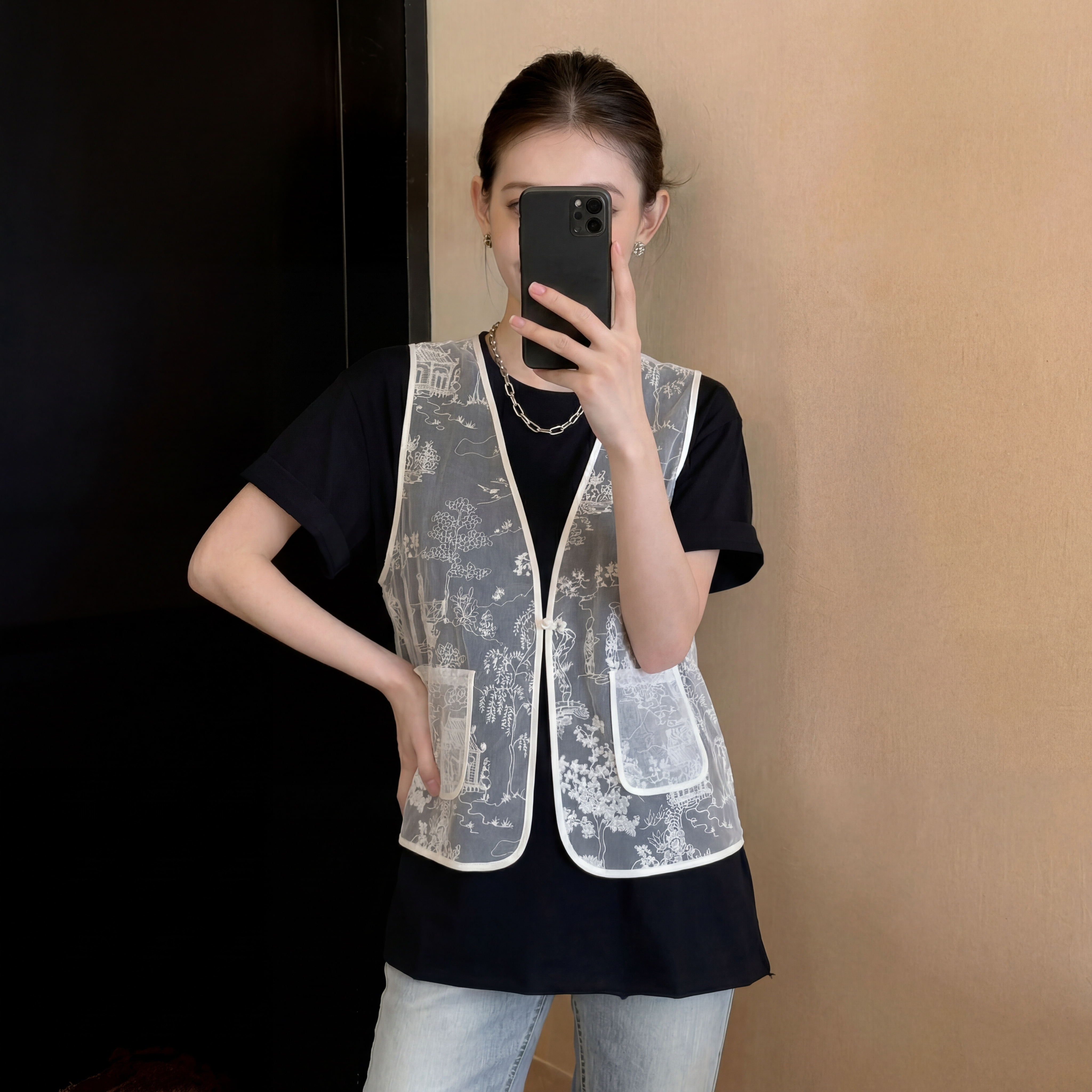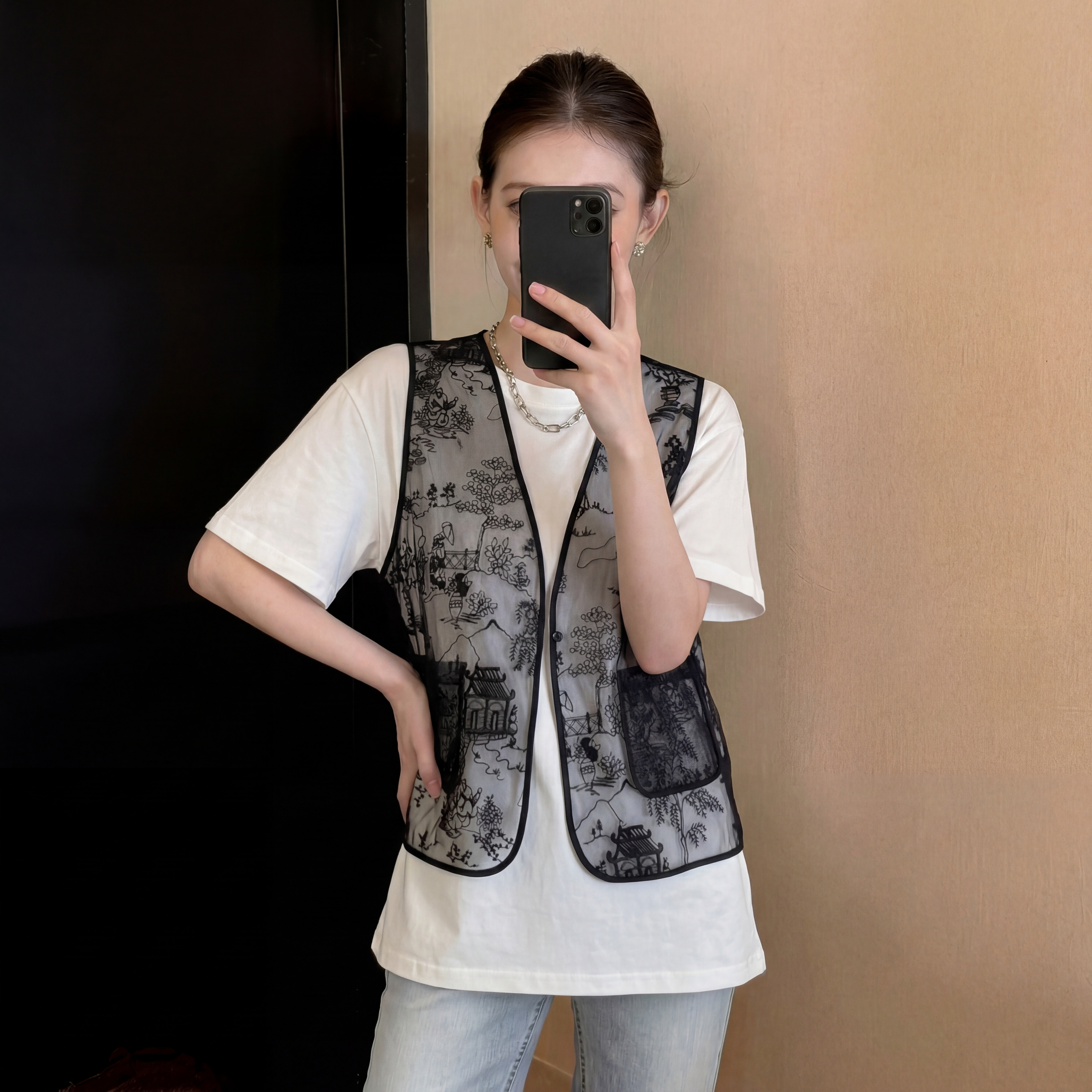 실사 빅 사이즈 새로운 디자인 센스 지방 mm 국가 트렌디 빛 럭셔리 새로운 중국 스타일 망사 베스트 투피스 세트 맨위 여성