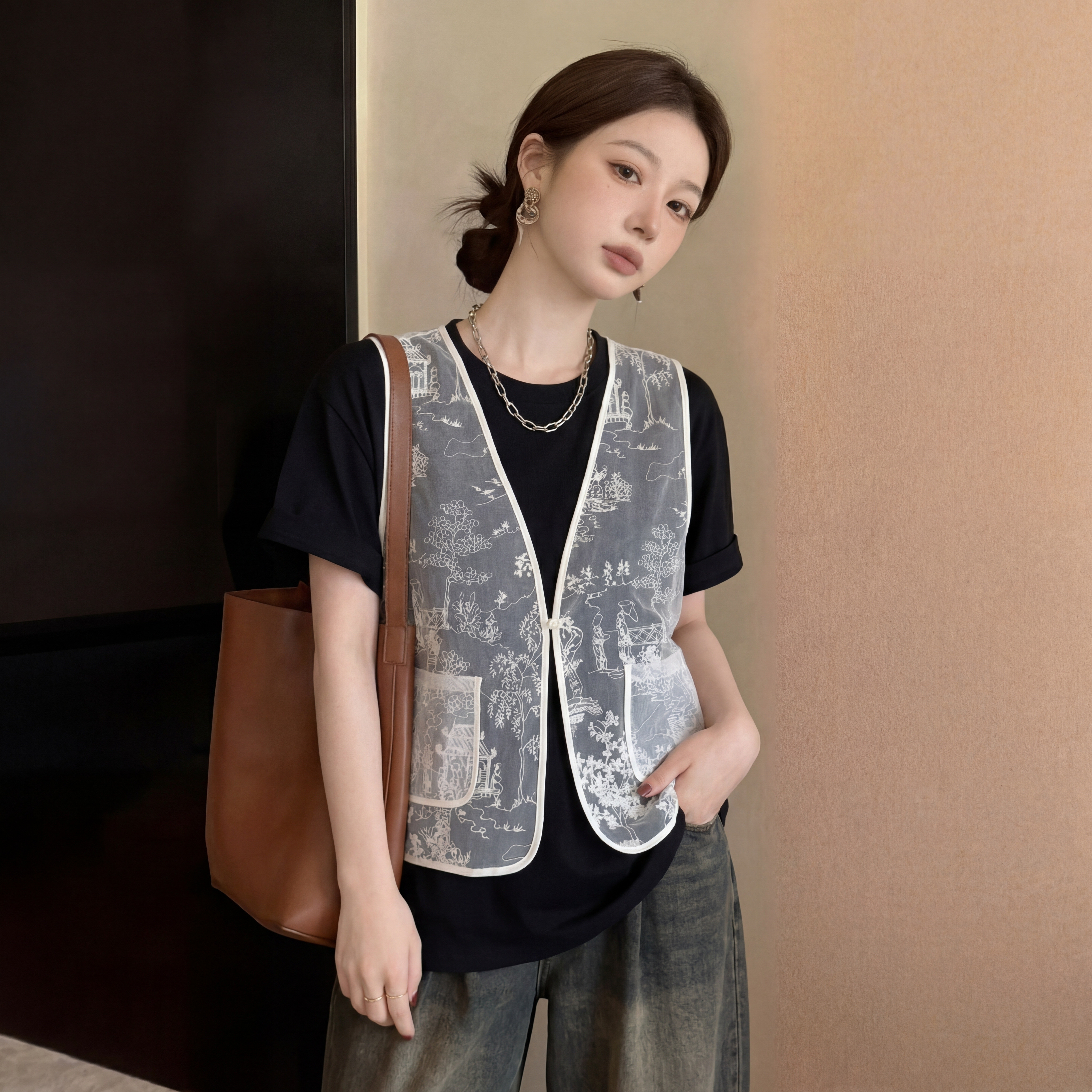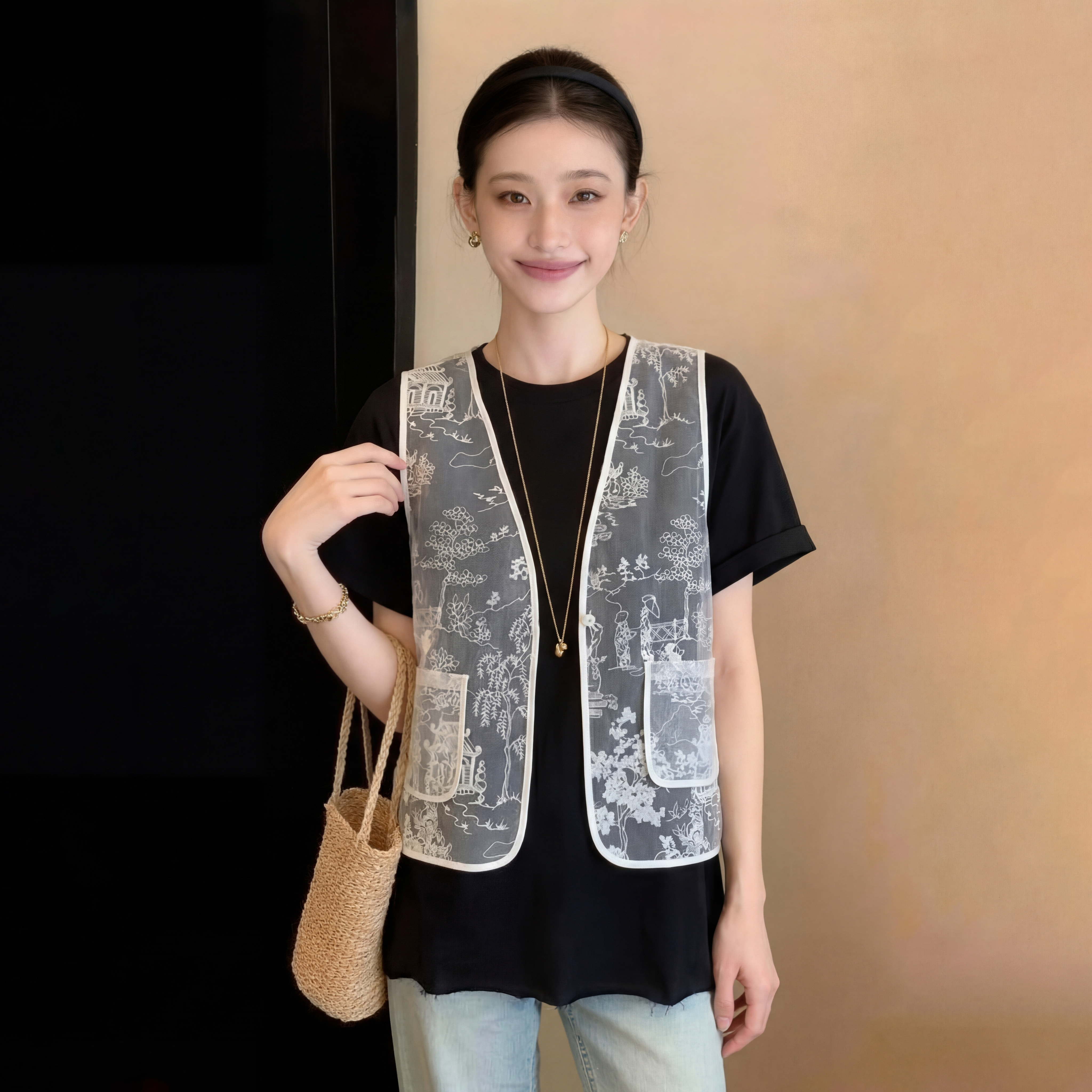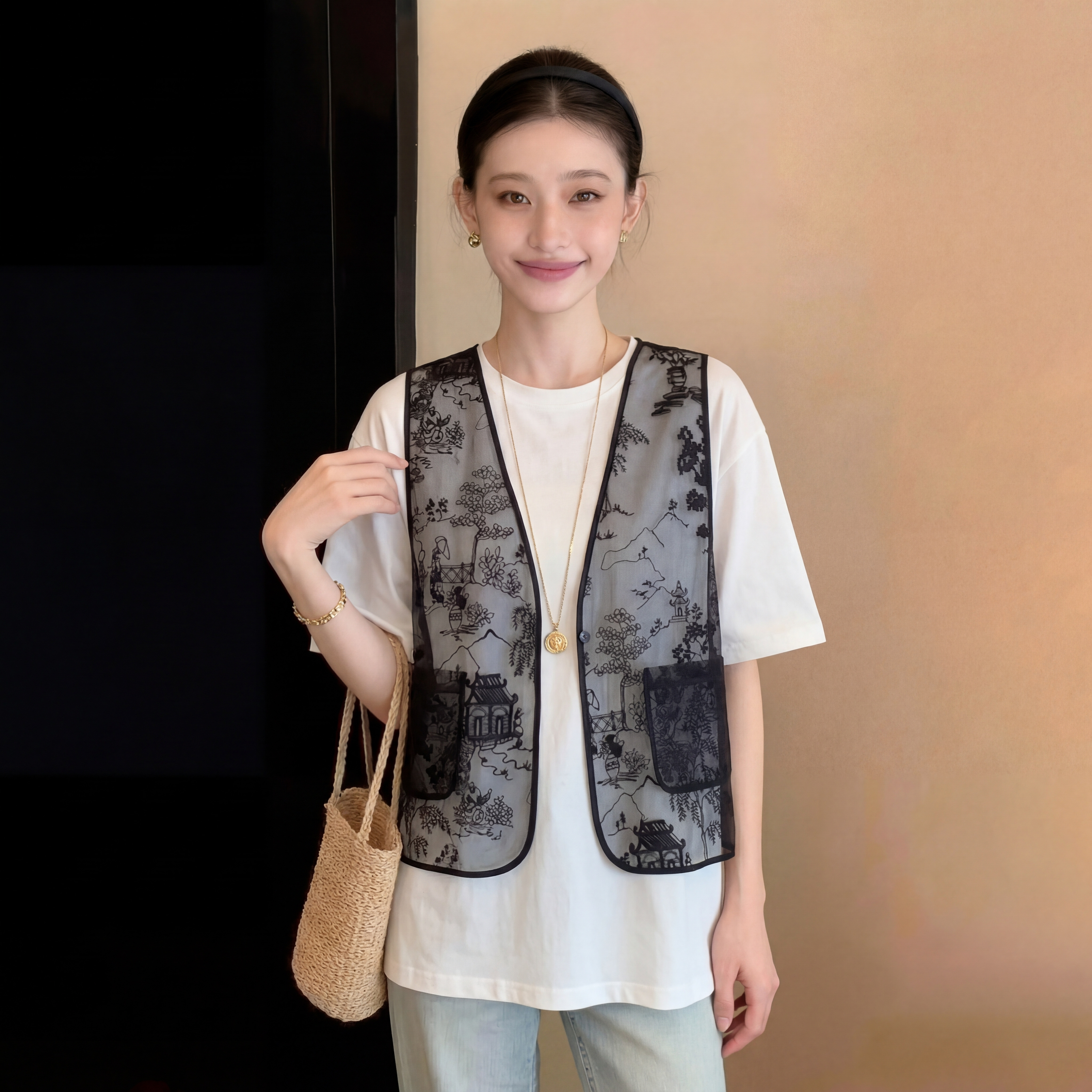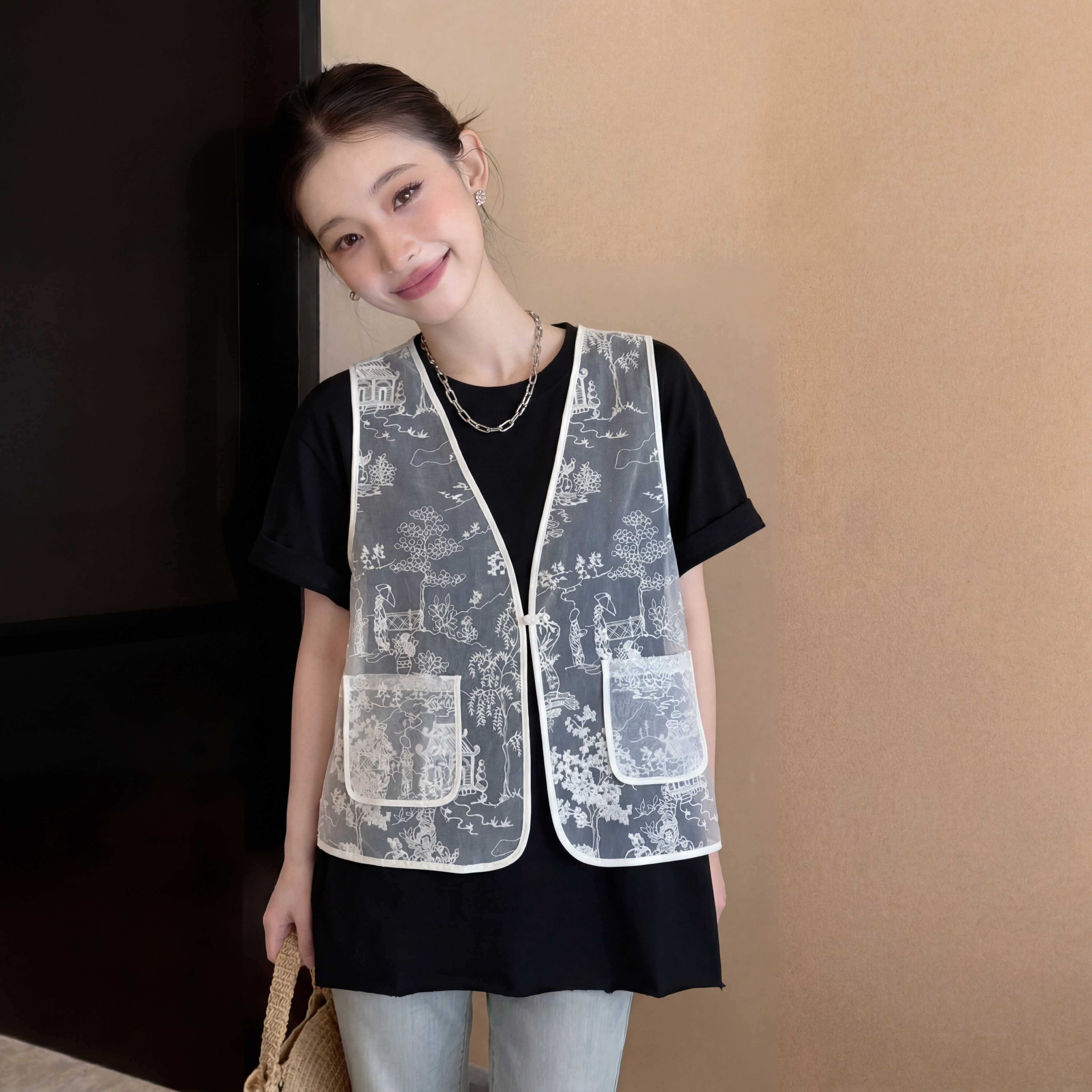 실사 빅 사이즈 새로운 디자인 센스 지방 mm 국가 트렌디 빛 럭셔리 새로운 중국 스타일 망사 베스트 투피스 세트 맨위 여성