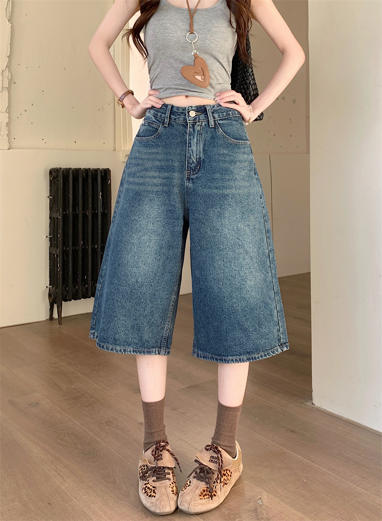 실사 아메리칸 레트로 워싱 높음 거리 청바지 여성 하이웨이스트 슬림해 보이는 스트레이트 넓은 다리 7부 바지 바지