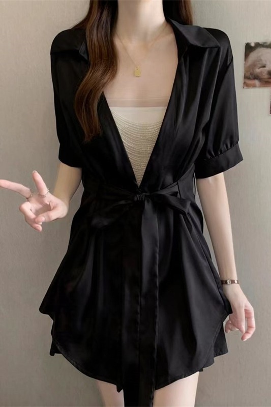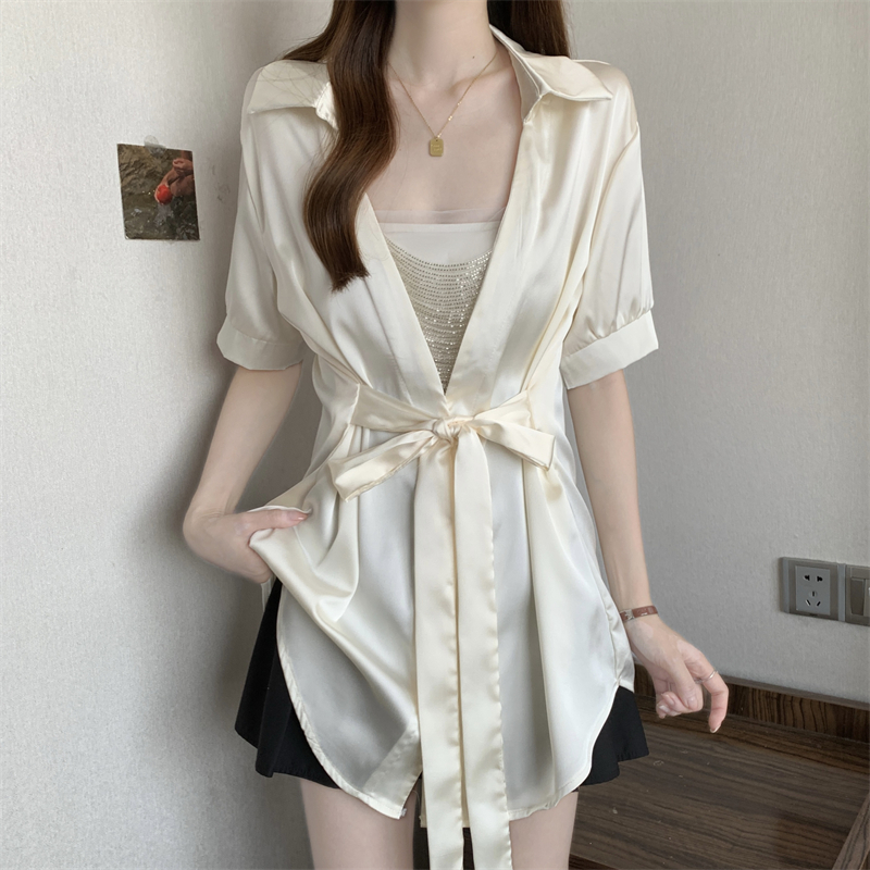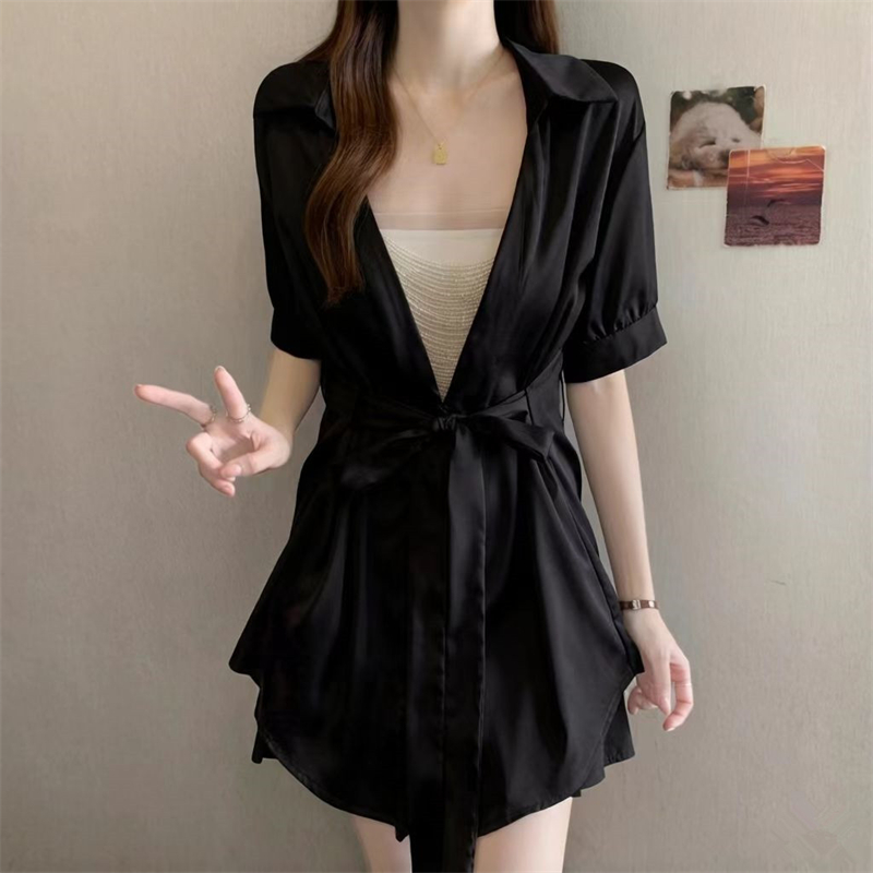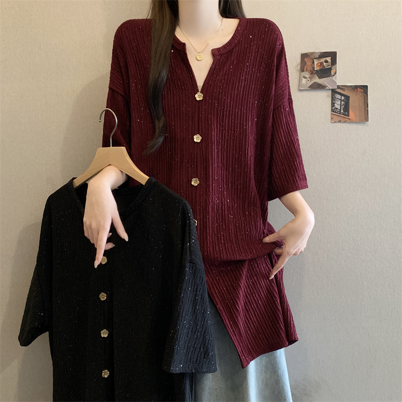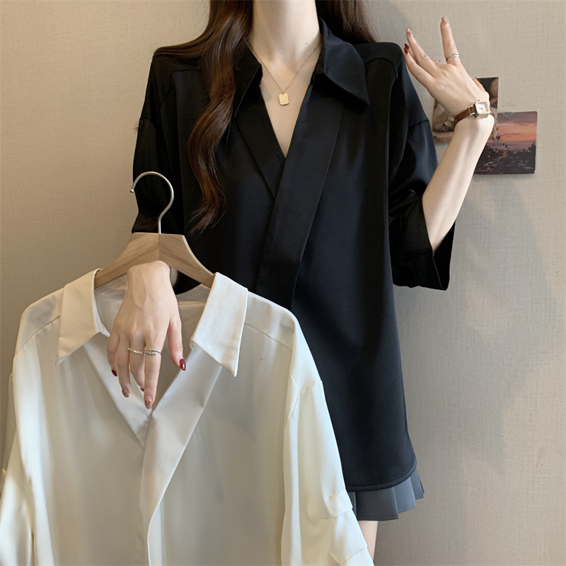 빅 사이즈 반팔 여성 셔츠 여름 새로운 지방 mm 아세트산 새틴 디자인 센스 작은 대중 불규칙 V넥 맨위