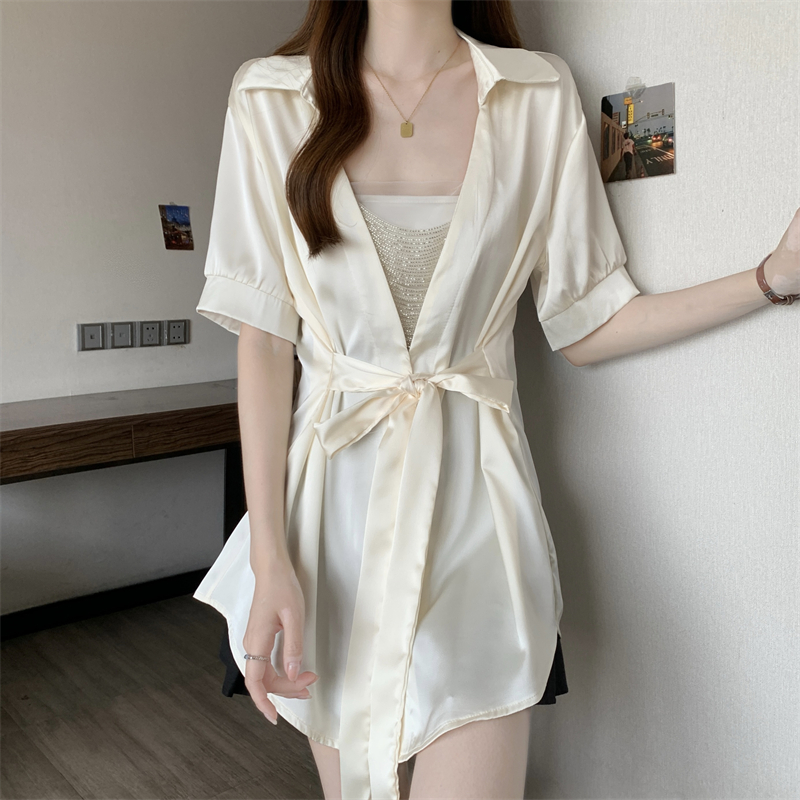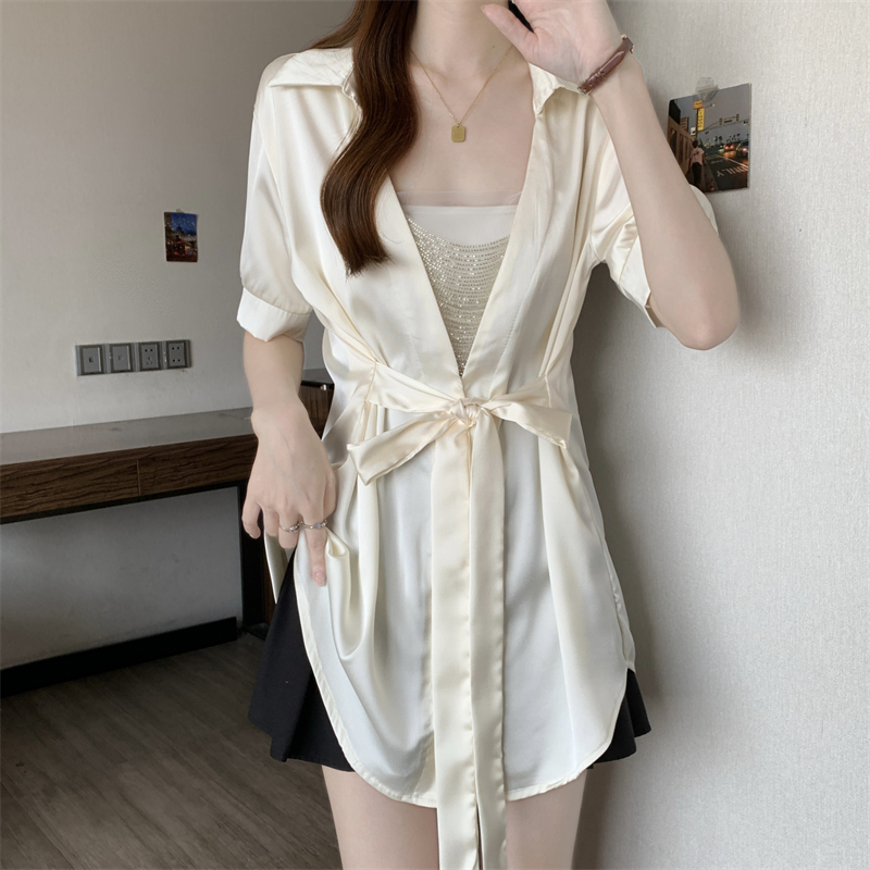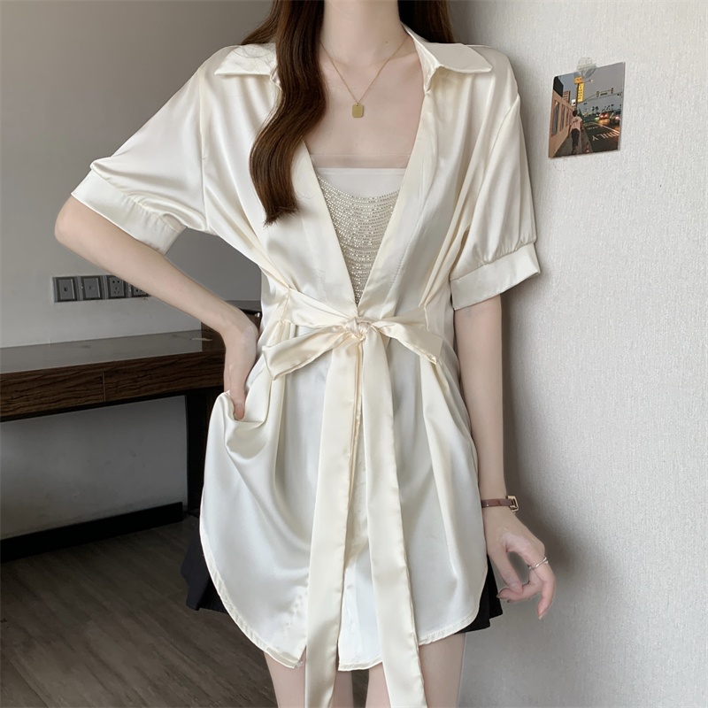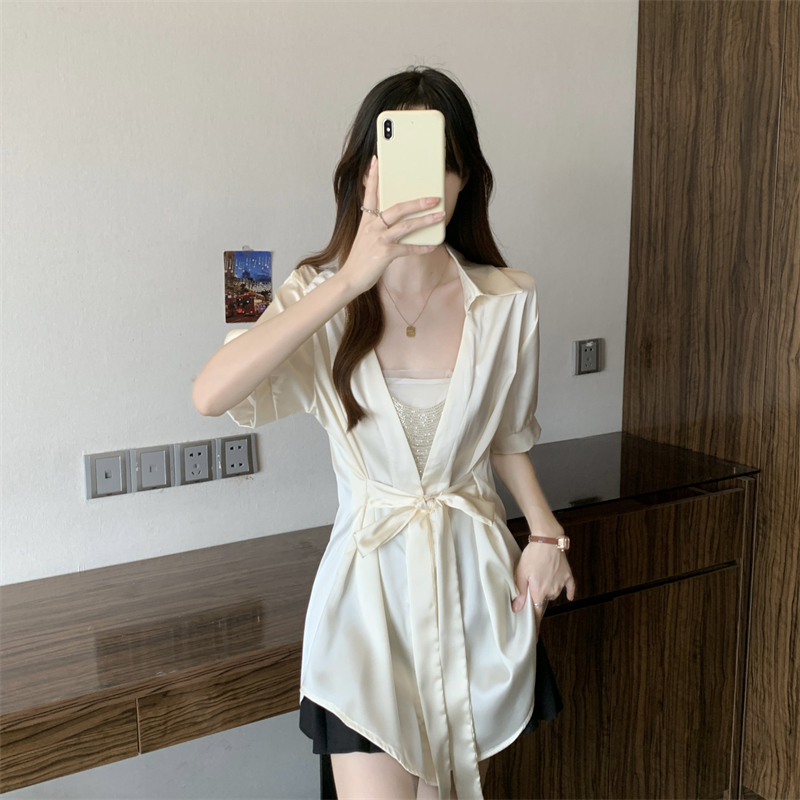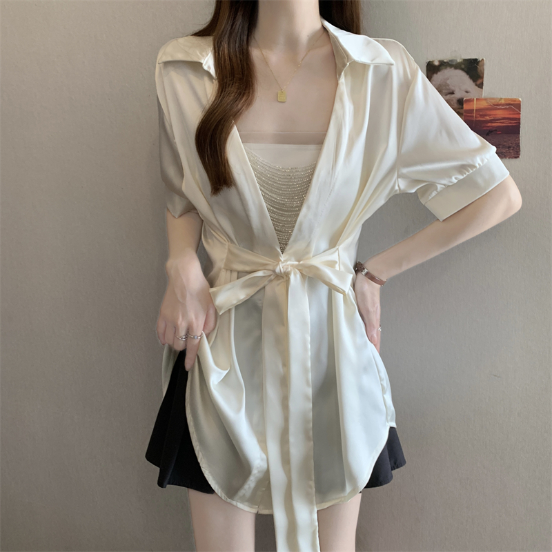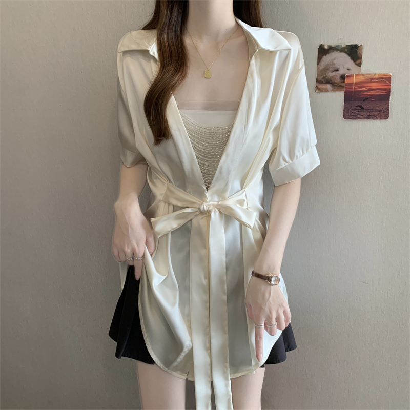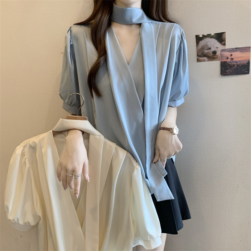 빅 사이즈 나비 매듭 여성 셔츠 여름 지방 mm 고급 센스 반팔 새틴 셔츠 쉬폰 톱
