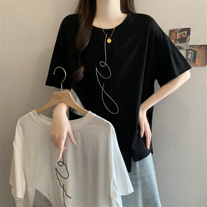 빅 사이즈 여성 의류 표지 배 불규칙 자수 반팔 티셔츠 여성 여름 통통한 여동생 루즈핏 슬림해 보이는 긍정적 인 어깨 의류