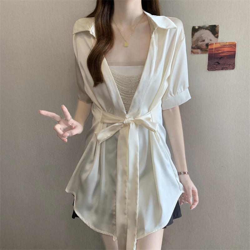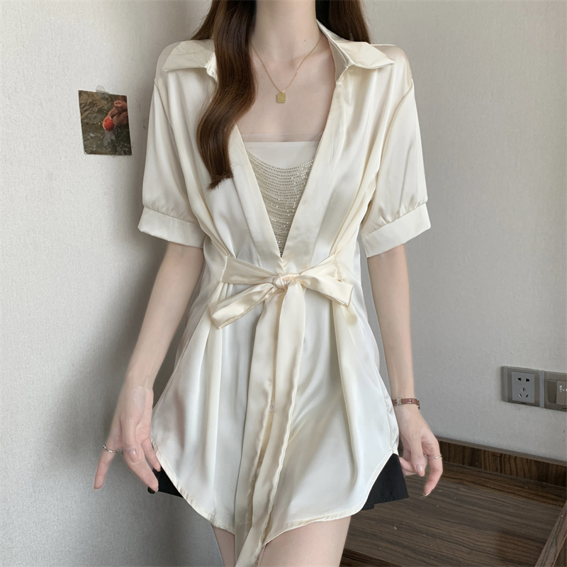 빅 사이즈 셔츠 세트 여성 여름 새로운 품격 허리 수축 POLO 칼라 셔츠 맨위 캐주얼 반바지 투피스 세트