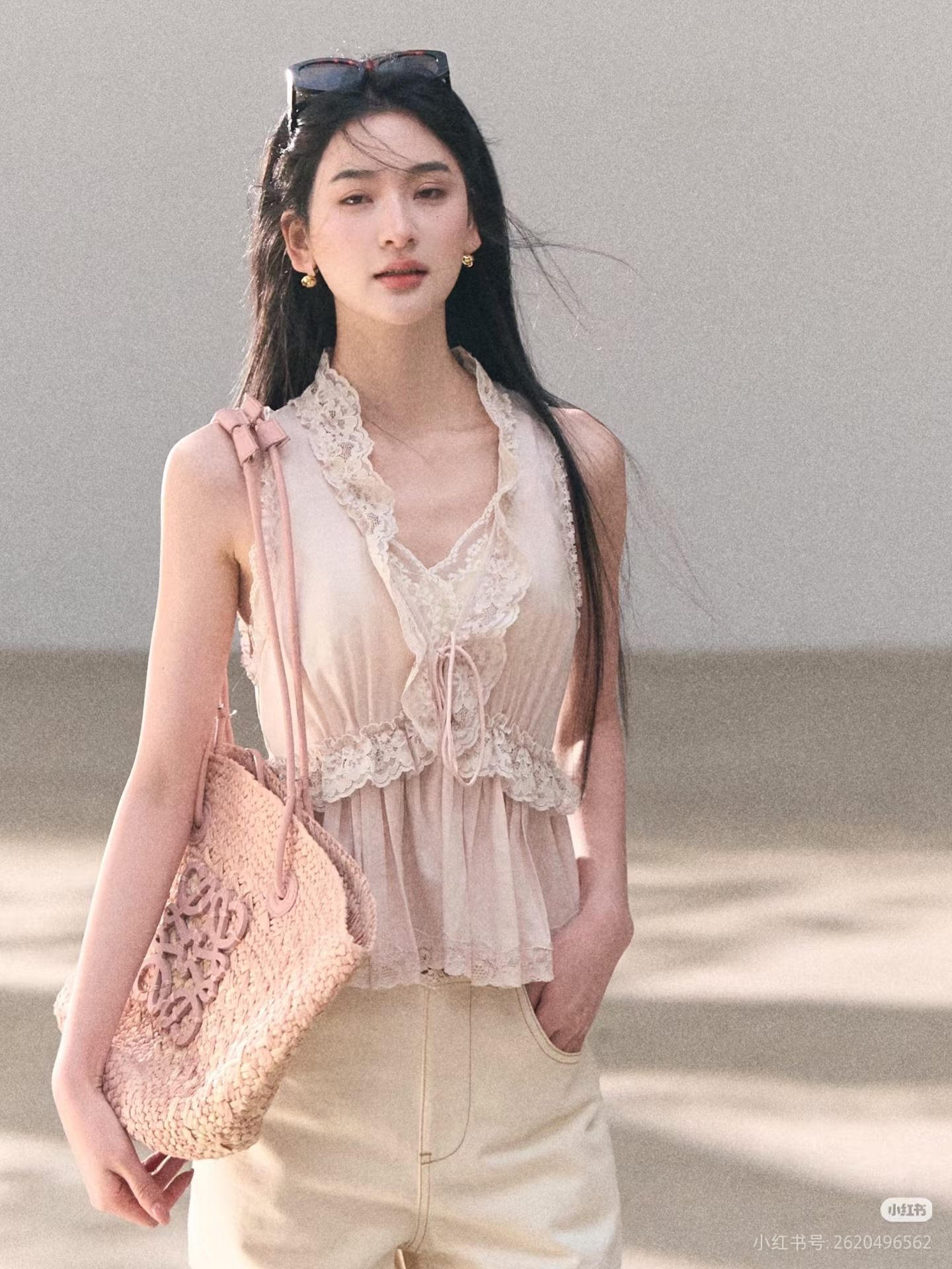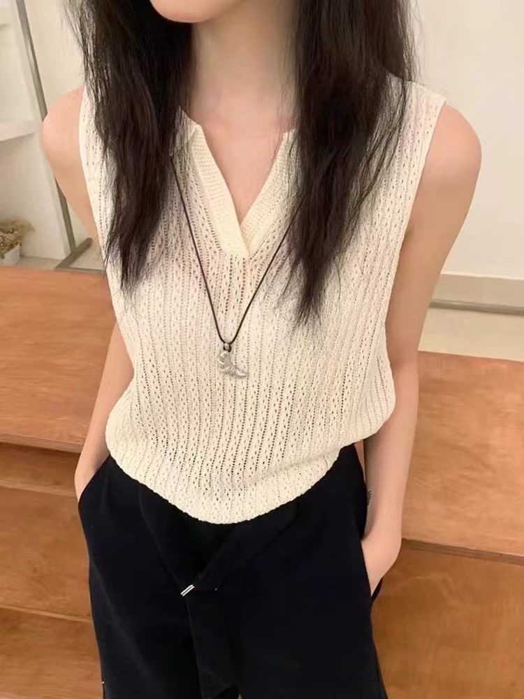 디자인 센스 작은 v 폴로 칼라 홀로우 아웃 아마 민소매 니트 스웨터 조끼 여성 여름 얇은 스타일 고급 센스 쇼트 스타일 맨위